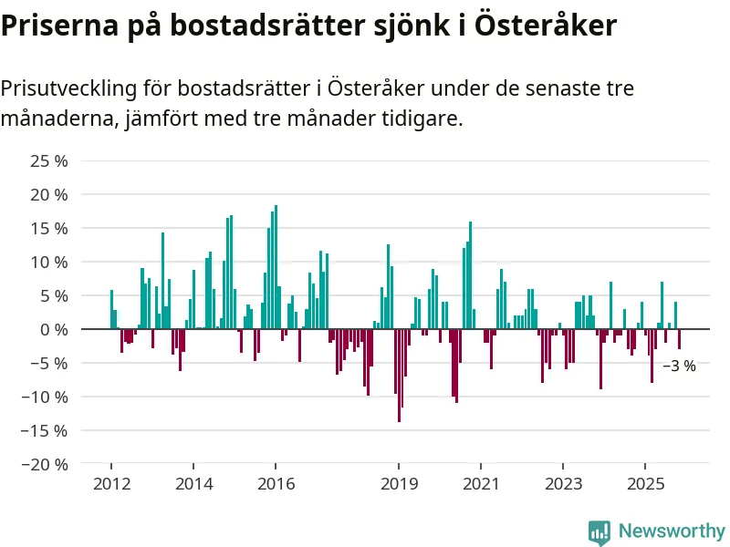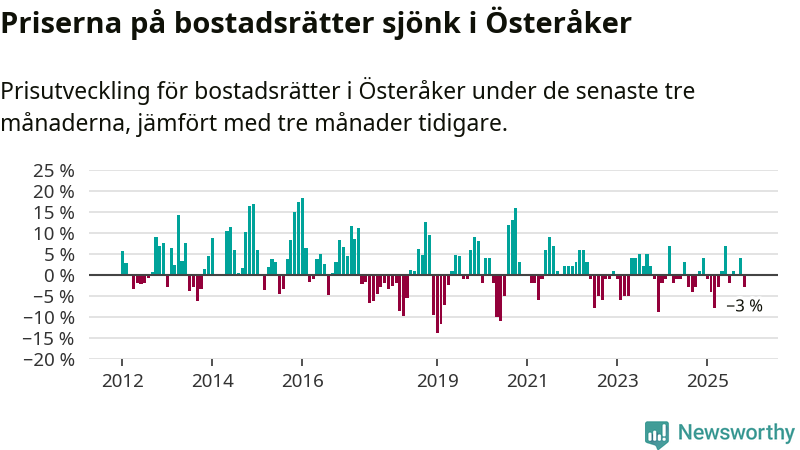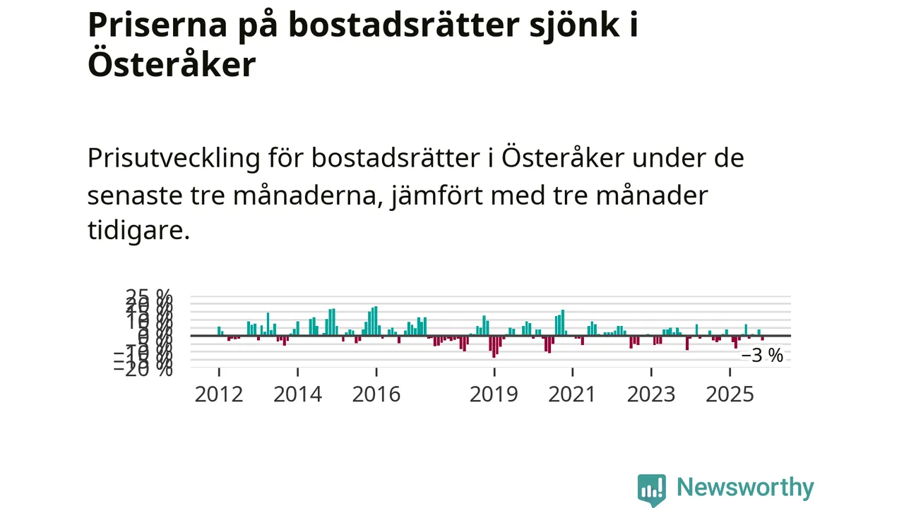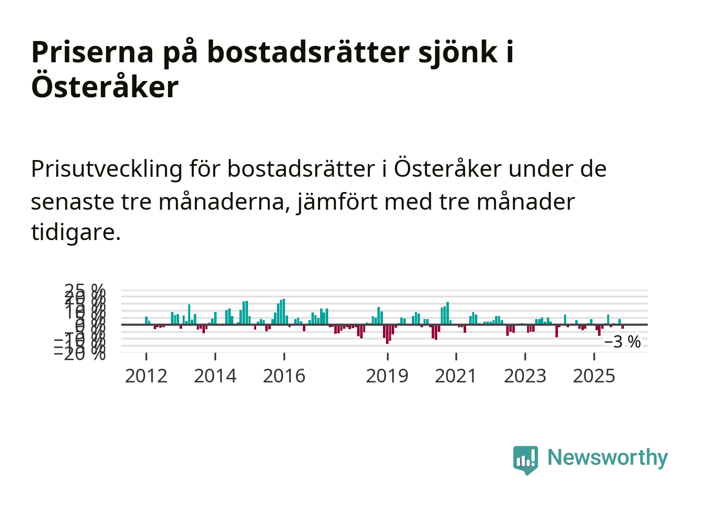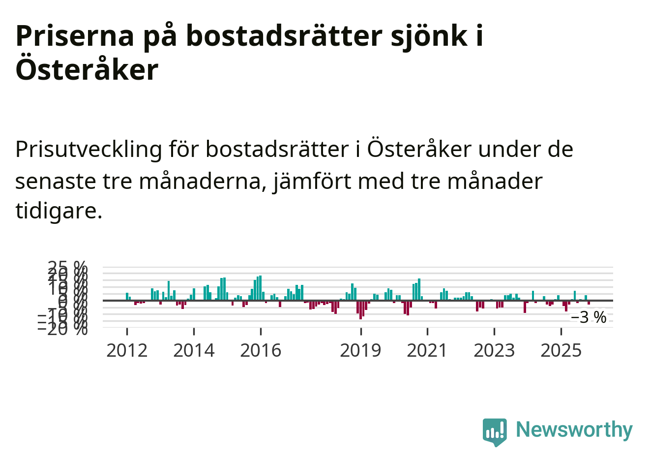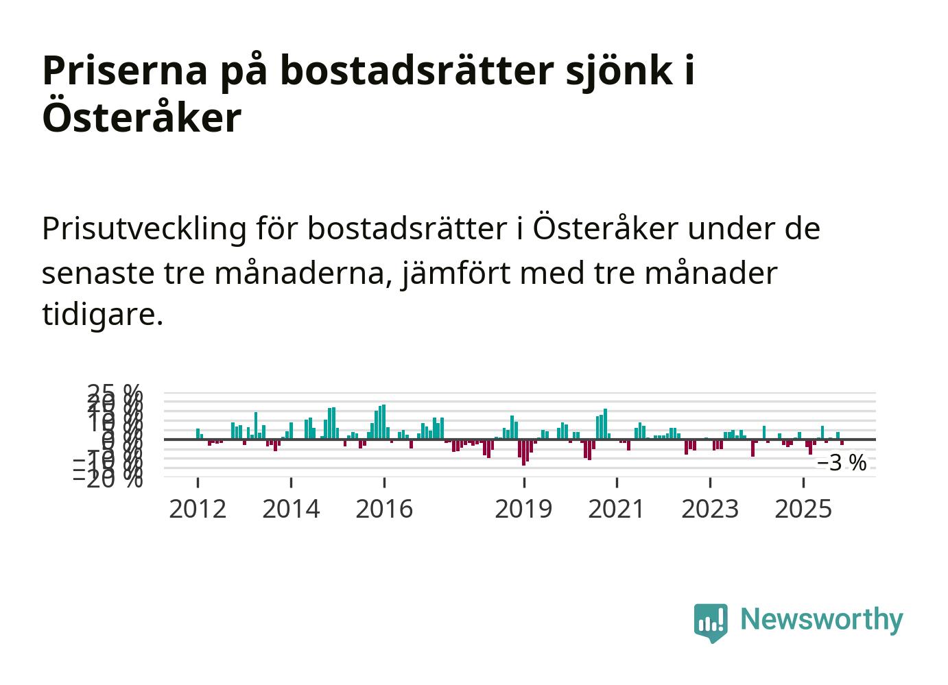 Statistiken visar även på en prisnedgång i Österåkers kommun. Medelpriset på försäljningarna av bostadsrätter i kommunen var 3 procent lägre än för tre månader sedan. I hela Stockholms län däremot ökar priserna på bostadsrätter. I hela länet noterades en prisuppgång på 6 procent.