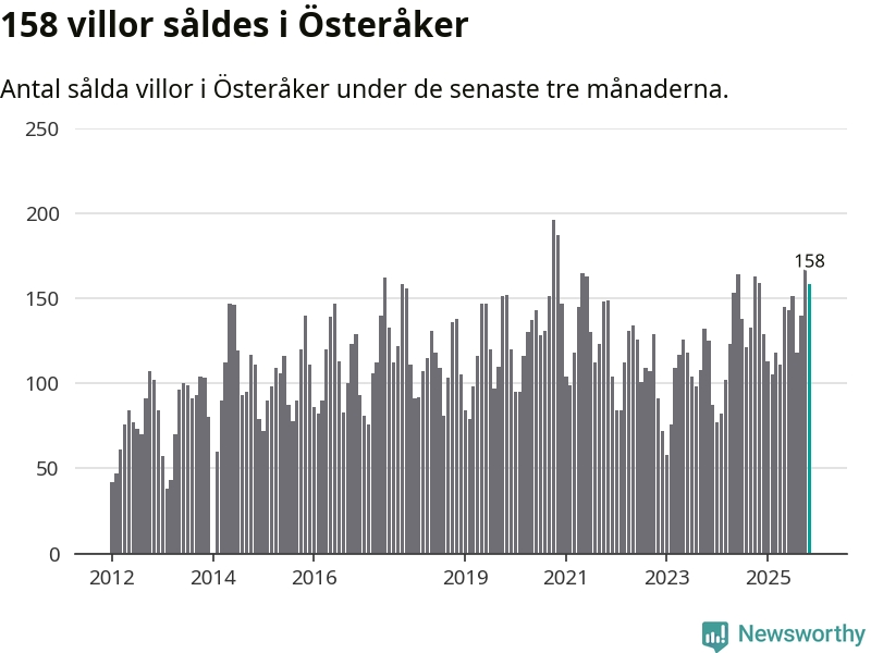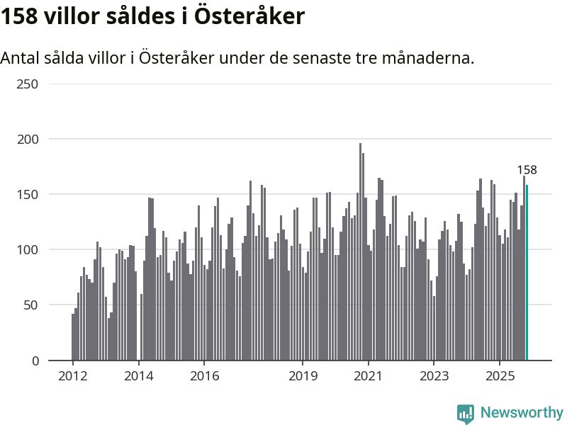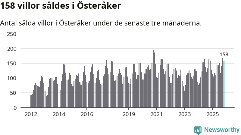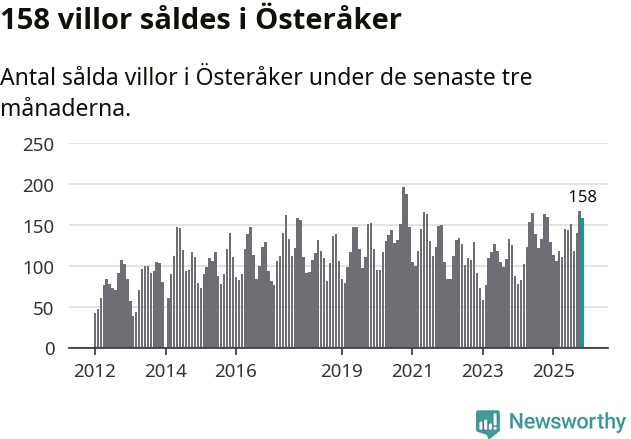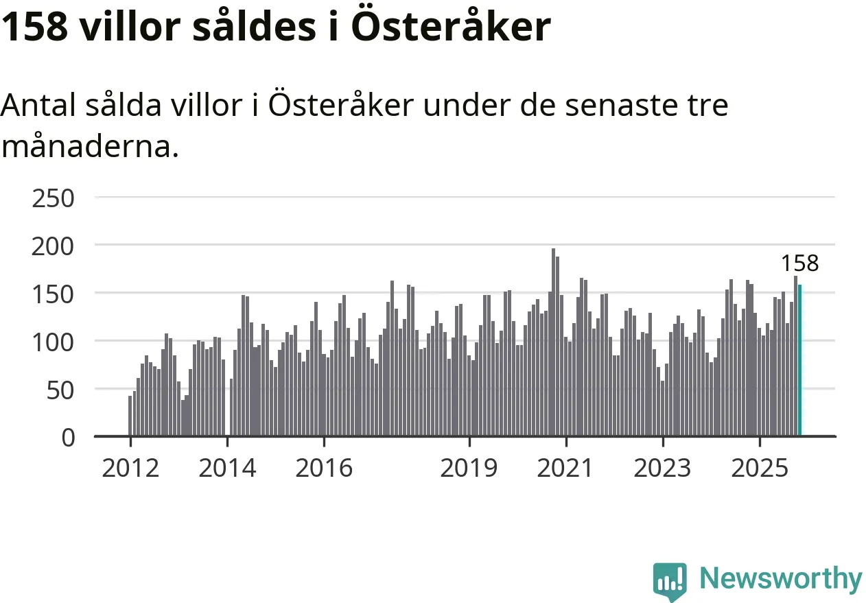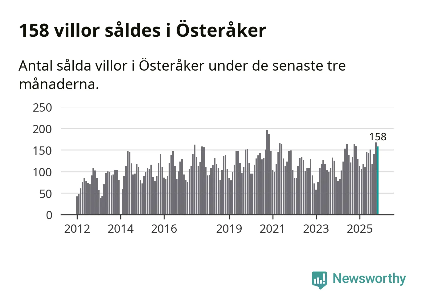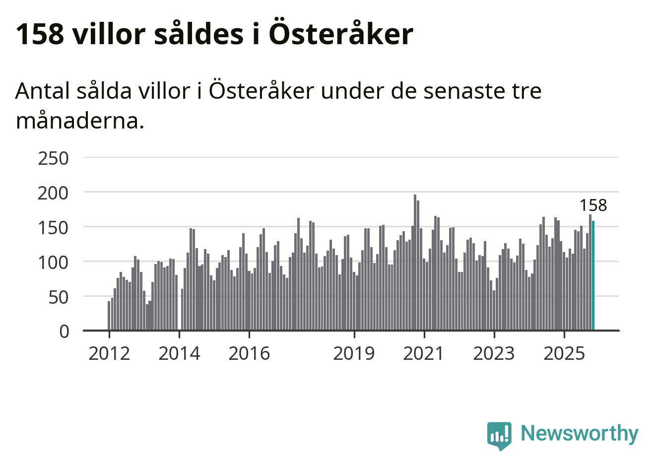Sammanlagt såldes 158 villor i Österåkers kommun mellan september och november till ett genomsnittligt pris på 6,0 miljoner kronor. I fjol gjordes 159 affärer vid den här tiden på året.
