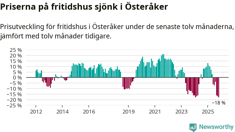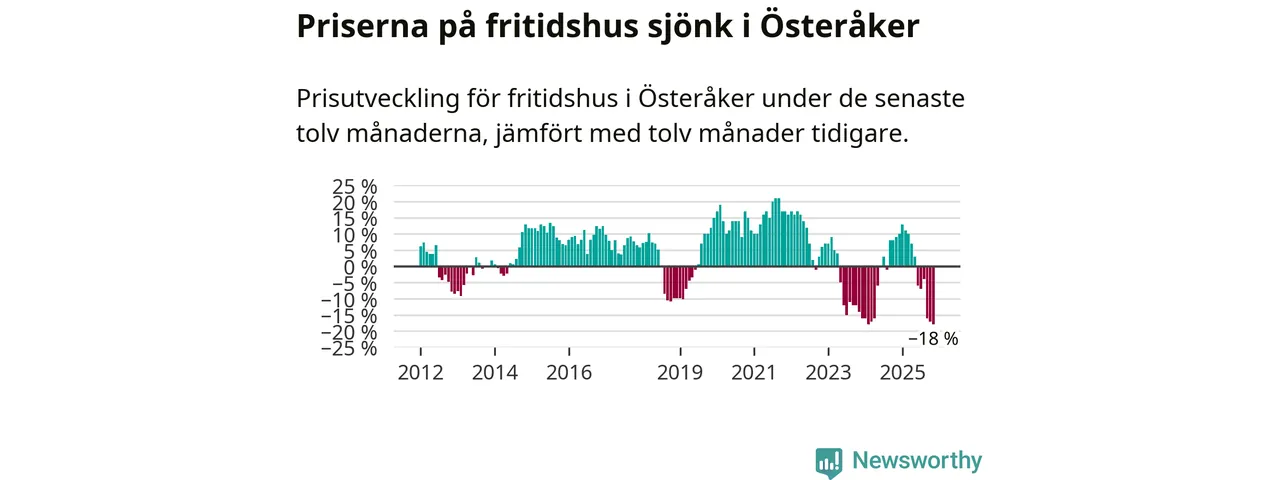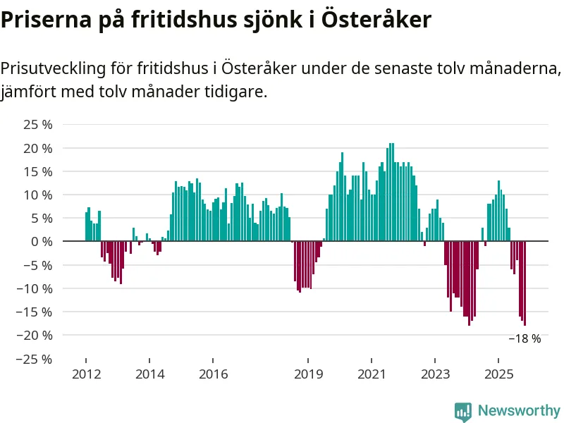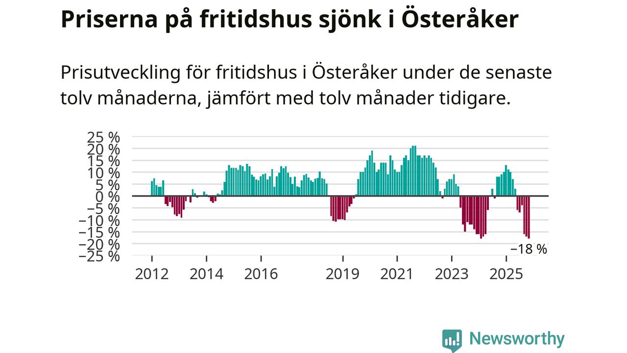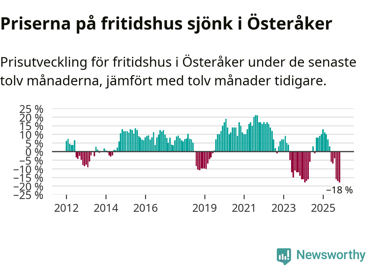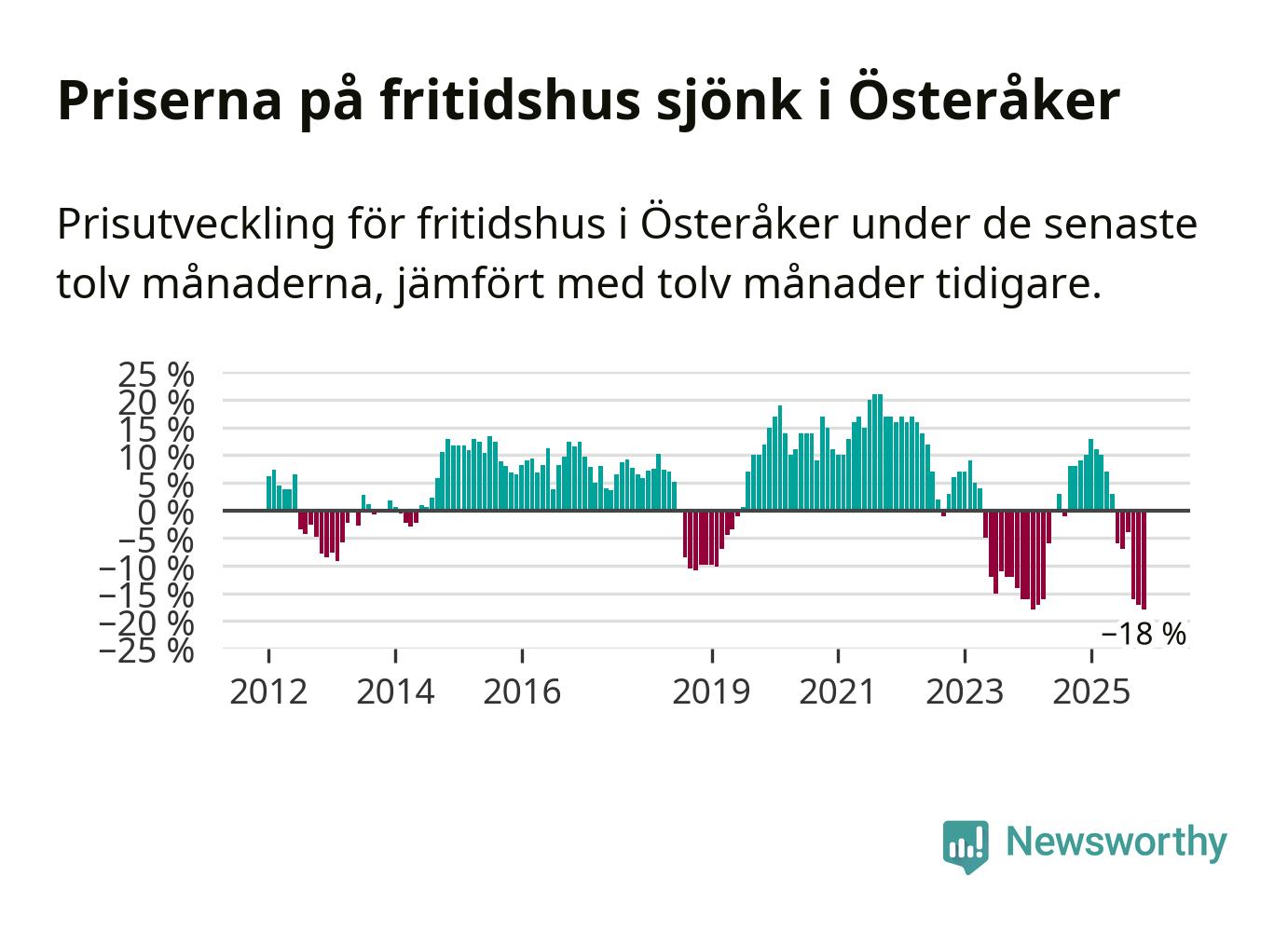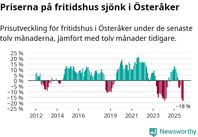 Priserna på fritidshus har gått ner i Österåkers kommun. Medelpriset på försäljningarna under de senaste tolv månaderna visar på en nedgång med 18 procent.