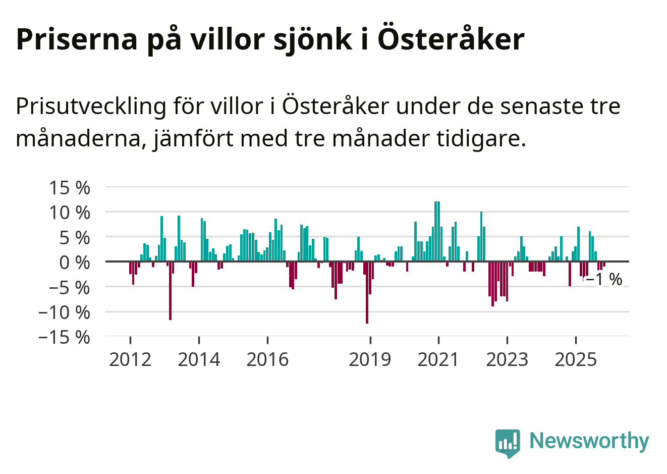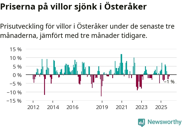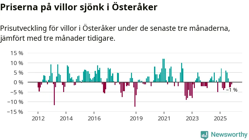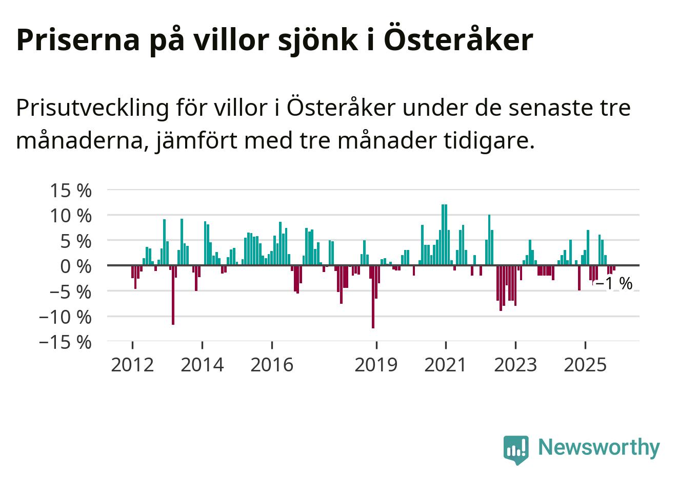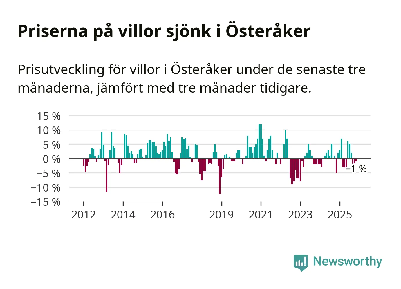 Villapriserna har gått ner i Österåkers kommun. Medelpriset på försäljningarna under de senaste tre månaderna visar på en nedgång med 1 procent.