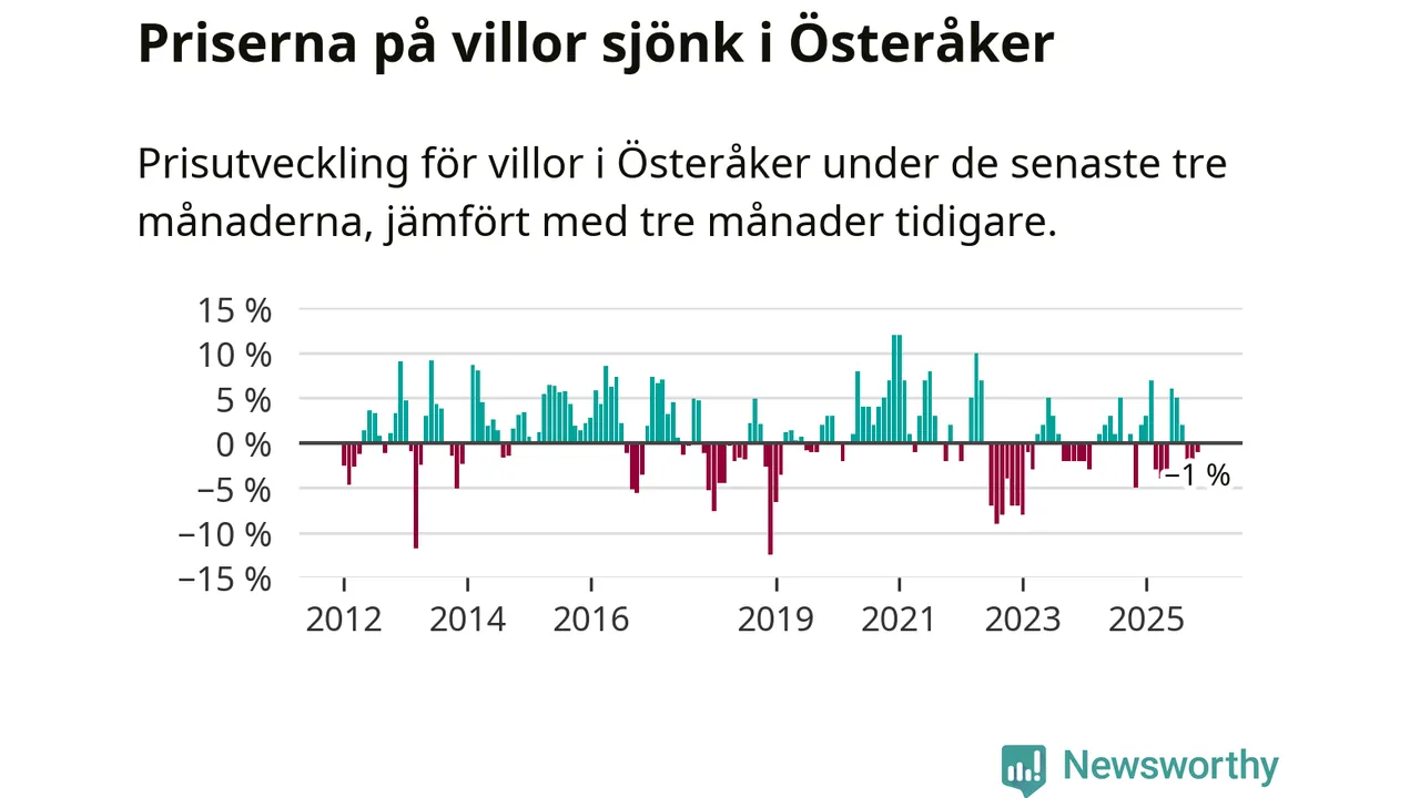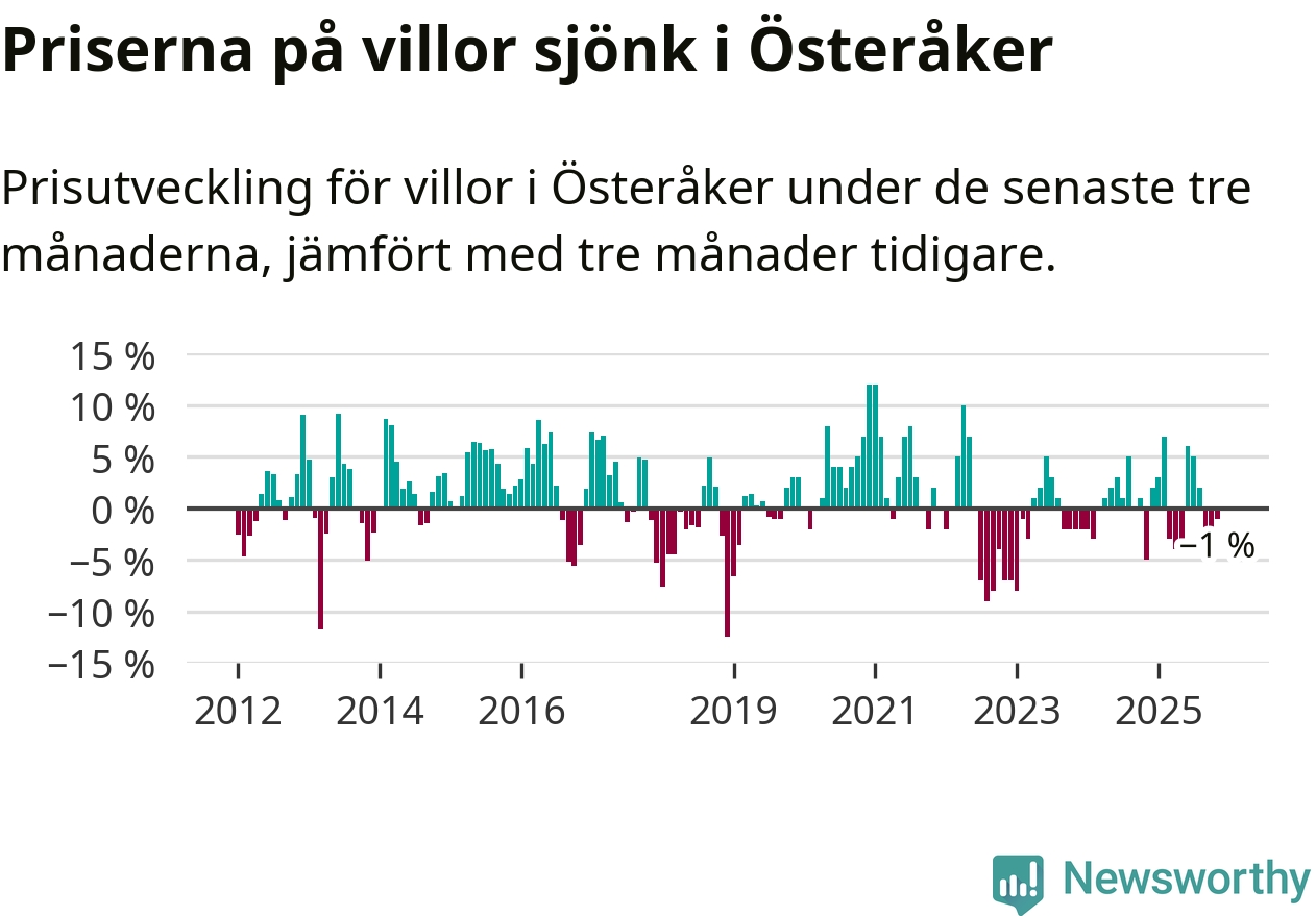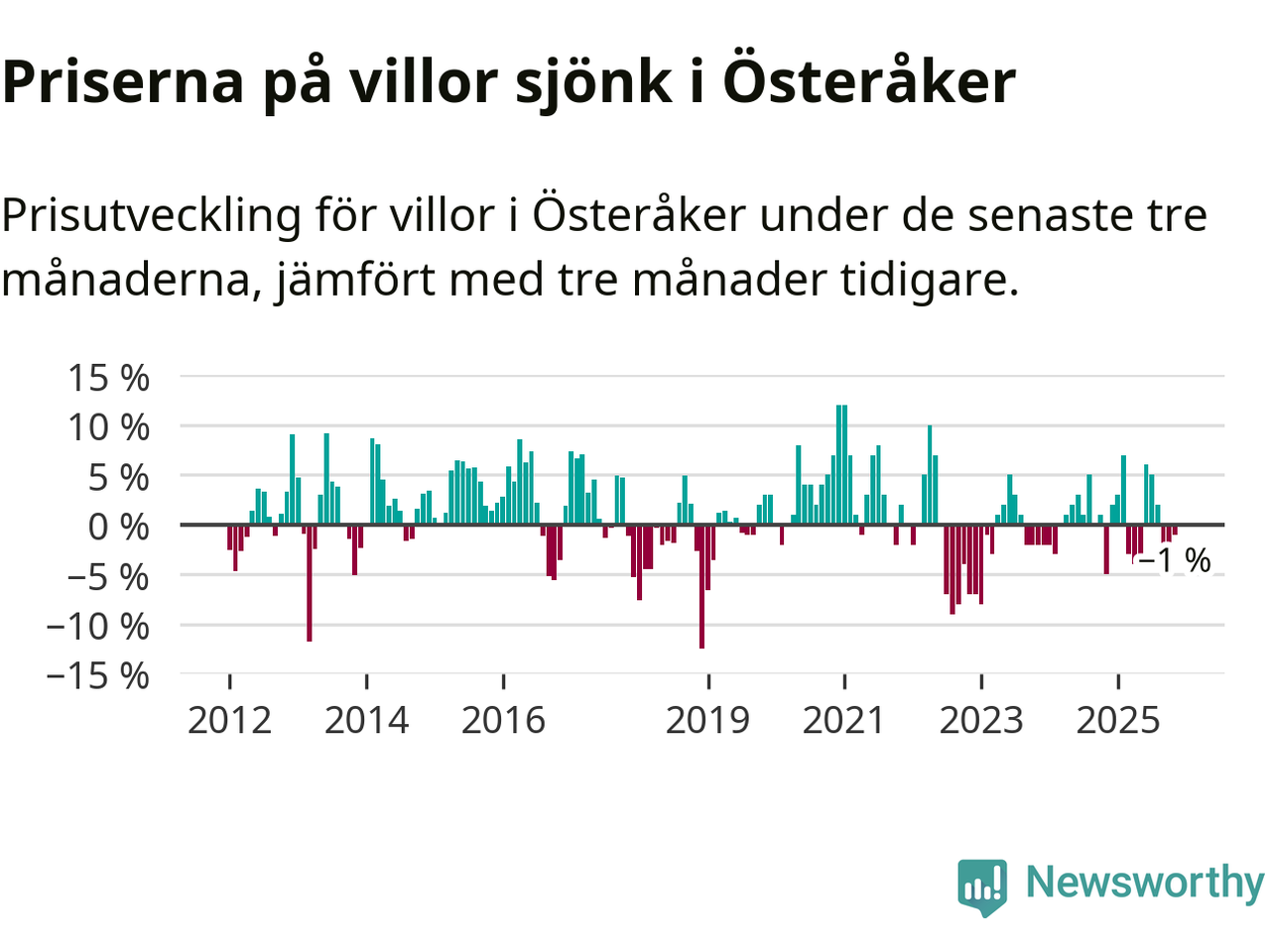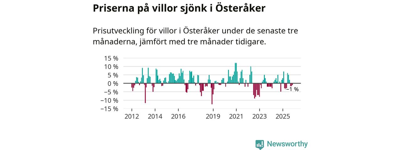 Villapriserna har gått ner i Österåkers kommun. Medelpriset på försäljningarna under de senaste tre månaderna visar på en nedgång med 1 procent.