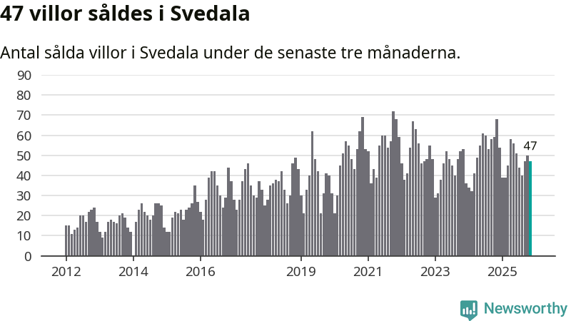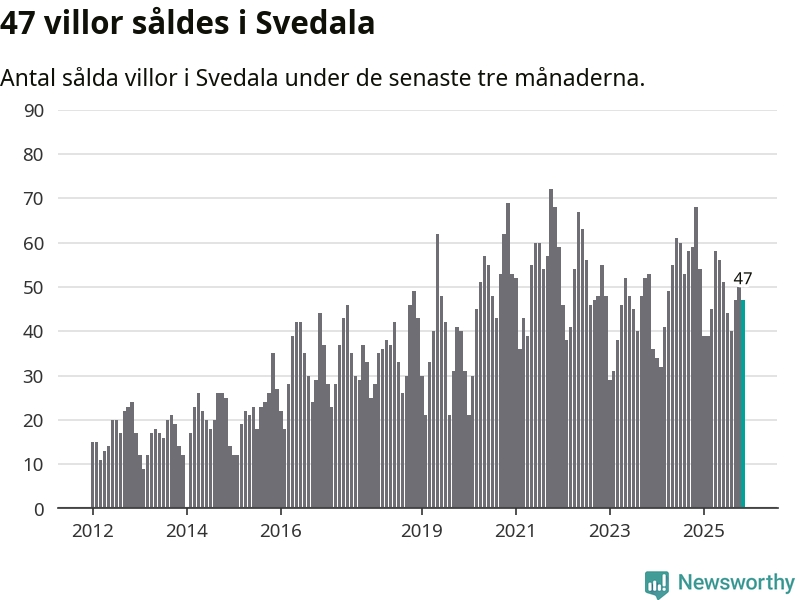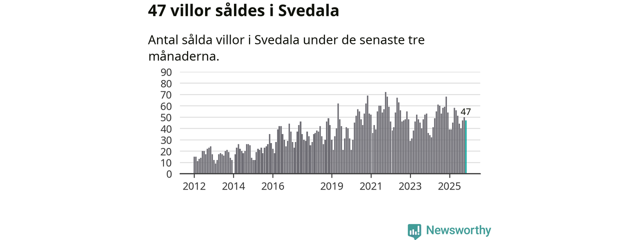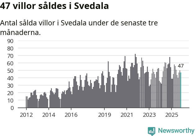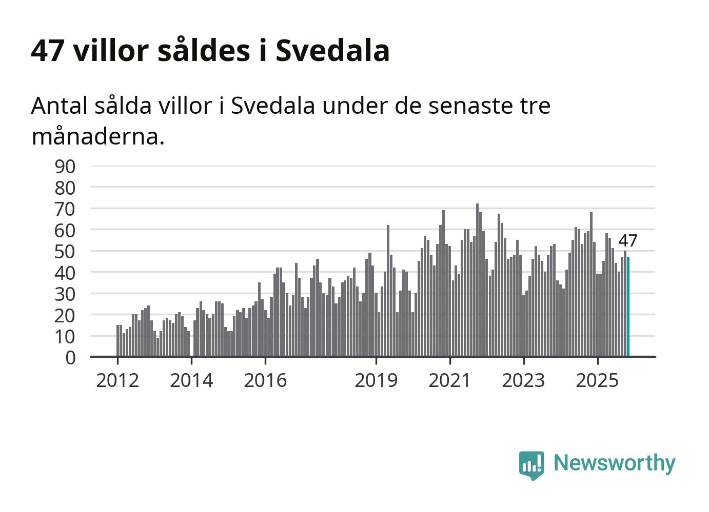 Mellan september och november såldes 47 villor i Svedala kommun. Det är relativt få sett till aktiviteten på bostadsmarknaden i kommunen under de senaste tolv månaderna, samt det historiska snittet för den här tiden på året.