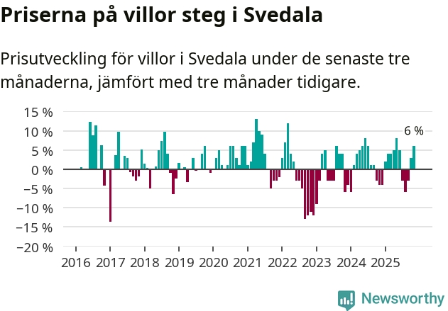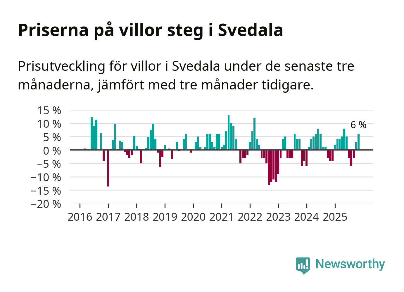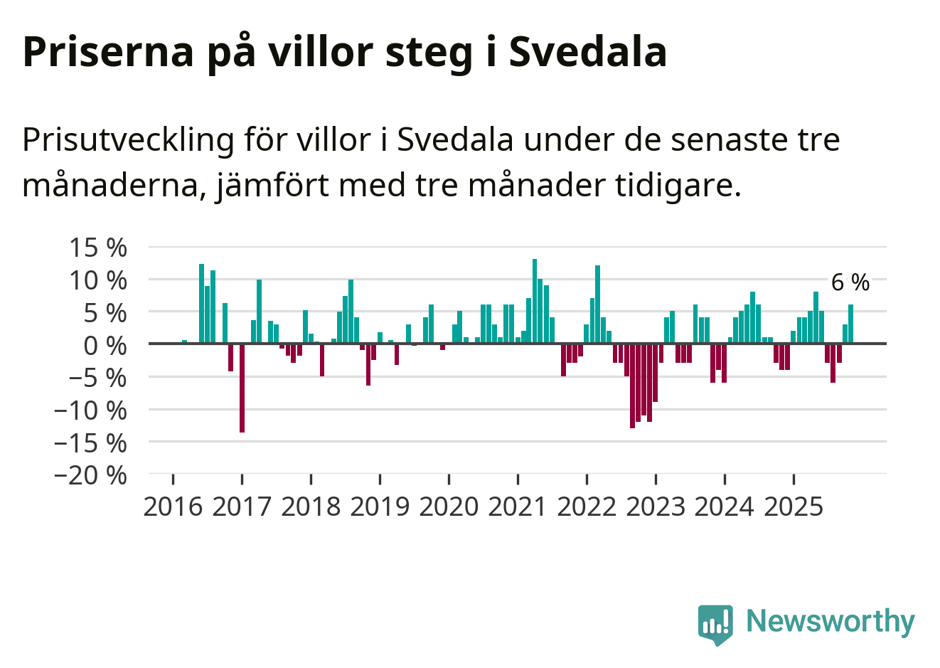 Statistiken visar även på en kännbar prisuppgång i Svedala kommun. Medelpriset på försäljningarna av villor i kommunen var 6 procent högre än för tre månader sedan. I hela Skåne däremot sjunker villapriserna. I hela länet noterades en prisnedgång på 2 procent.