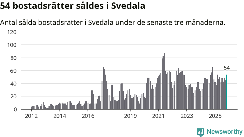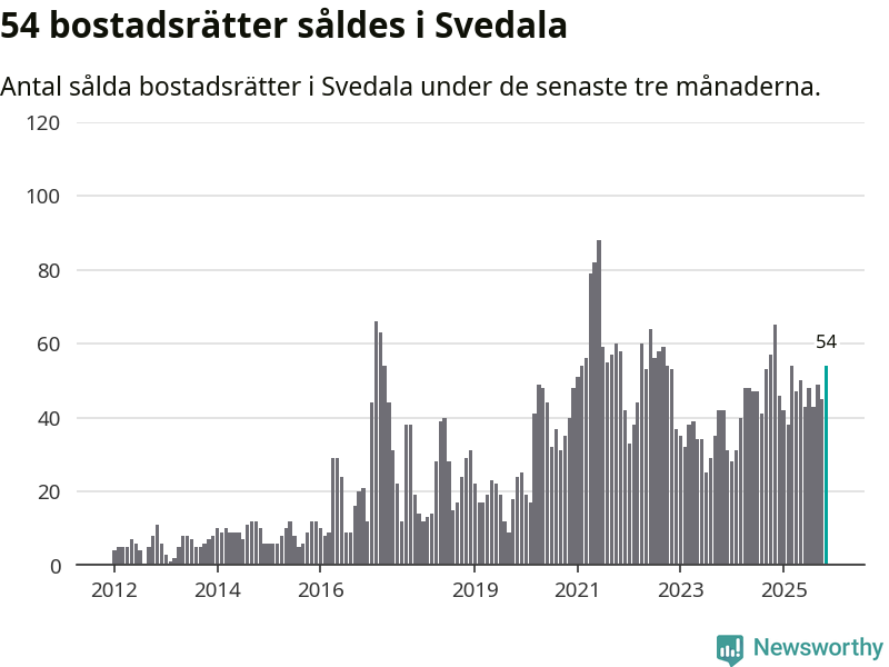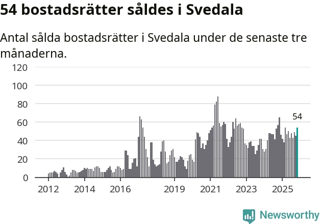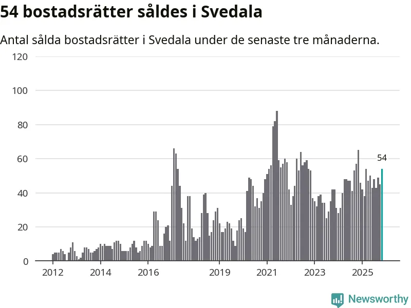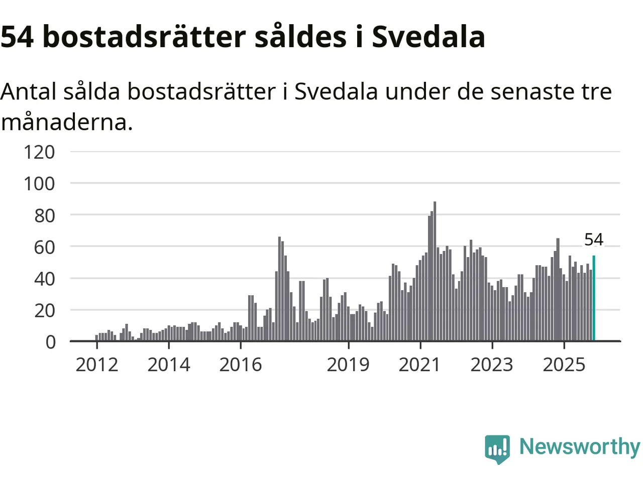 Sammanlagt såldes 54 bostadsrätter i Svedala kommun mellan september och november till ett genomsnittligt pris på 2,0 miljoner kronor. I fjol gjordes 65 affärer vid den här tiden på året.