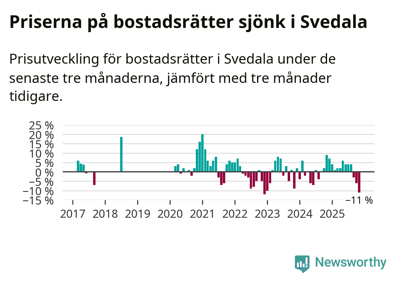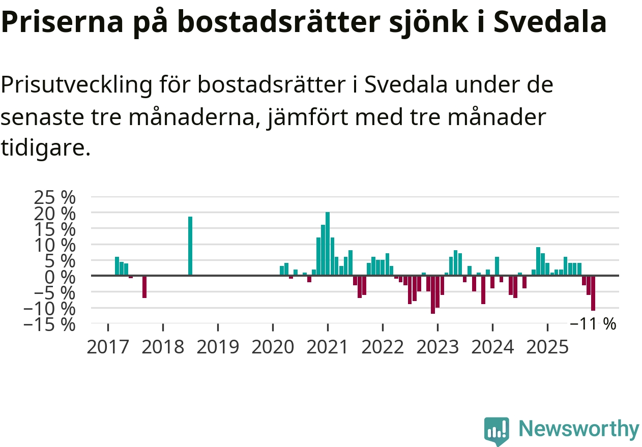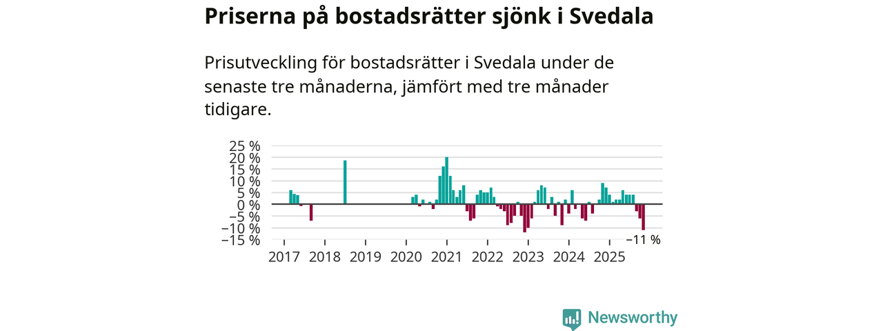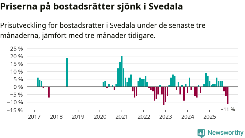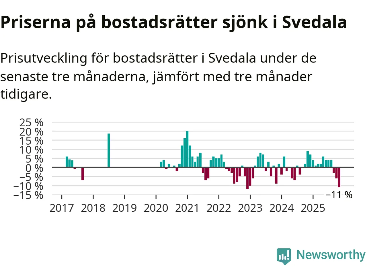 Priserna på bostadsrätter sjönk mellan september och november med 11 procent i Svedala kommun. Det är en betydande nedgång jämfört med det gångna året då priserna i snitt ökat med 1 procent.