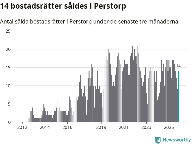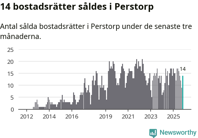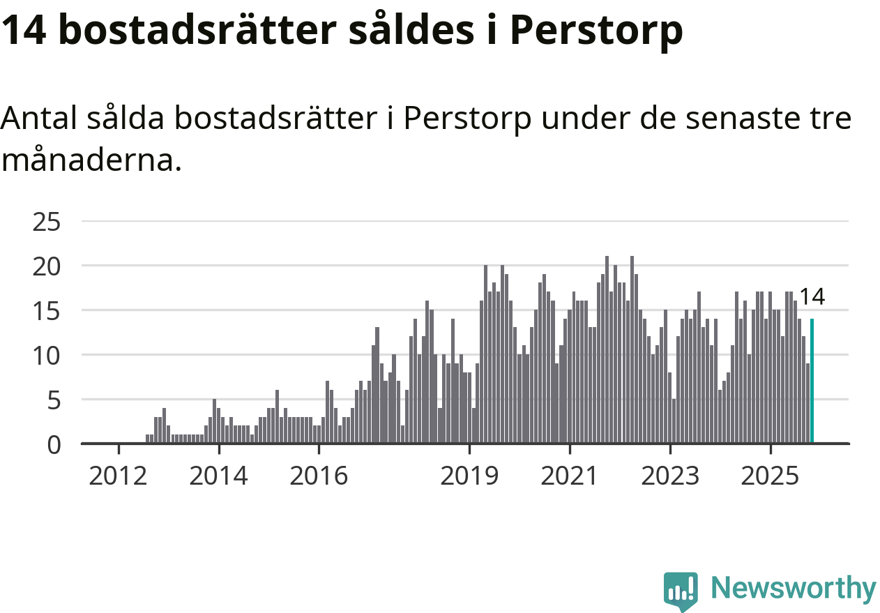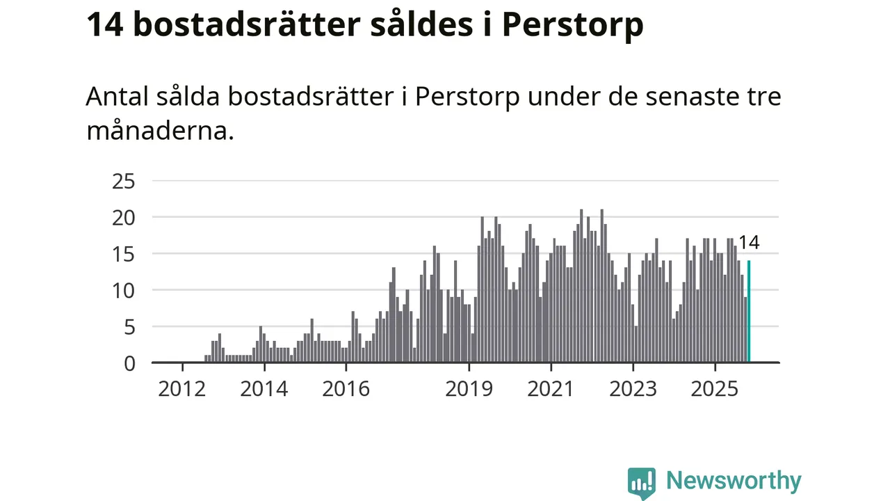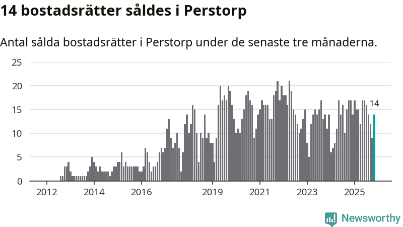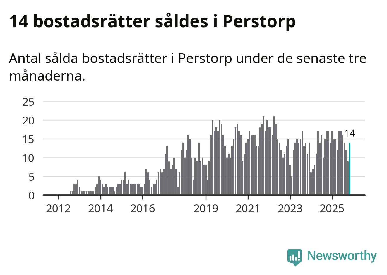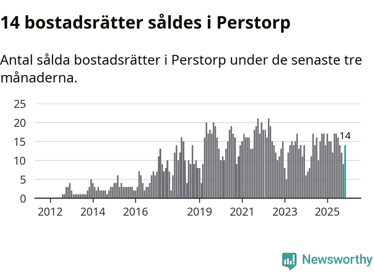 Mellan september och november gjordes sammanlagt 14 affärer med bostadsrätter i Perstorps kommun. Det kan jämföras med 17 vid motsvarande tid i fjol.