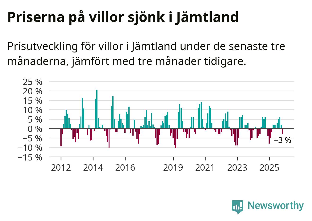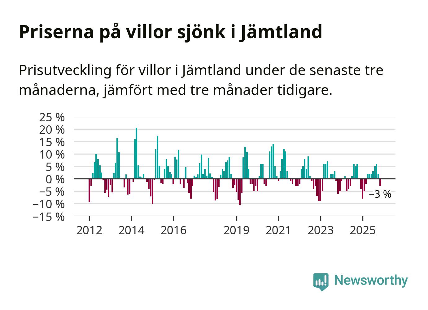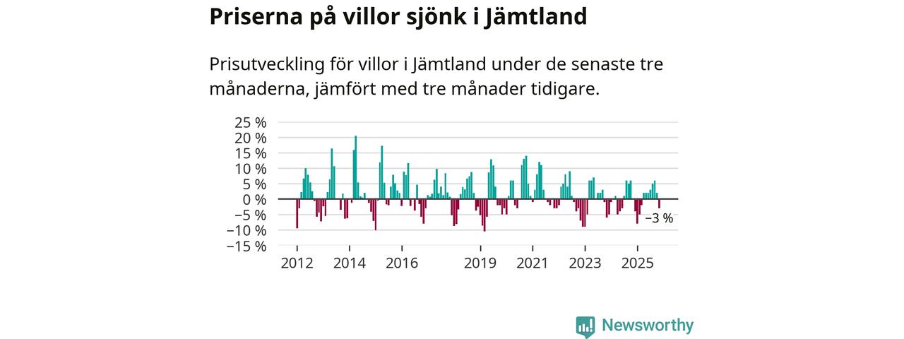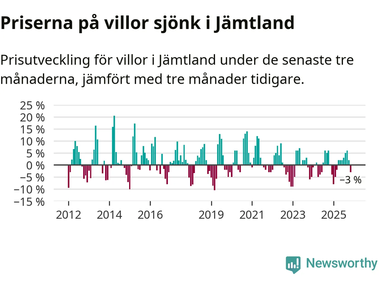 Statistiken visar även på en prisnedgång i Jämtlands län. Medelpriset på försäljningarna av villor i länet var 3 procent lägre än för tre månader sedan. Även i hela Sverige sjunker villapriserna. I hela riket noterades en prisnedgång på 2 procent.