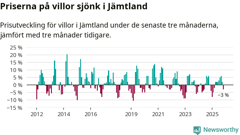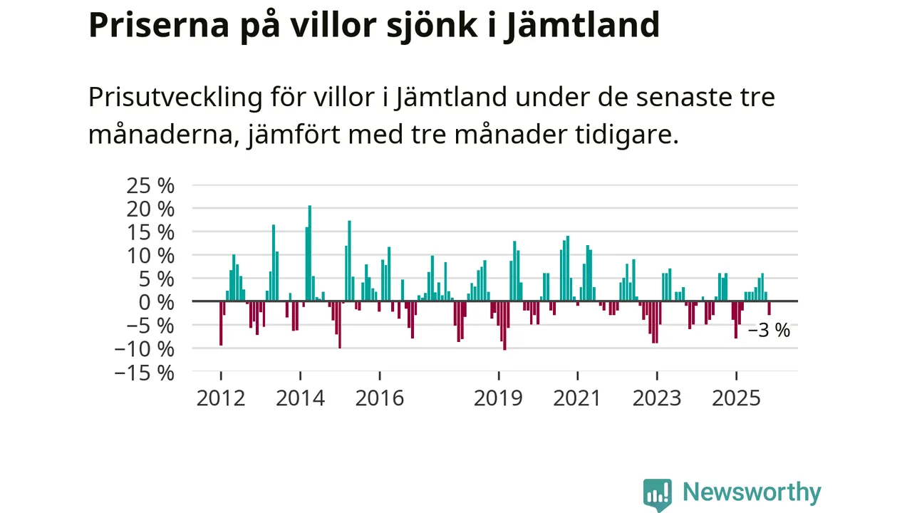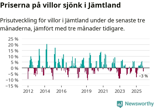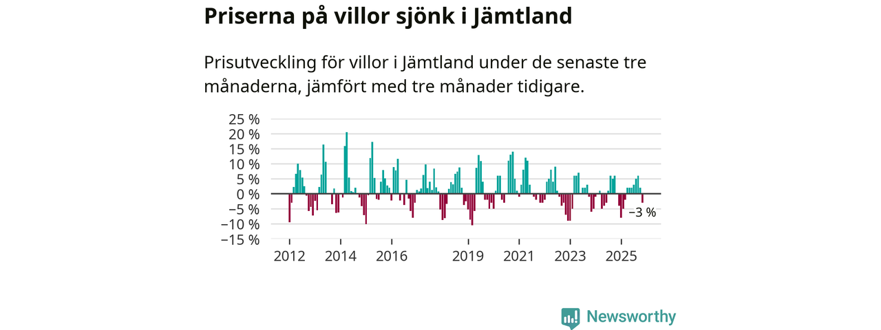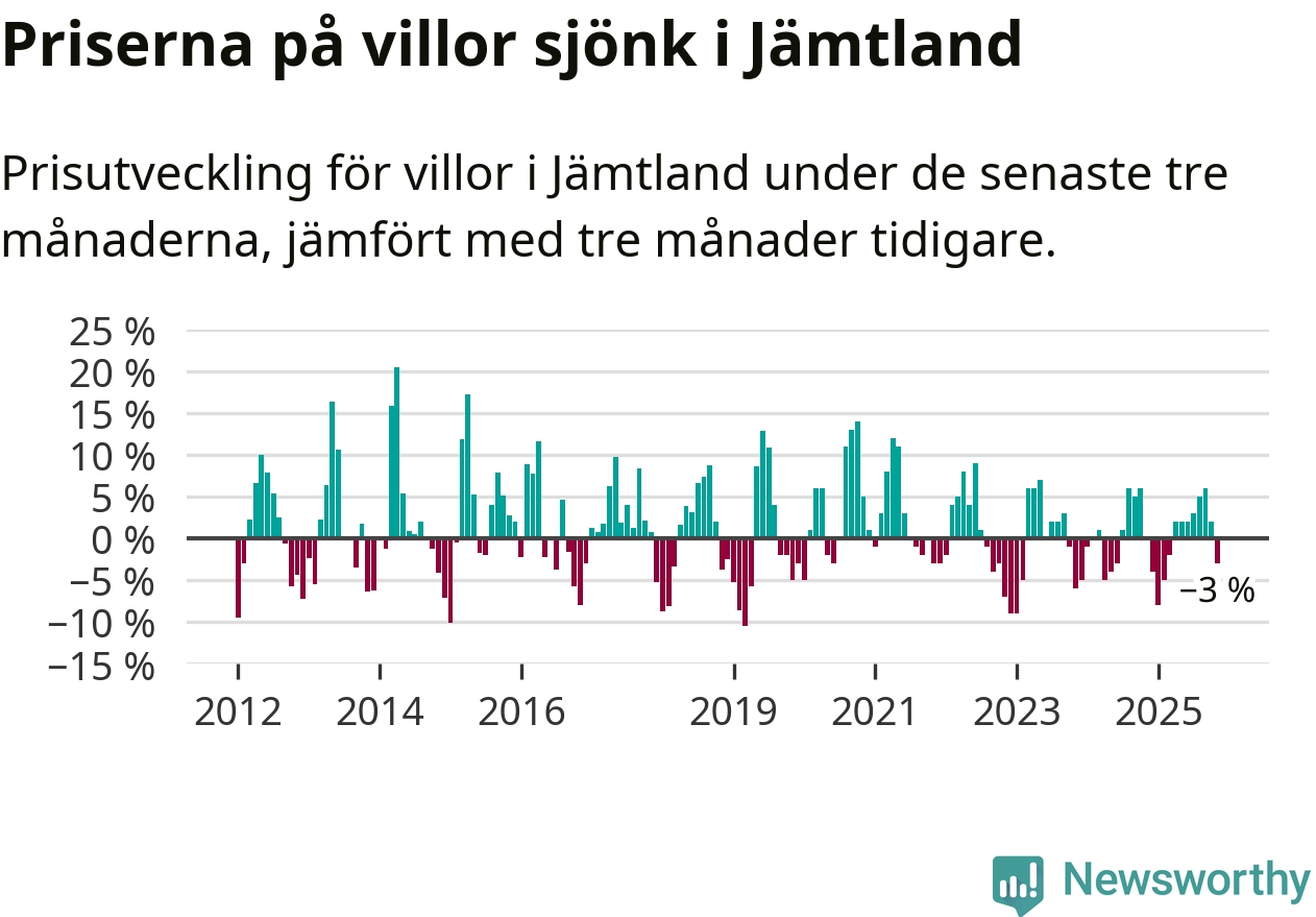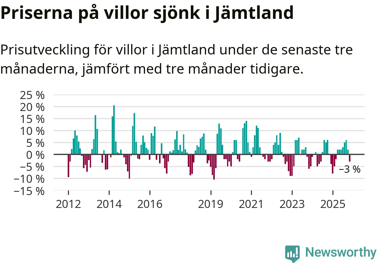 Statistiken visar även på en prisnedgång i Jämtlands län. Medelpriset på försäljningarna av villor i länet var 3 procent lägre än för tre månader sedan. Även i hela Sverige sjunker villapriserna. I hela riket noterades en prisnedgång på 2 procent.