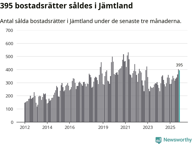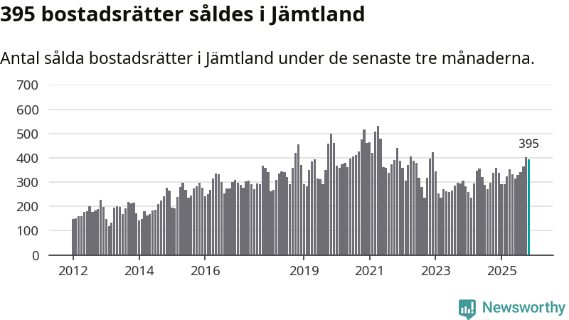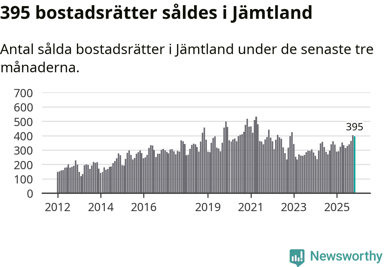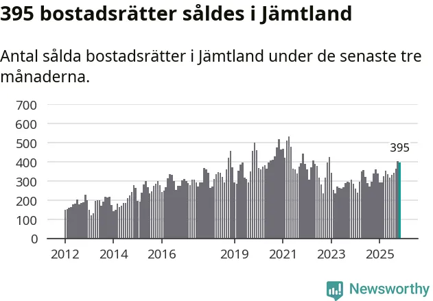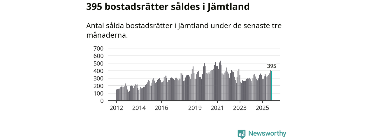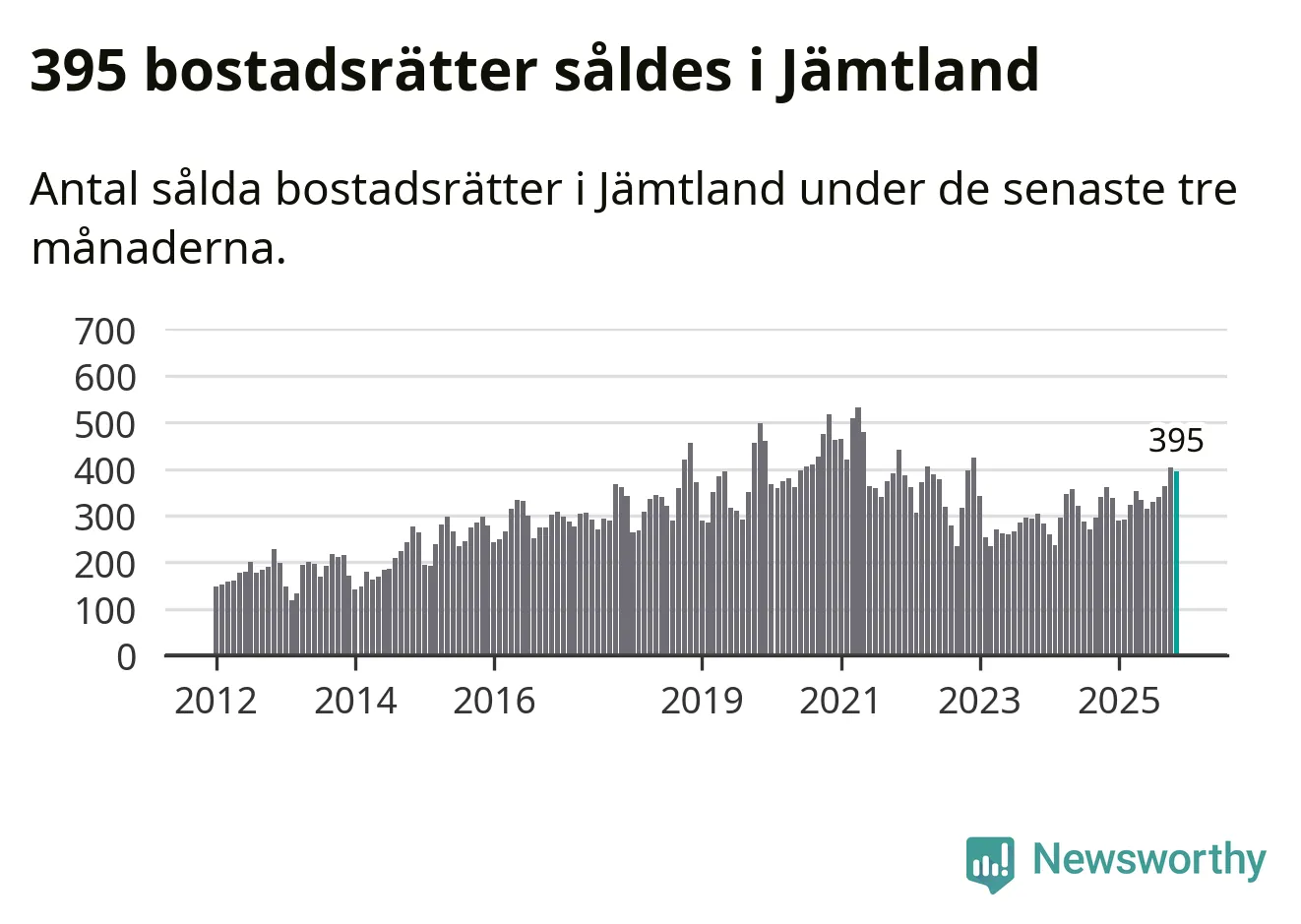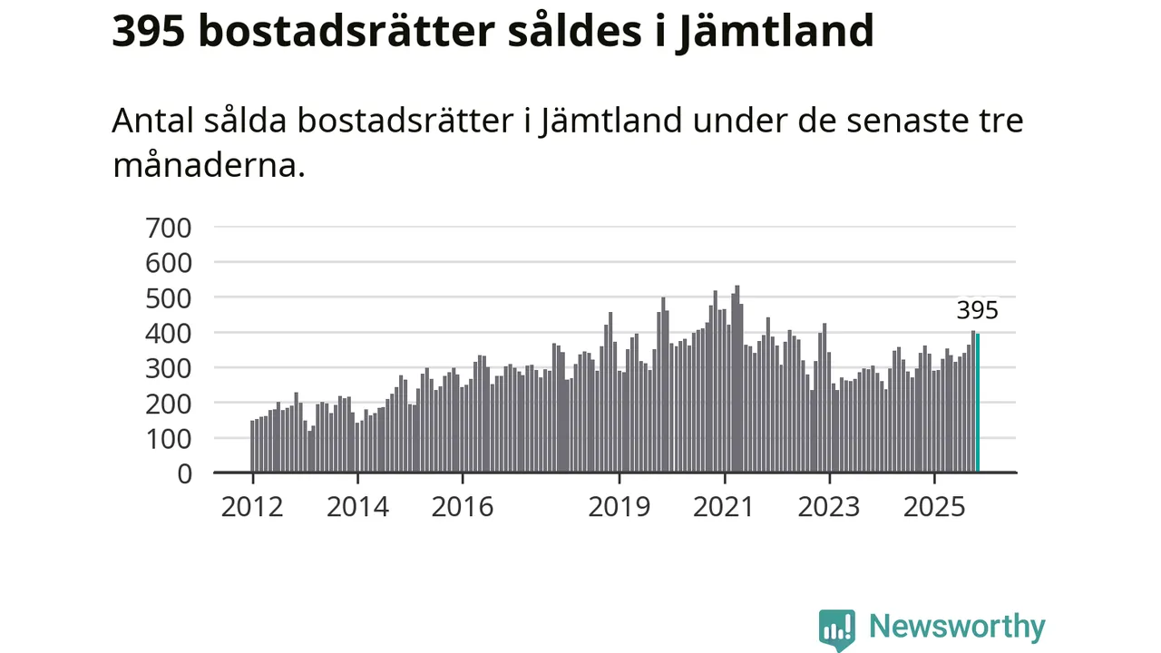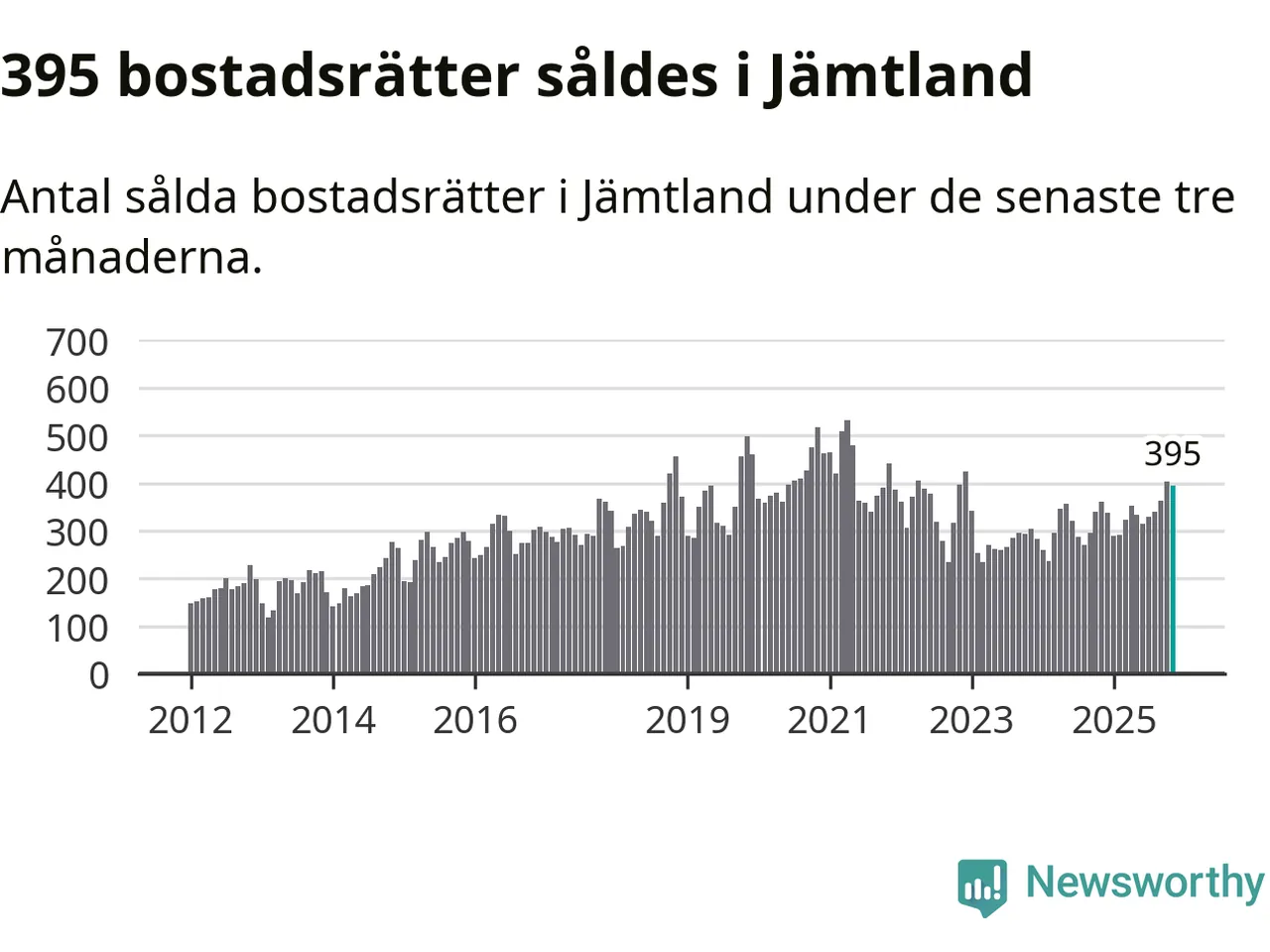 Sammanlagt såldes 395 bostadsrätter i Jämtlands län mellan september och november till ett genomsnittligt pris på 2,1 miljoner kronor. I fjol gjordes 360 affärer vid den här tiden på året.