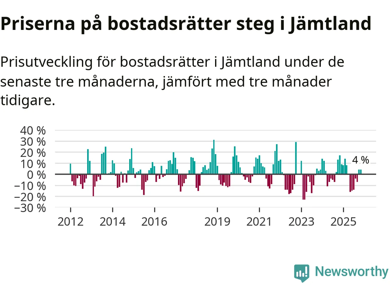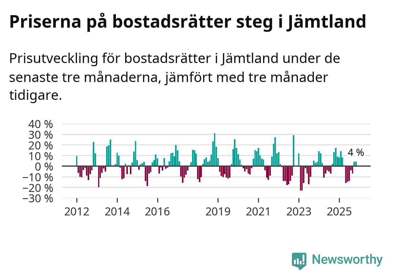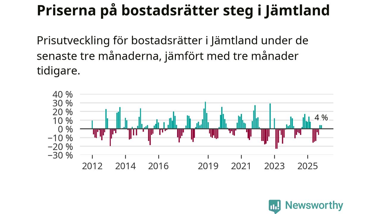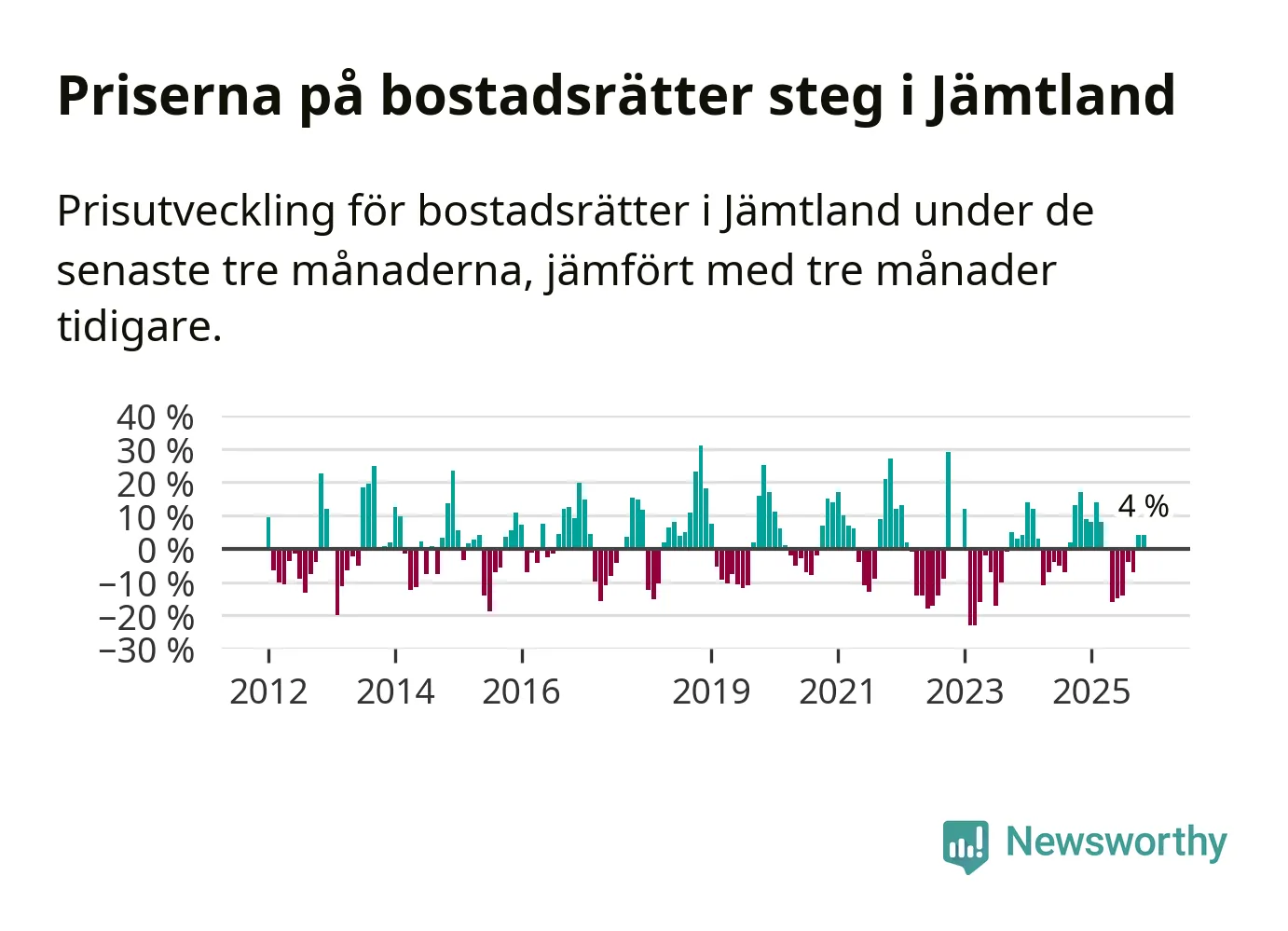 Priserna på bostadsrätter har gått upp i Jämtlands län. Medelpriset på försäljningarna under de senaste tre månaderna visar på en uppgång med 4 procent.