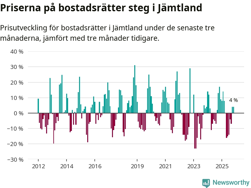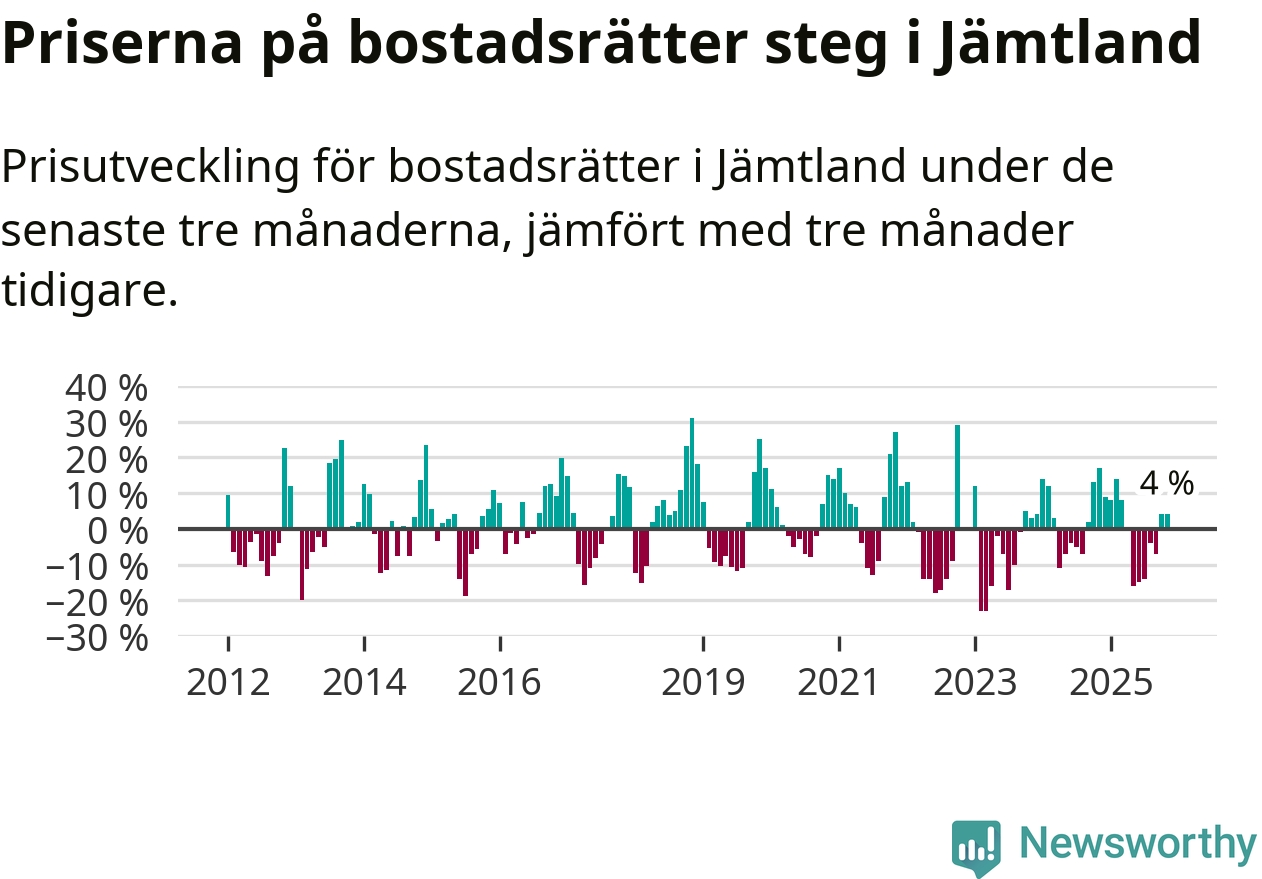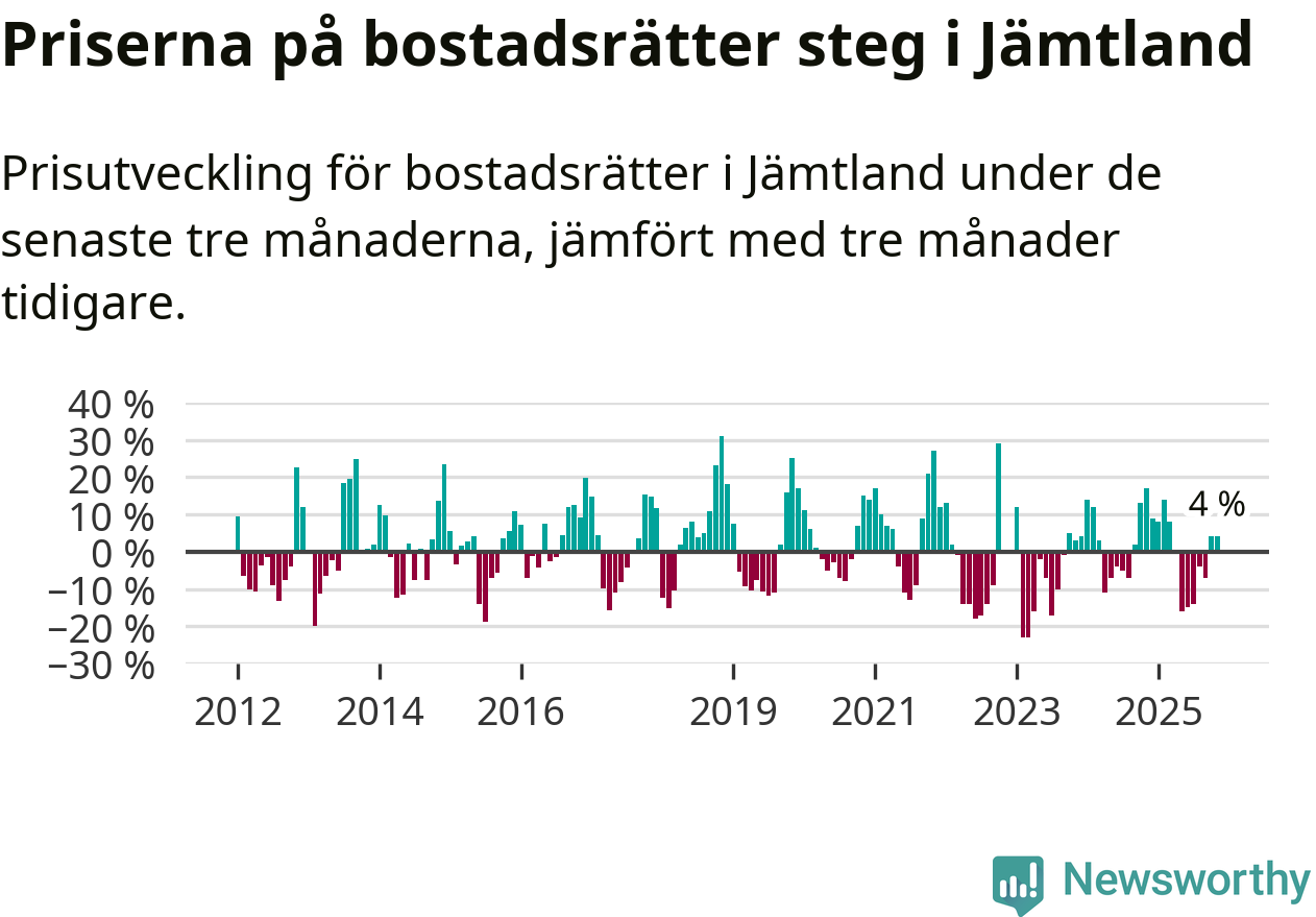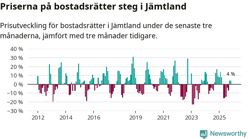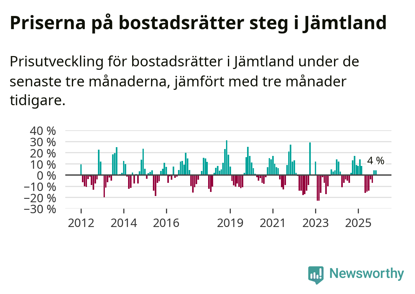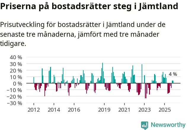 Priserna på bostadsrätter har gått upp i Jämtlands län. Medelpriset på försäljningarna under de senaste tre månaderna visar på en uppgång med 4 procent.