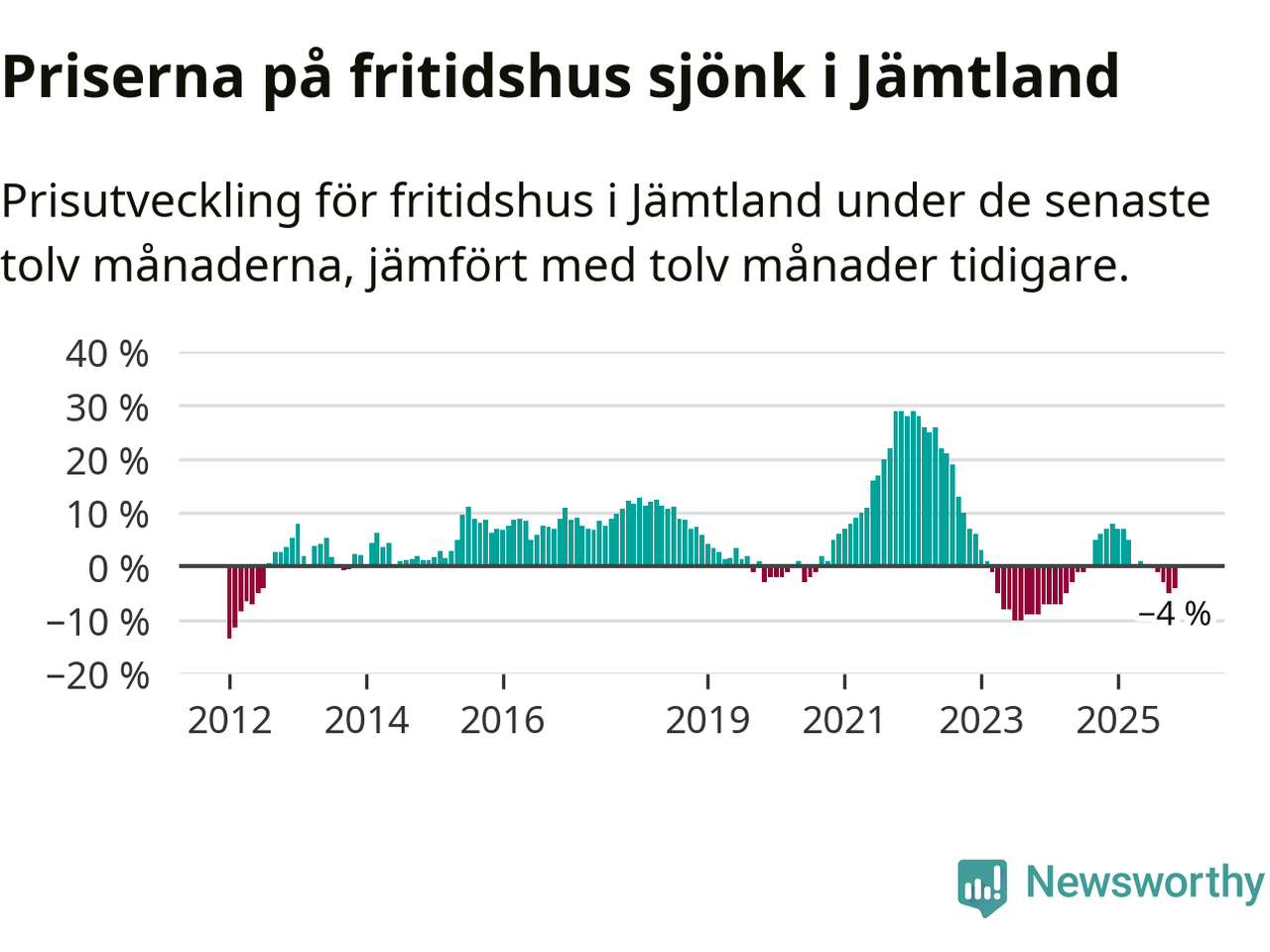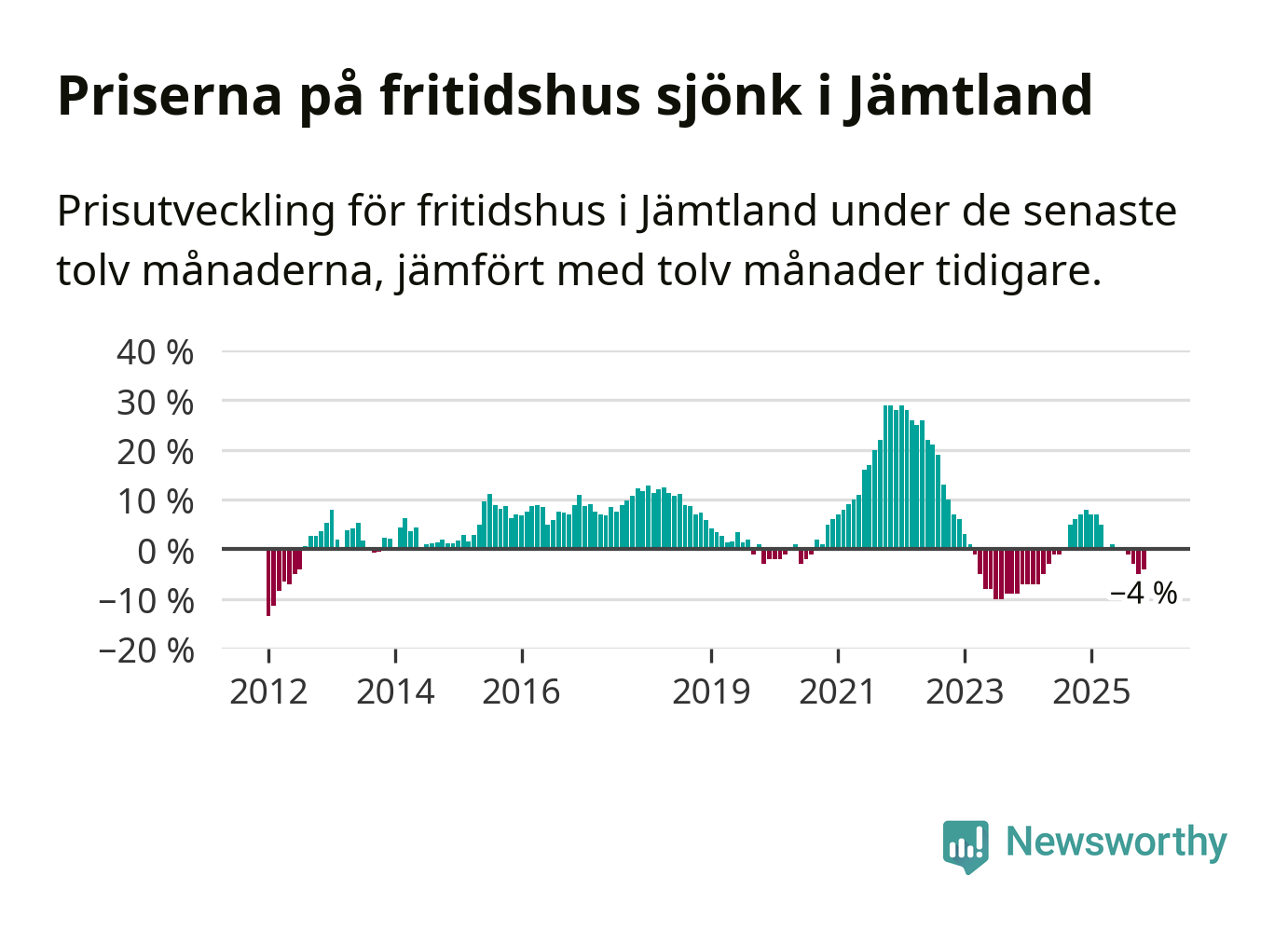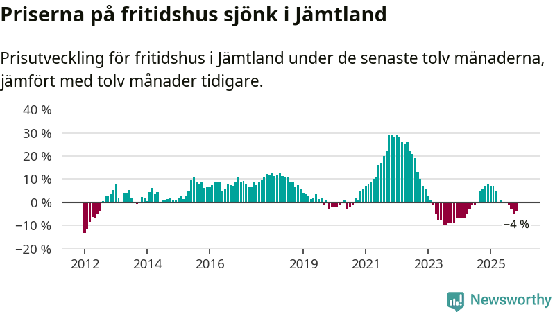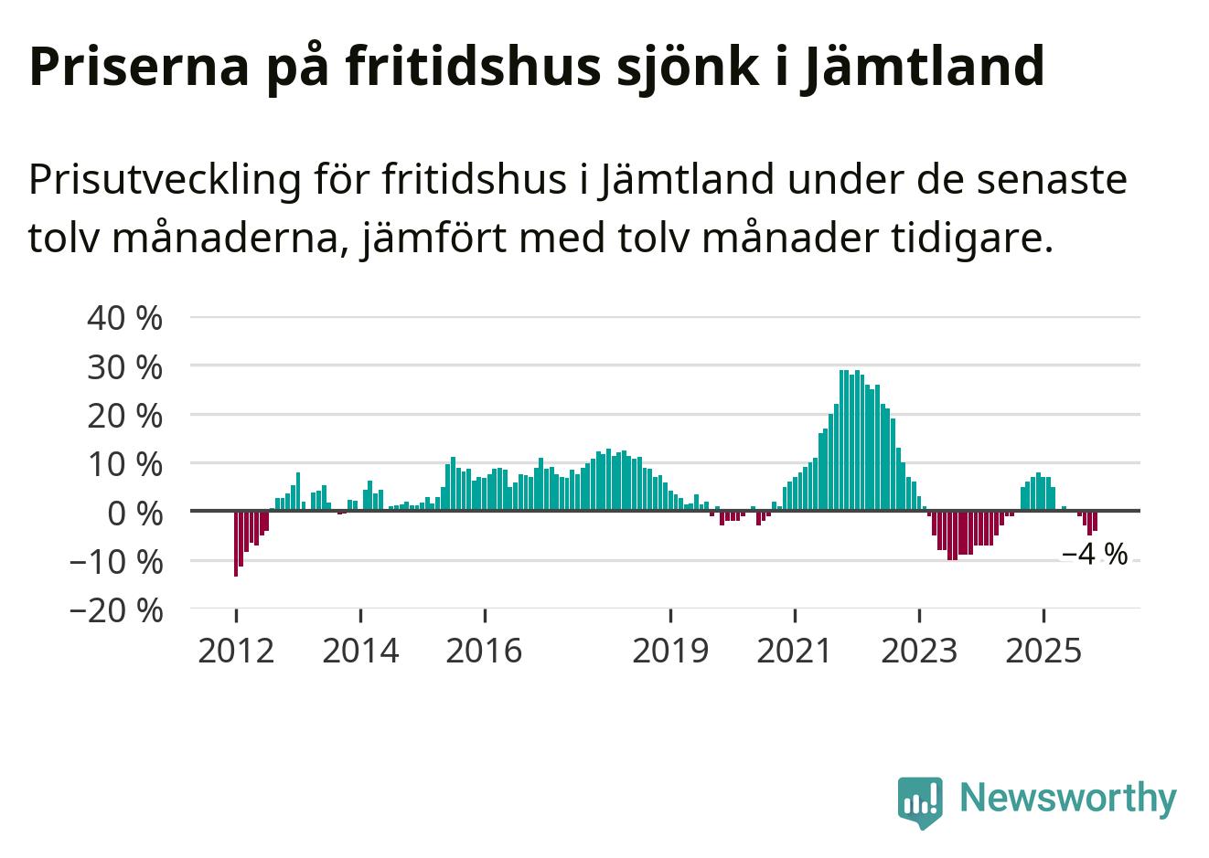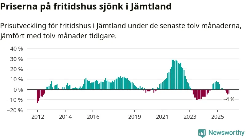 I Jämtlands län som helhet går priserna på fritidshus ner med 4 procent. Även i hela Sverige sjunker priserna på fritidshus. I hela riket noterades en prisnedgång på 3 procent.
