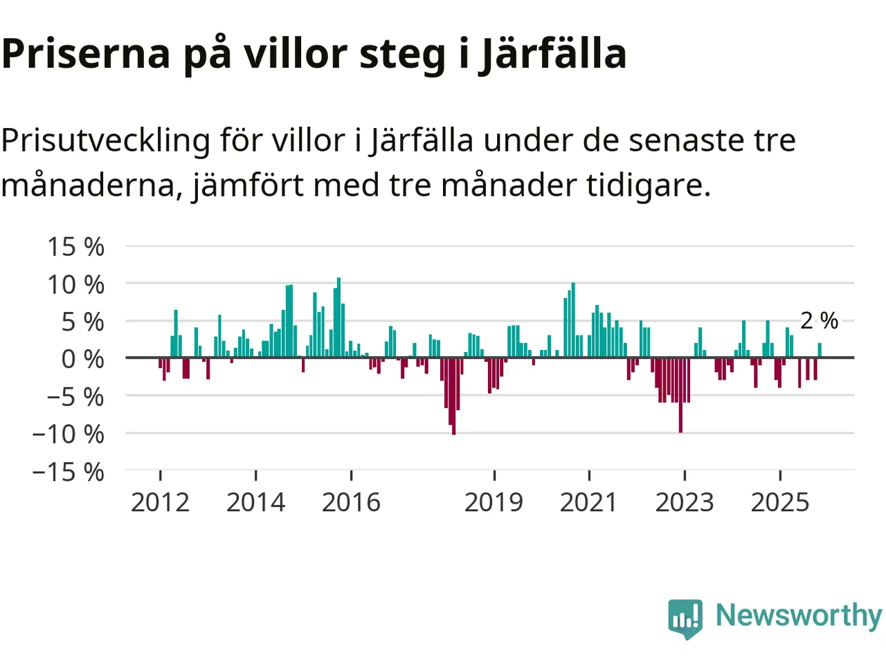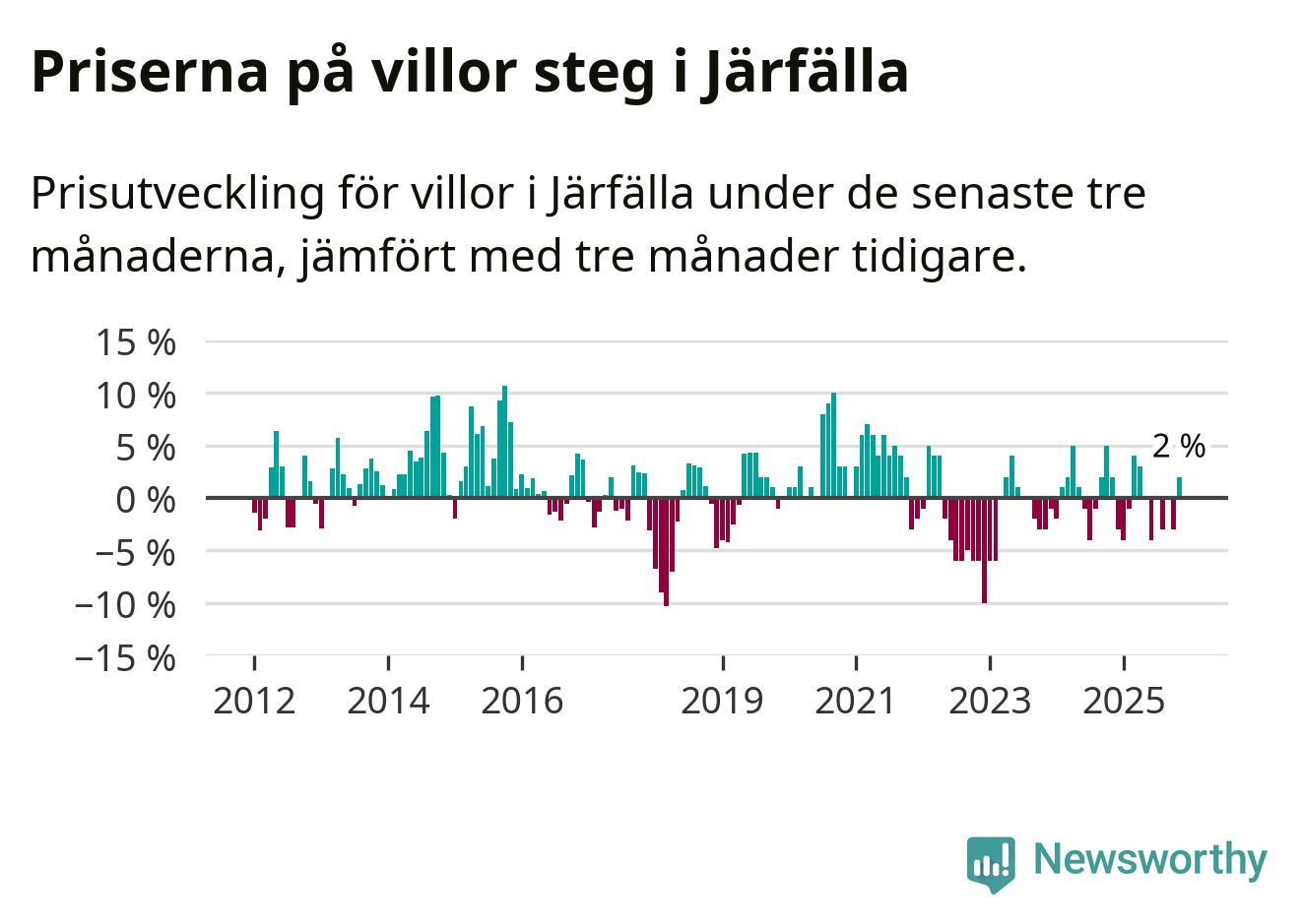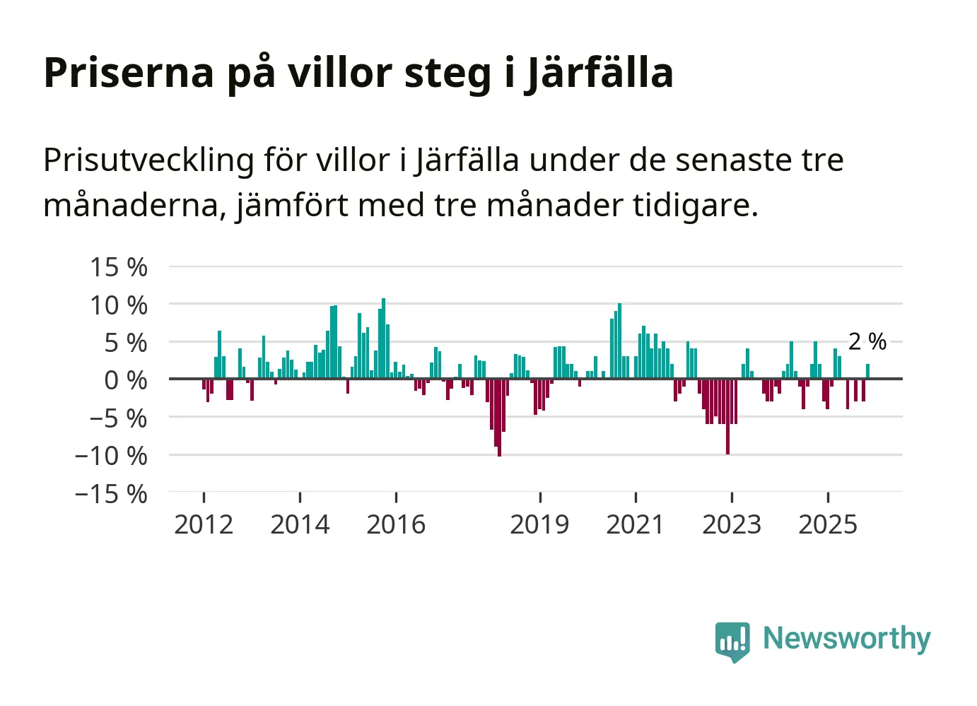 Villapriserna har gått upp i Järfälla kommun. Medelpriset på försäljningarna under de senaste tre månaderna visar på en uppgång med 2 procent.