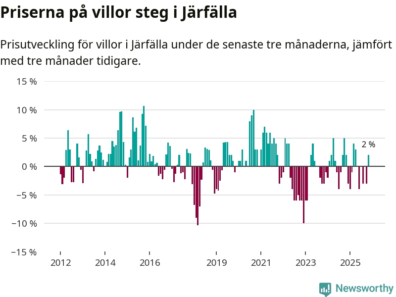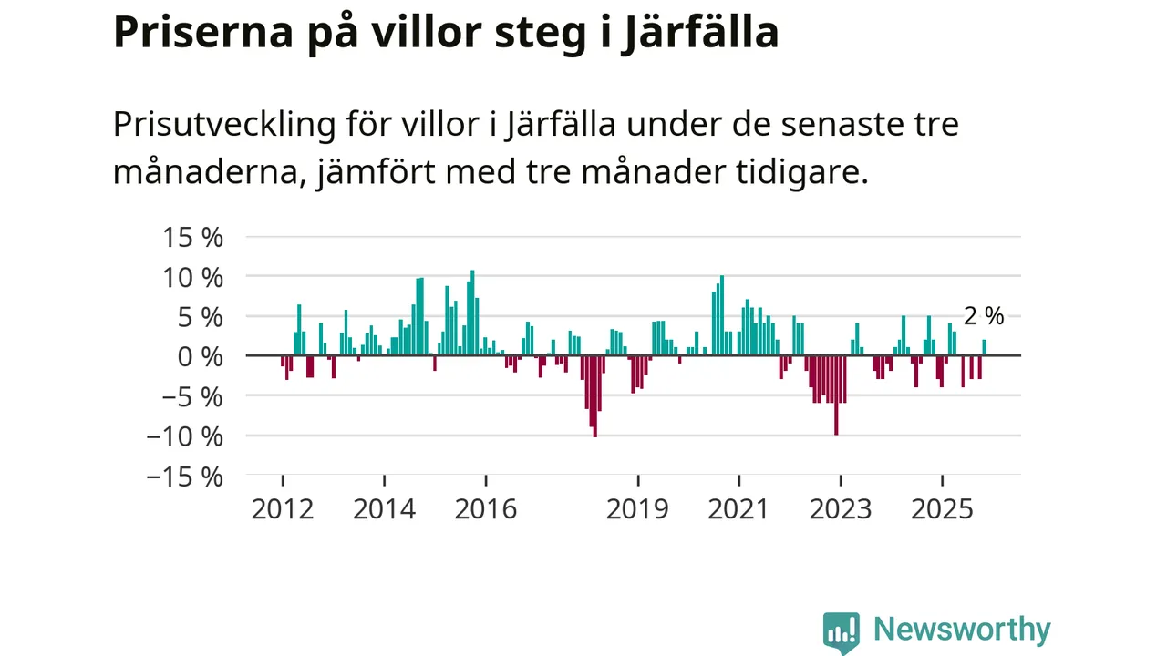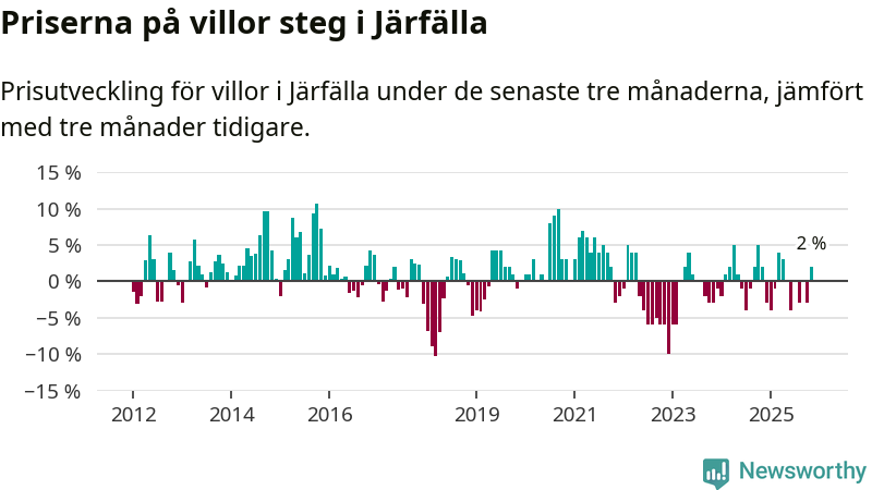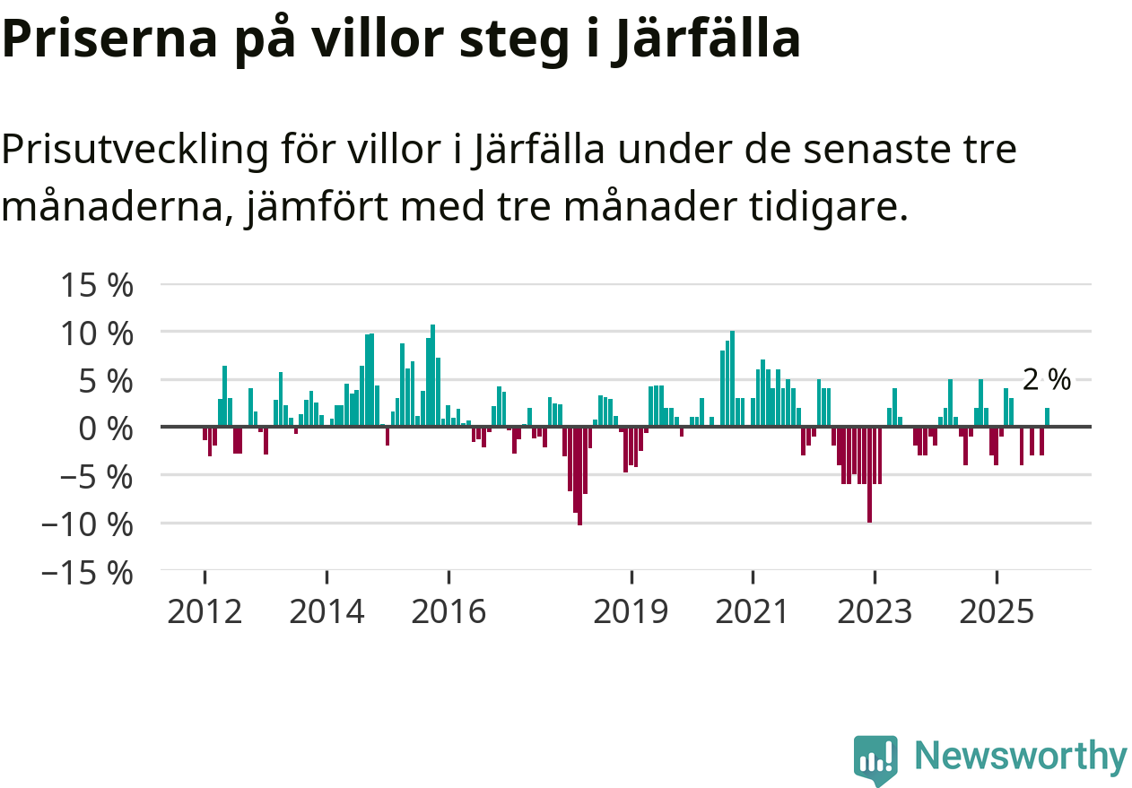 Villapriserna har gått upp i Järfälla kommun. Medelpriset på försäljningarna under de senaste tre månaderna visar på en uppgång med 2 procent.