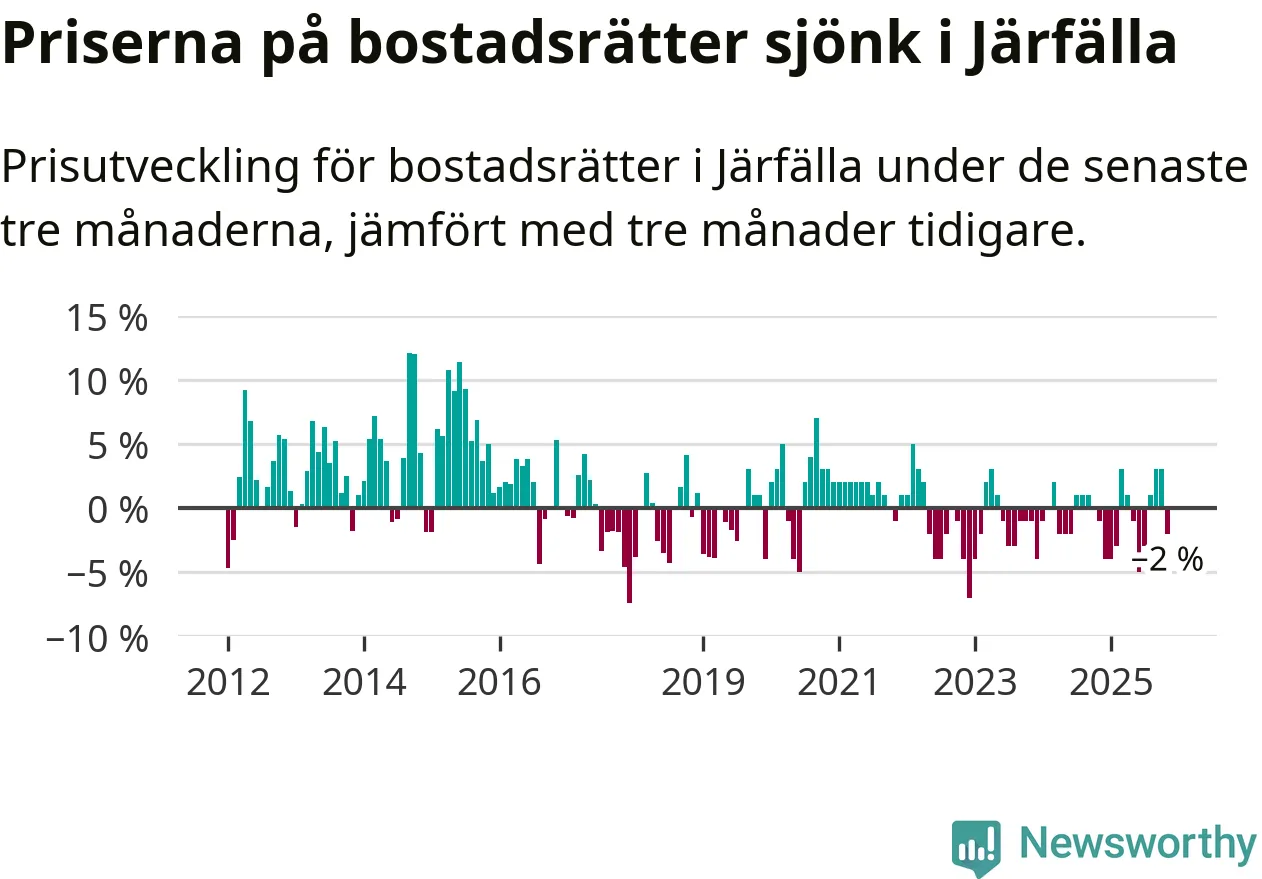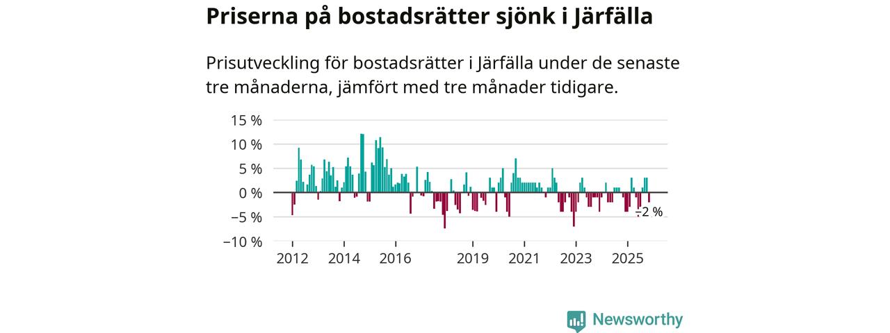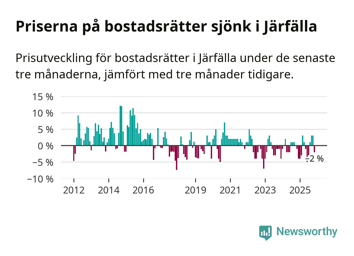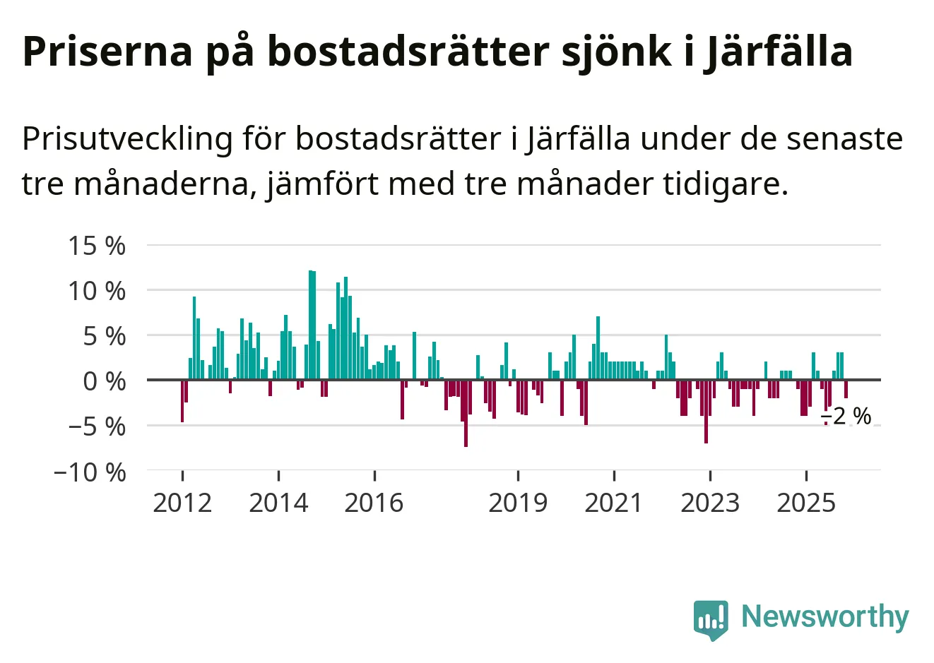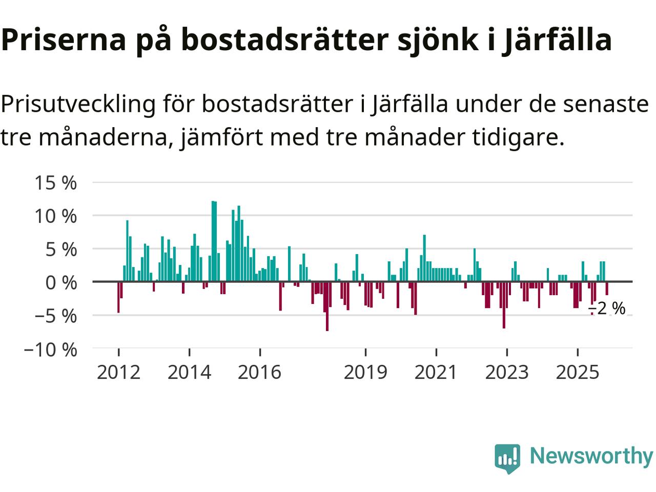 Priserna på bostadsrätter har gått ner i Järfälla kommun. Medelpriset på försäljningarna under de senaste tre månaderna visar på en nedgång med 2 procent.