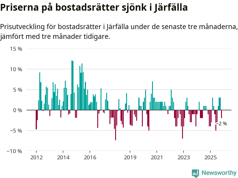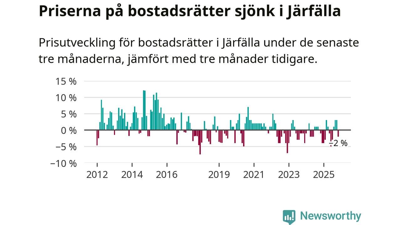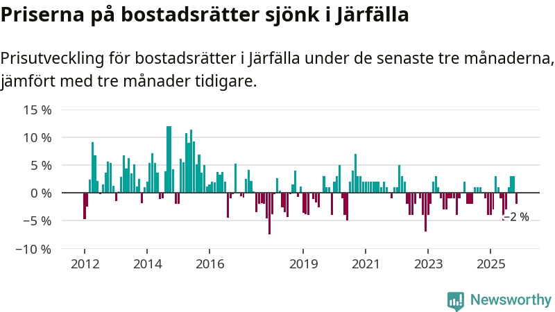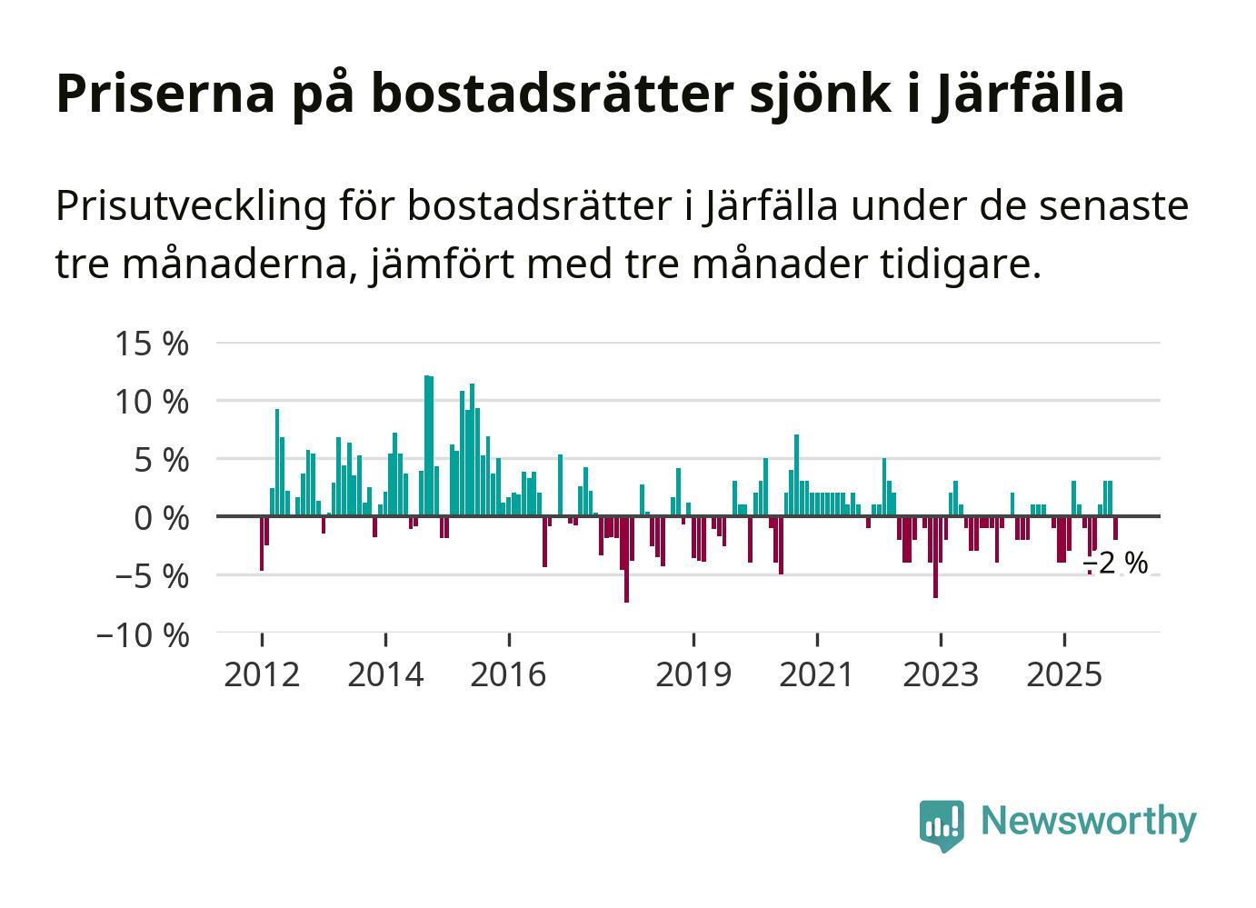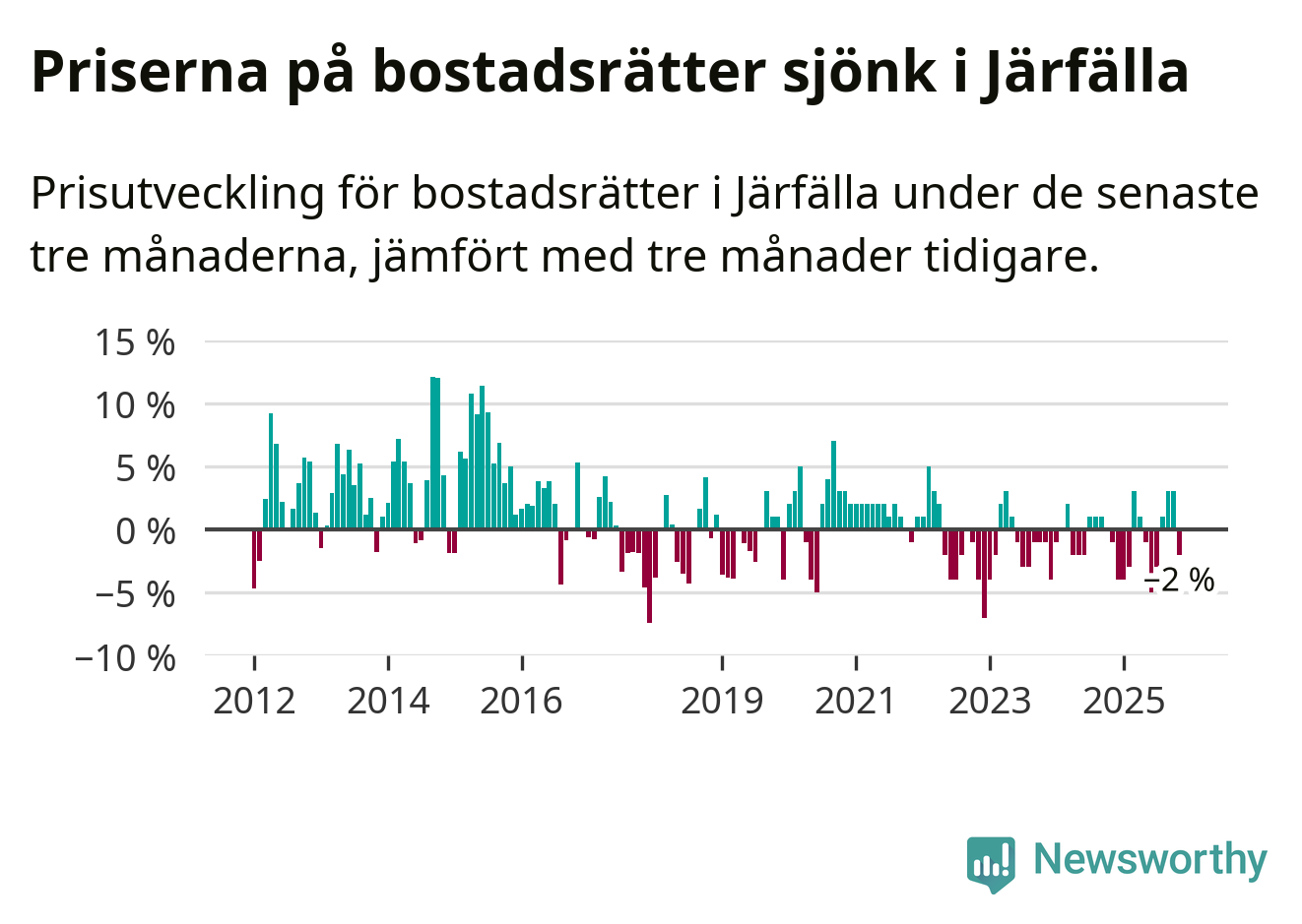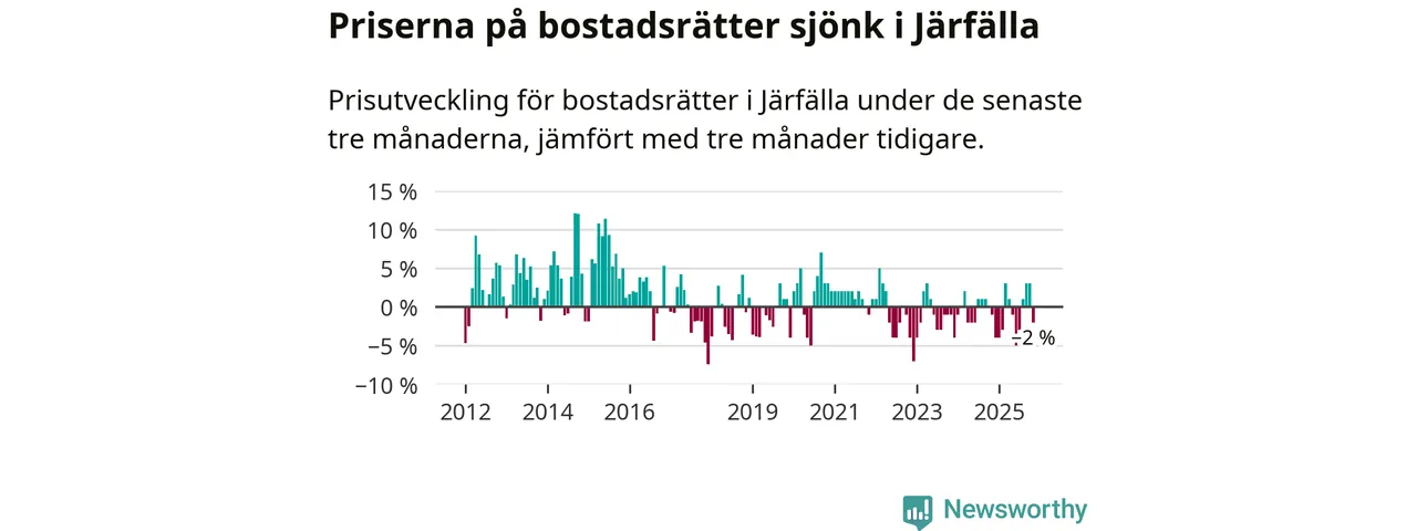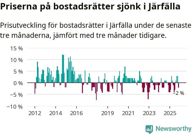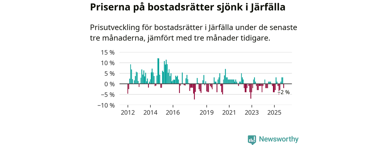 Priserna på bostadsrätter har gått ner i Järfälla kommun. Medelpriset på försäljningarna under de senaste tre månaderna visar på en nedgång med 2 procent.