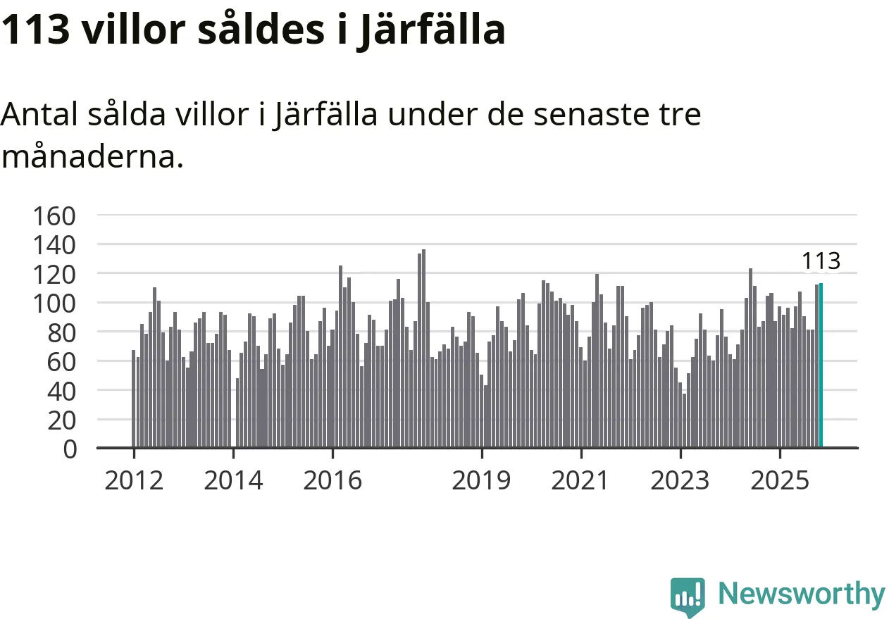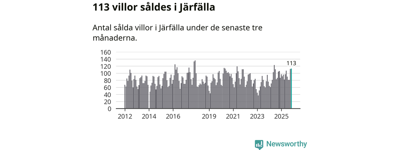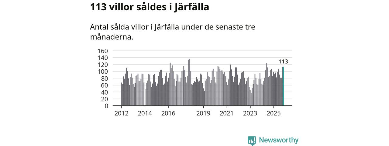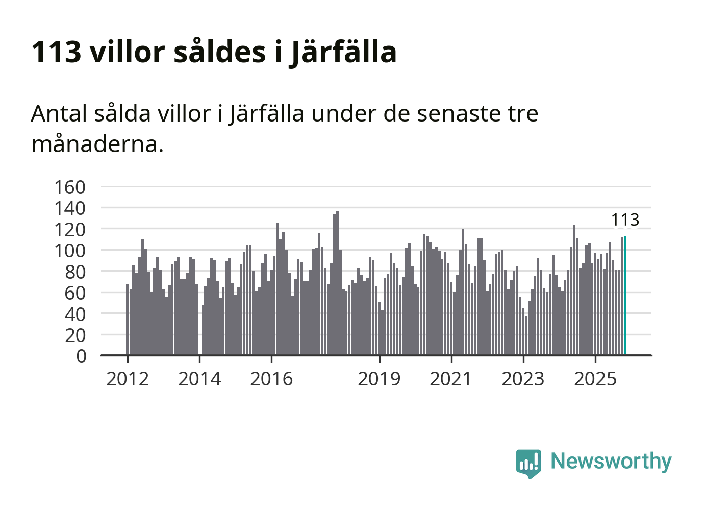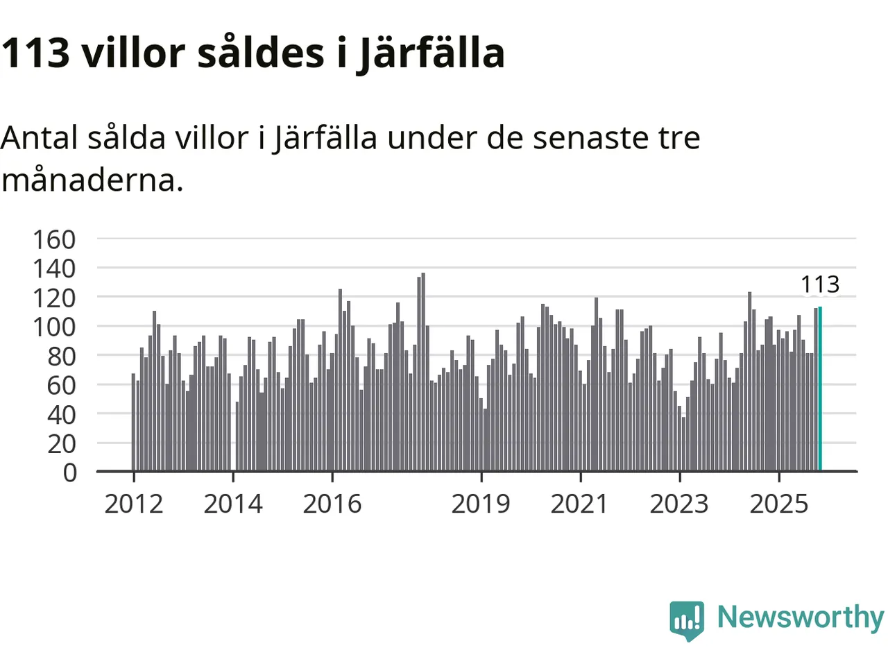 Sammanlagt såldes 113 villor i Järfälla kommun mellan september och november till ett genomsnittligt pris på 5,8 miljoner kronor. I fjol gjordes 106 affärer vid den här tiden på året.