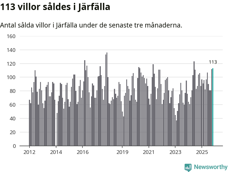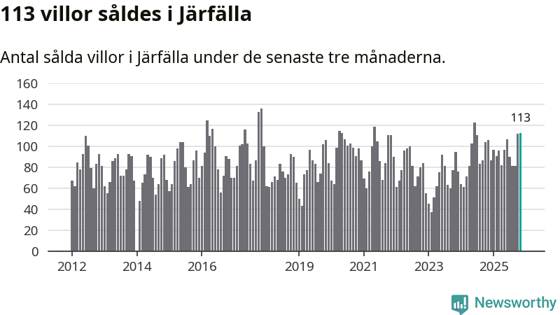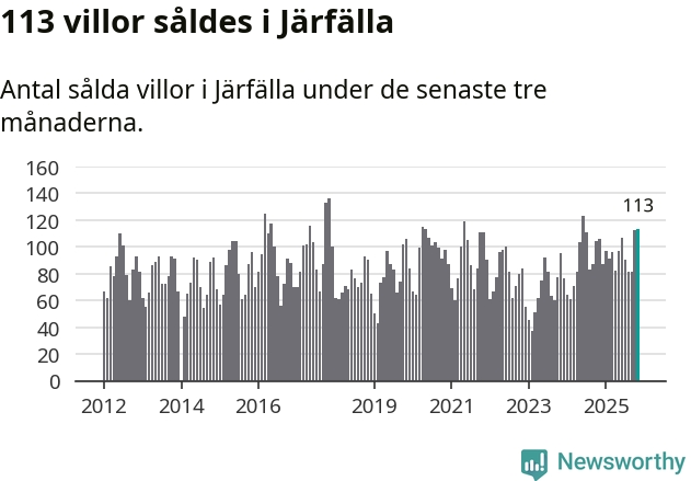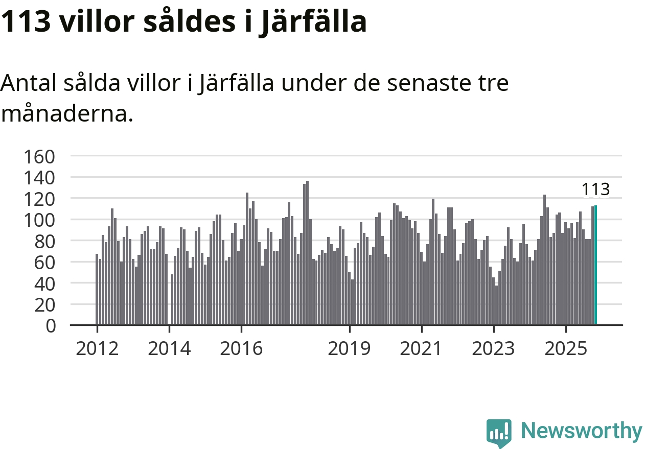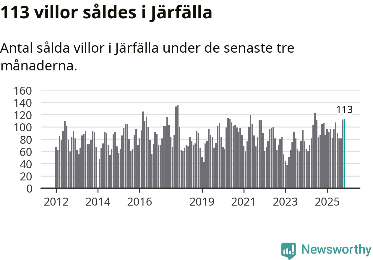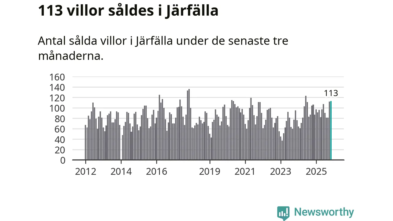 Sammanlagt såldes 113 villor i Järfälla kommun mellan september och november till ett genomsnittligt pris på 5,8 miljoner kronor. I fjol gjordes 106 affärer vid den här tiden på året.