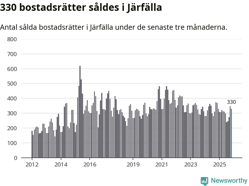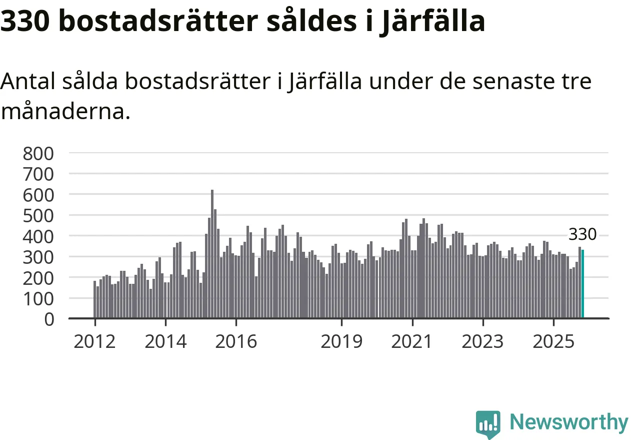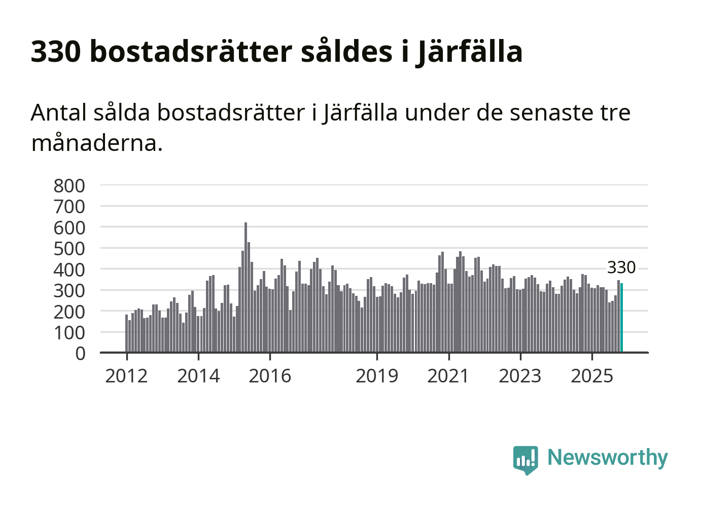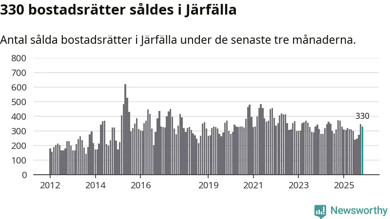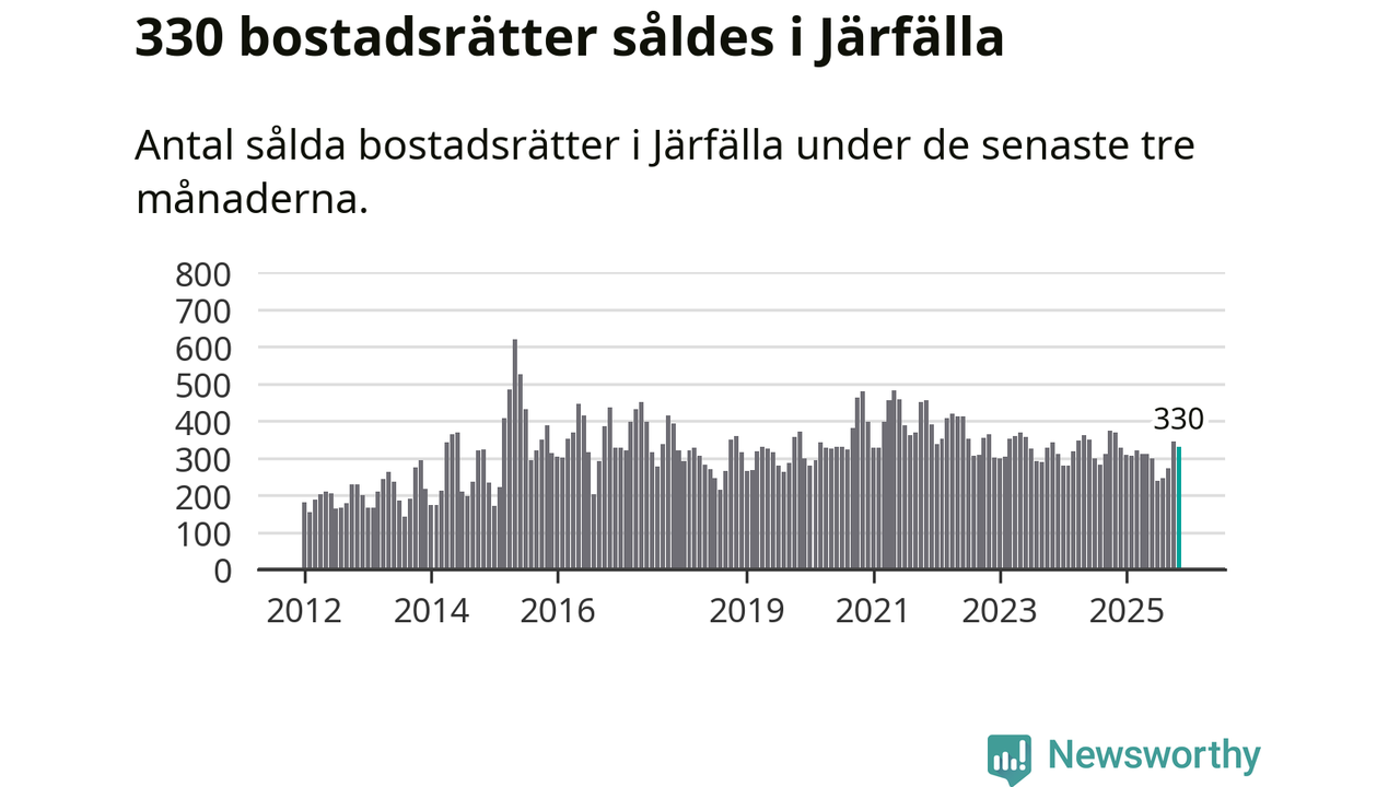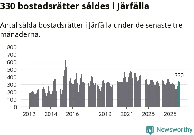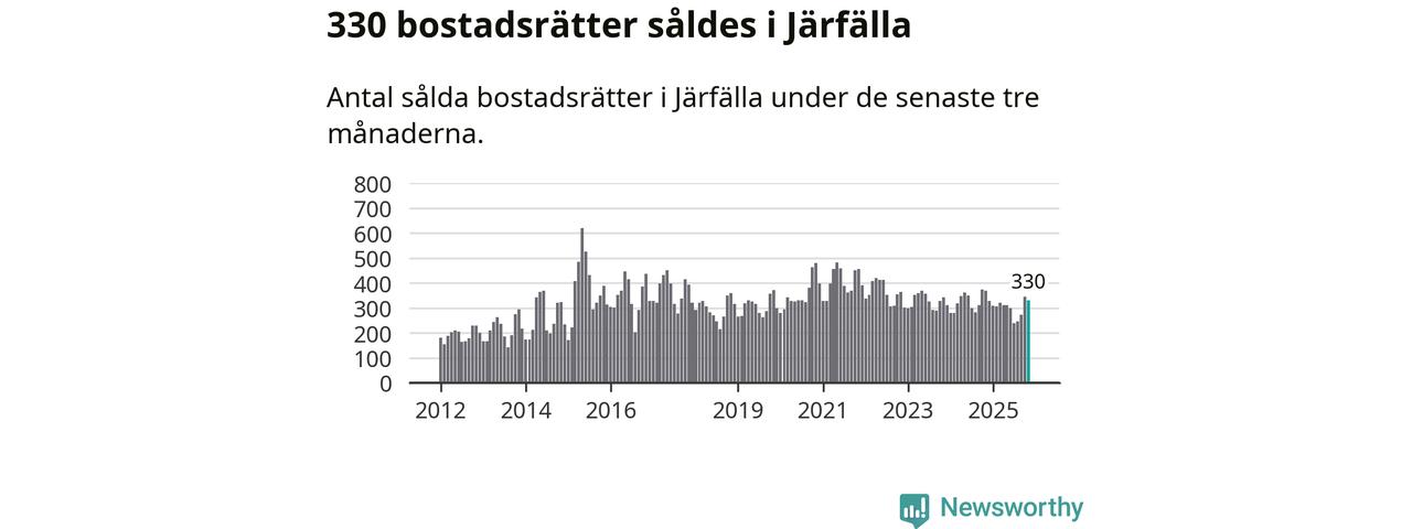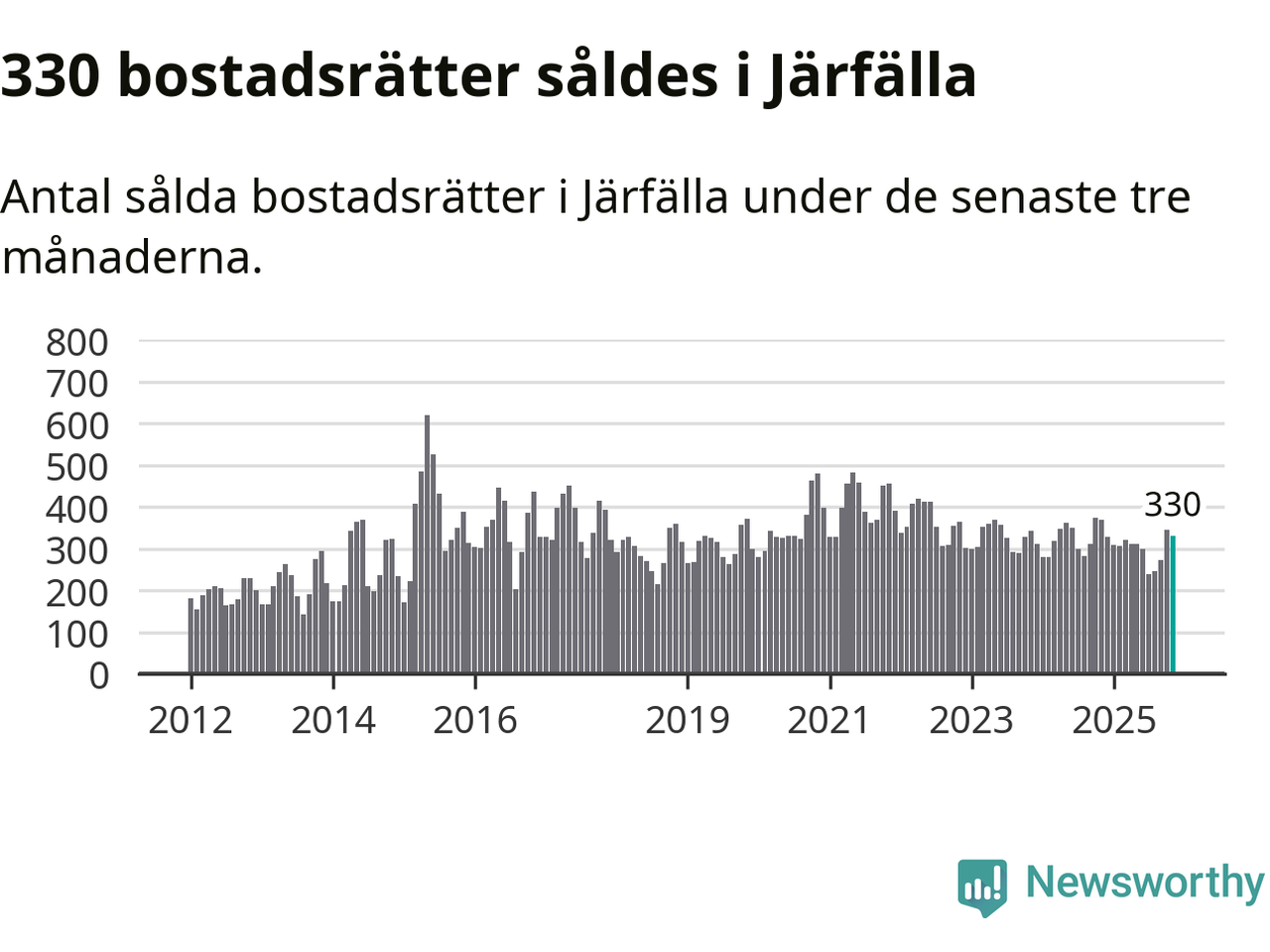 Sammanlagt såldes 330 bostadsrätter i Järfälla kommun mellan september och november till ett genomsnittligt pris på 2,2 miljoner kronor. I fjol gjordes 370 affärer vid den här tiden på året.