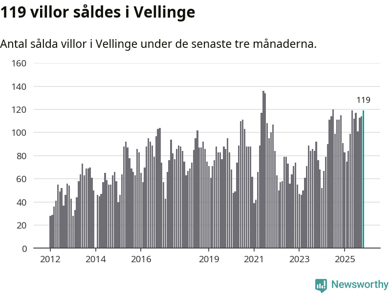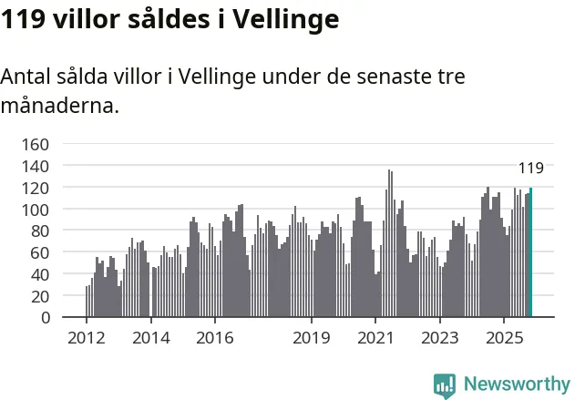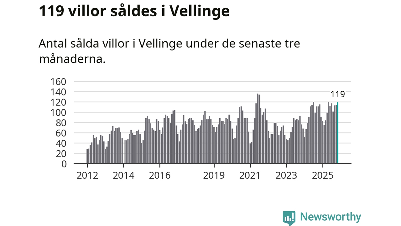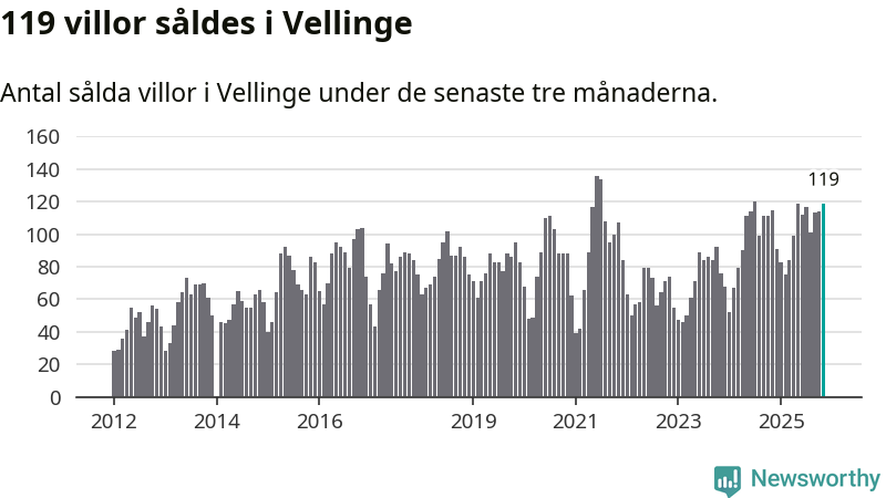 Sammanlagt såldes 119 villor i Vellinge kommun mellan september och november till ett genomsnittligt pris på 8,0 miljoner kronor. I fjol gjordes 115 affärer vid den här tiden på året.