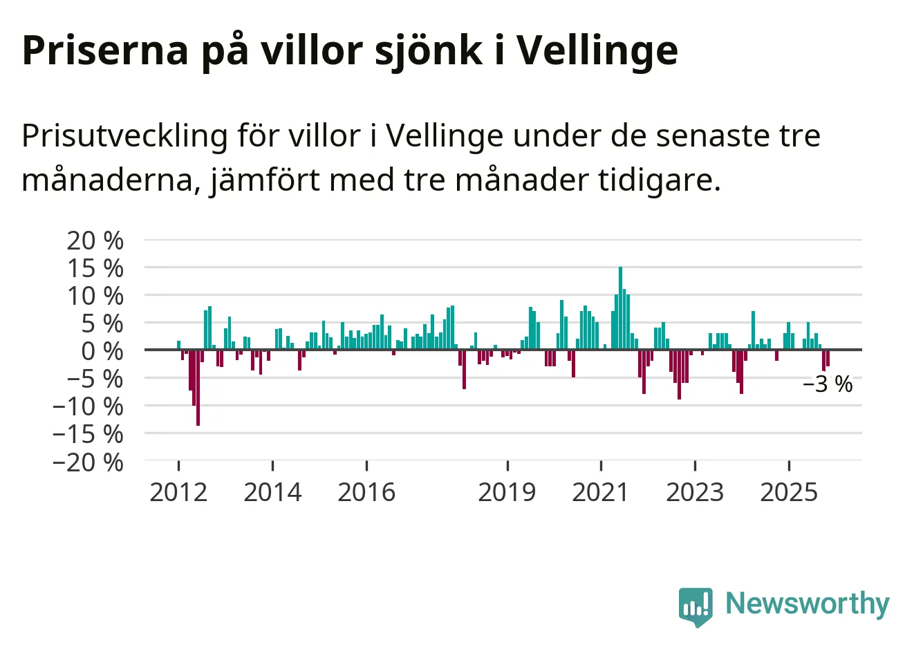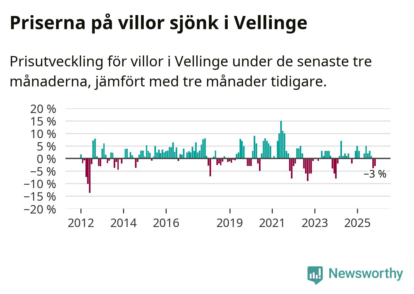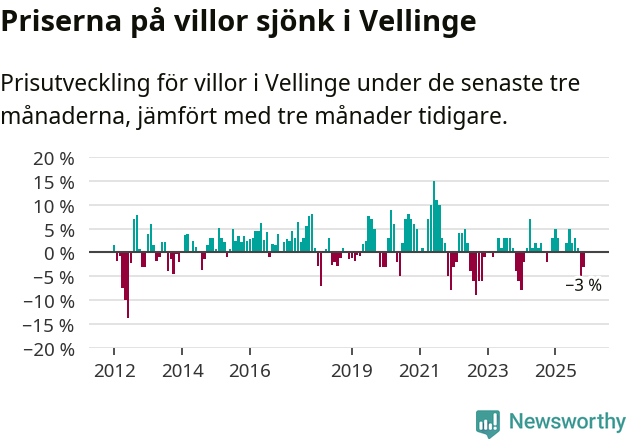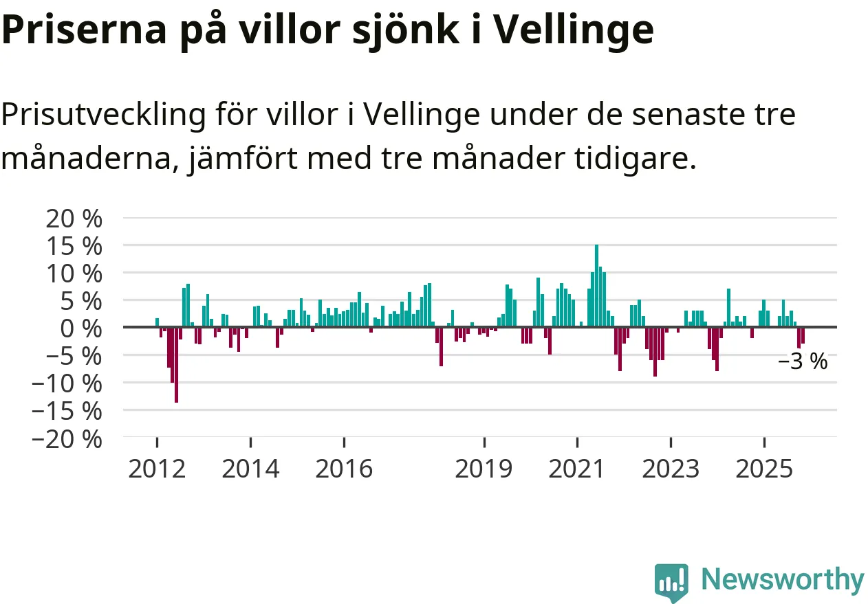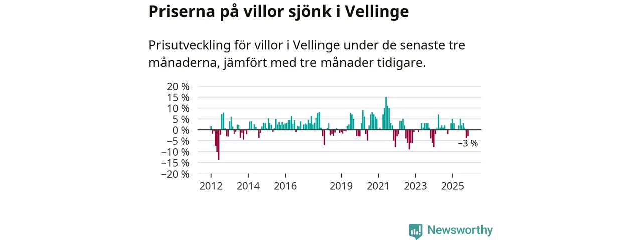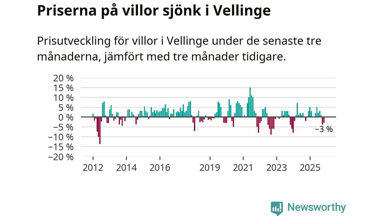 Villapriserna har gått ner i Vellinge kommun. Medelpriset på försäljningarna under de senaste tre månaderna visar på en nedgång med 3 procent.