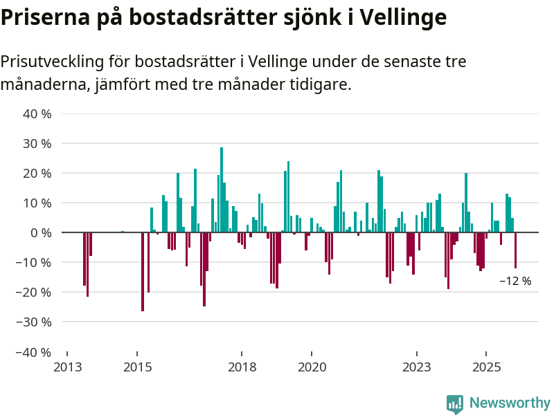 Statistiken visar även på en stor prisnedgång i Vellinge kommun. Medelpriset på försäljningarna av bostadsrätter i kommunen var 12 procent lägre än för tre månader sedan. Även i hela Skåne sjunker priserna på bostadsrätter. I hela länet noterades en prisnedgång på 3 procent.