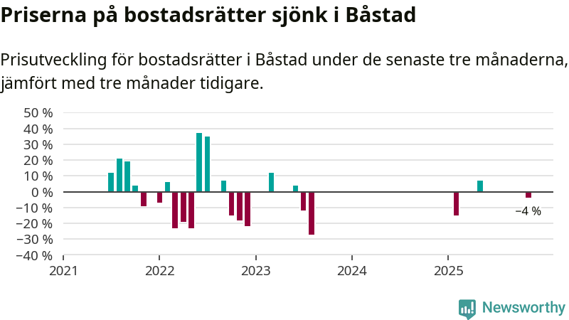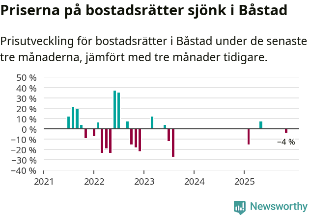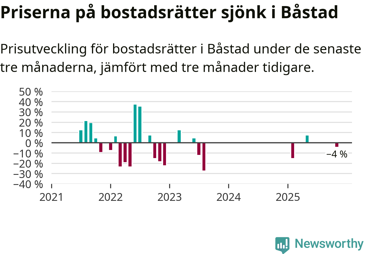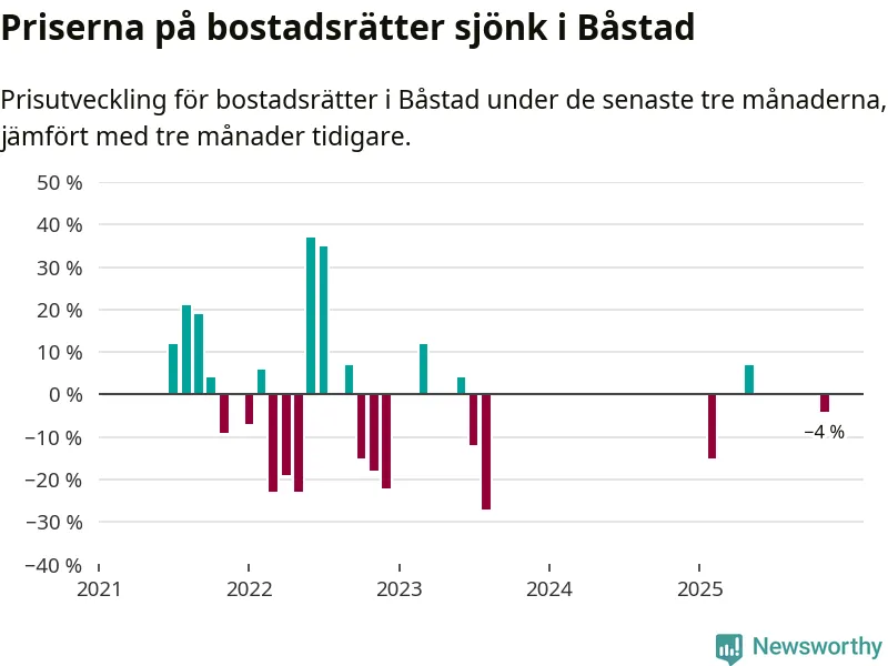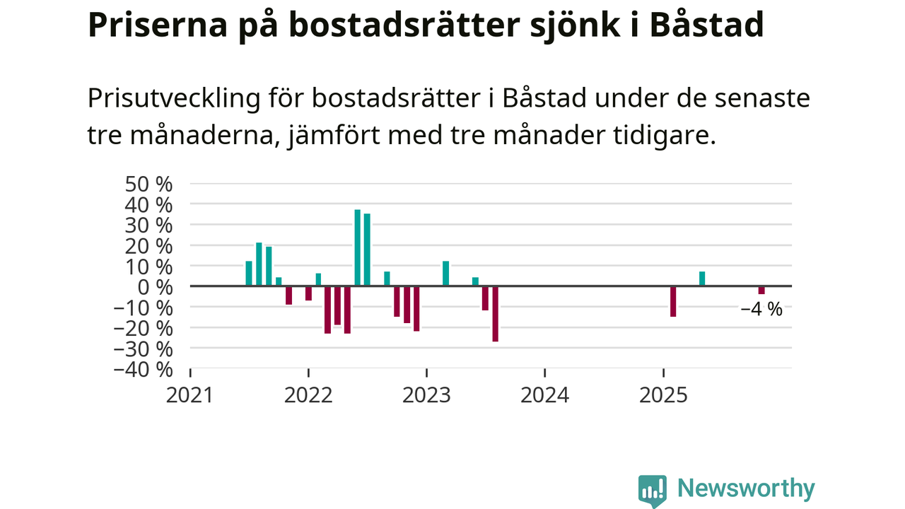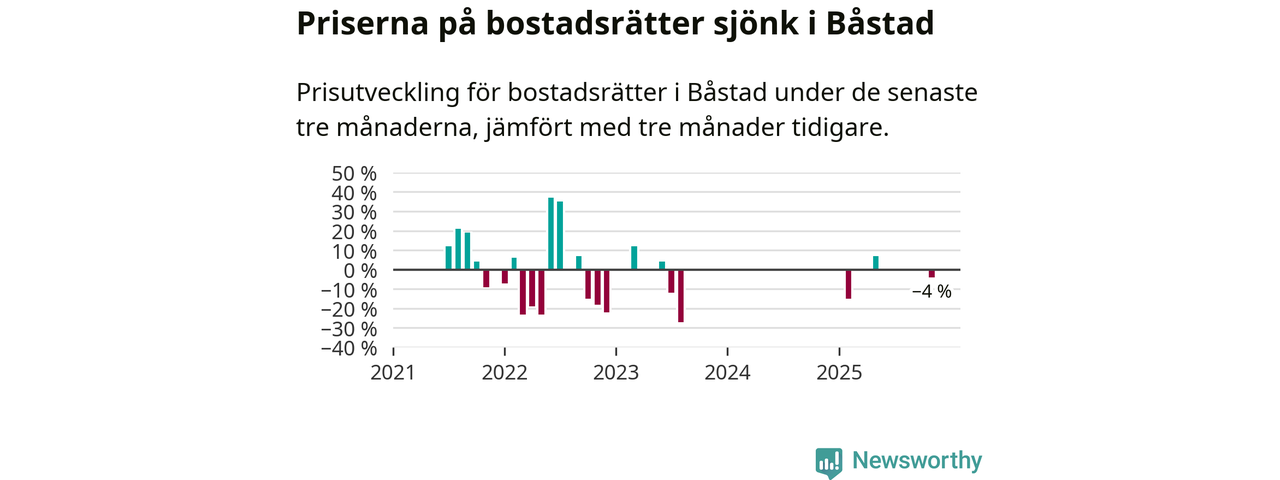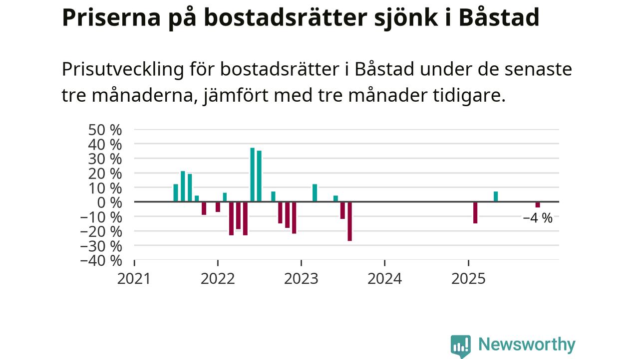 Statistiken visar även på en kännbar prisnedgång i Båstads kommun. Medelpriset på försäljningarna av bostadsrätter i kommunen var 4 procent lägre än för tre månader sedan. Även i hela Skåne sjunker priserna på bostadsrätter. I hela länet noterades en prisnedgång på 3 procent.