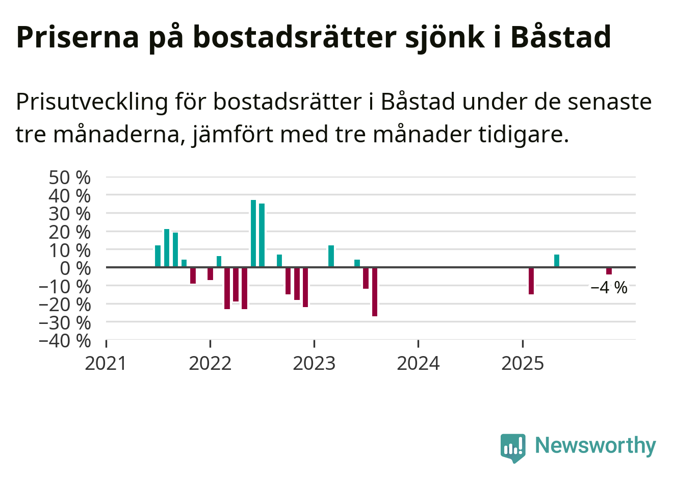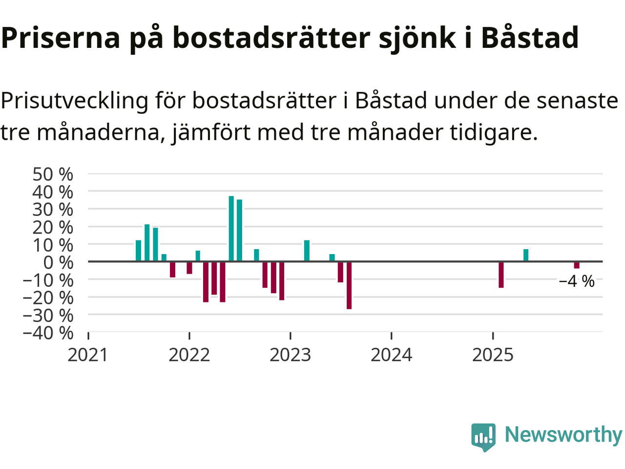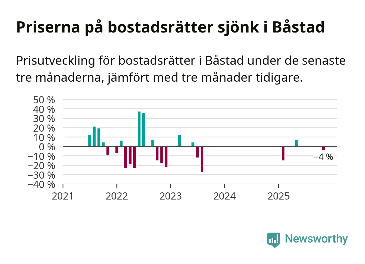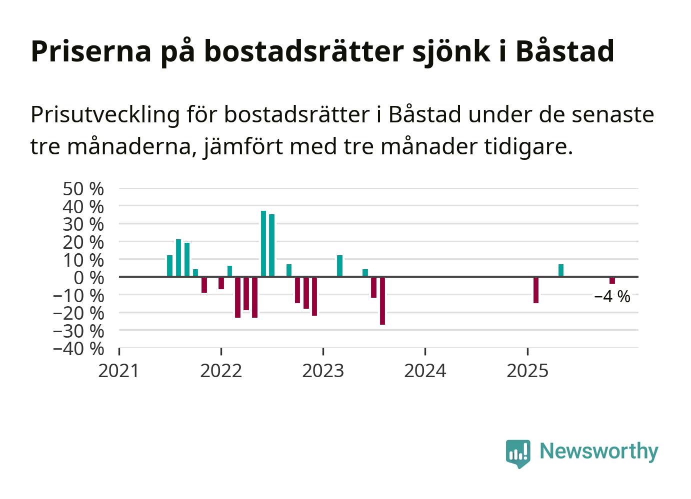 Statistiken visar även på en kännbar prisnedgång i Båstads kommun. Medelpriset på försäljningarna av bostadsrätter i kommunen var 4 procent lägre än för tre månader sedan. Även i hela Skåne sjunker priserna på bostadsrätter. I hela länet noterades en prisnedgång på 3 procent.