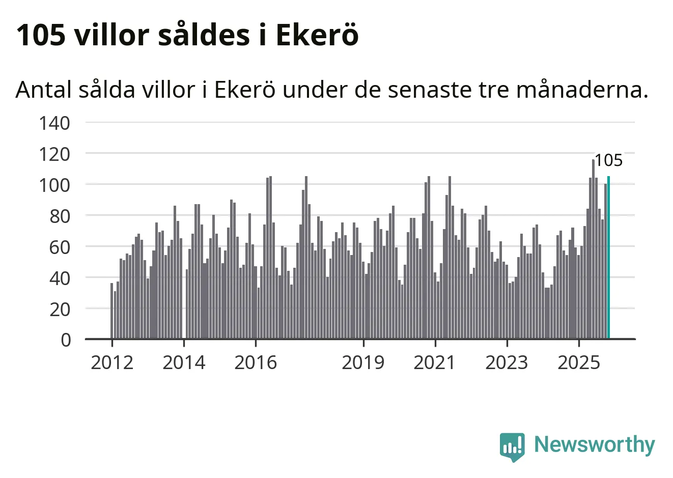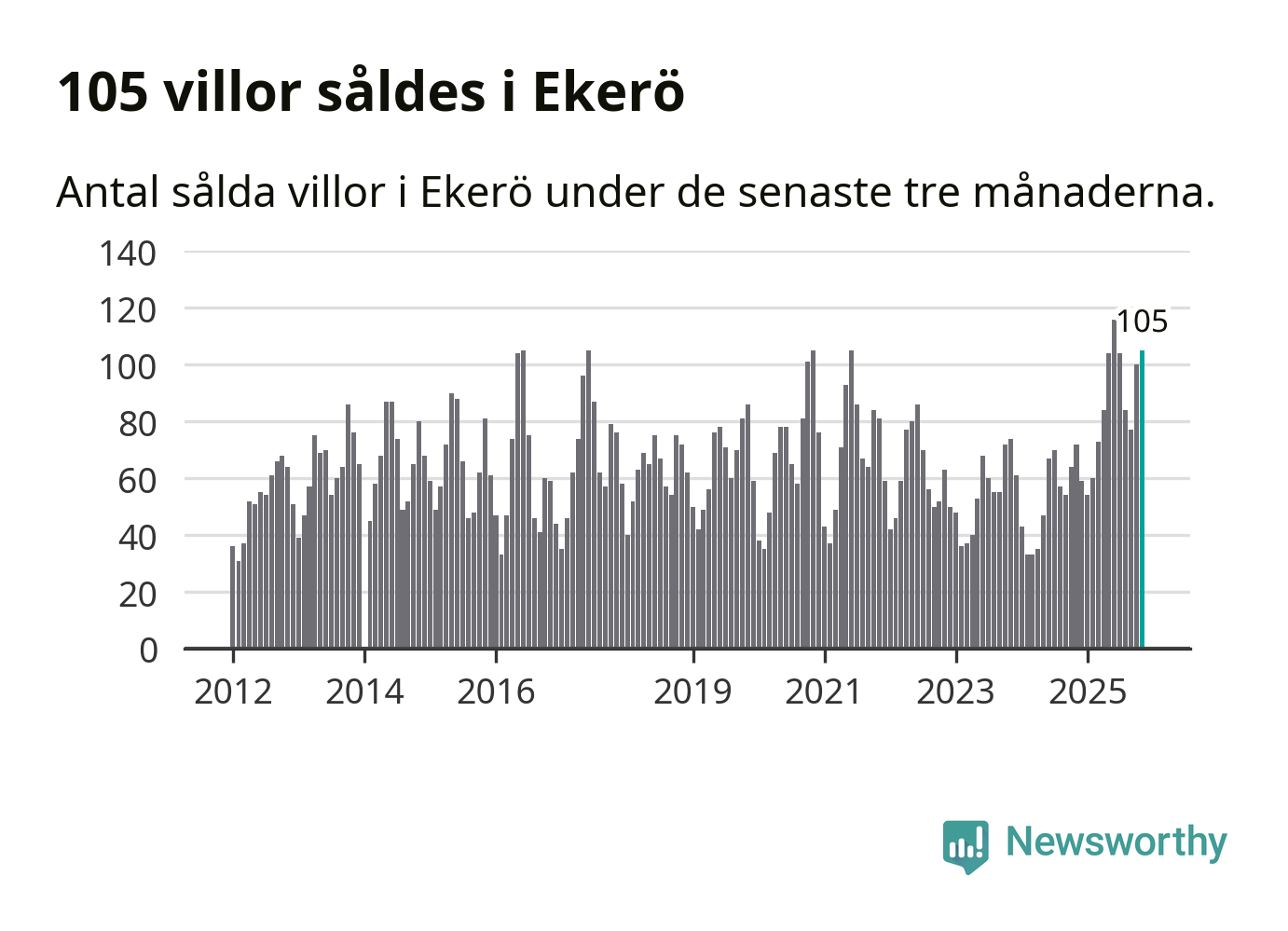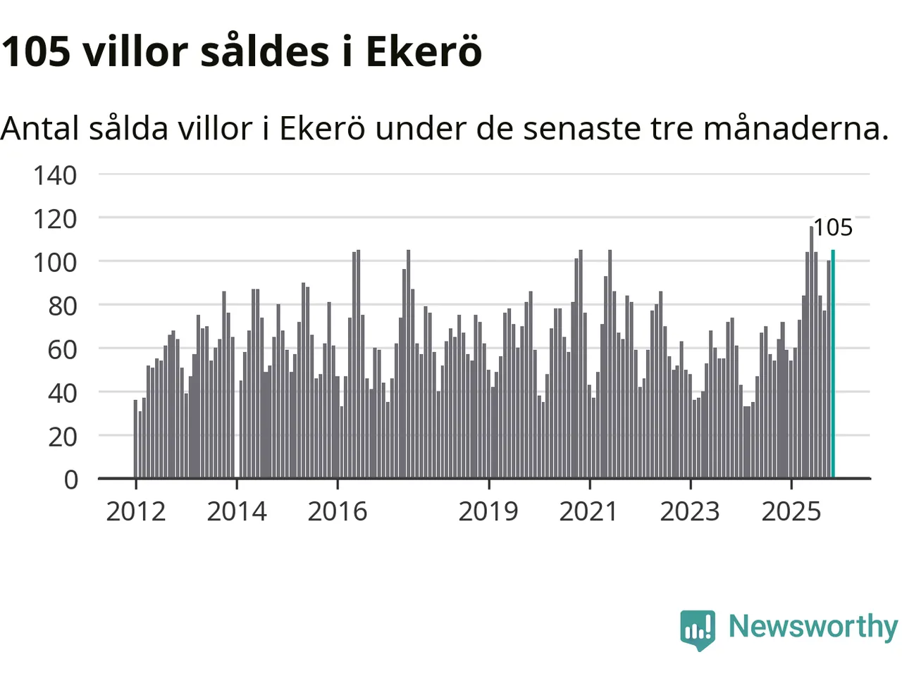 Sammanlagt såldes 105 villor i Ekerö kommun mellan september och november till ett genomsnittligt pris på 7,0 miljoner kronor. I fjol gjordes 72 affärer vid den här tiden på året.