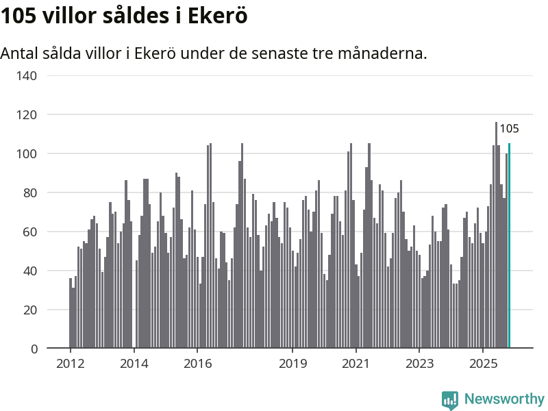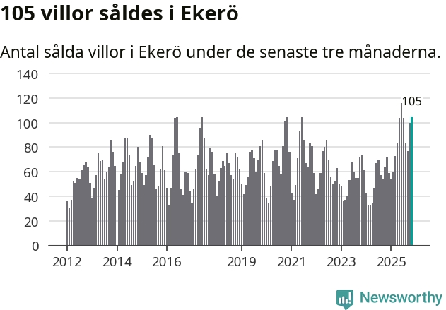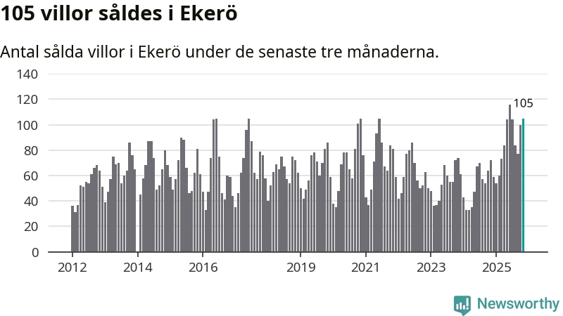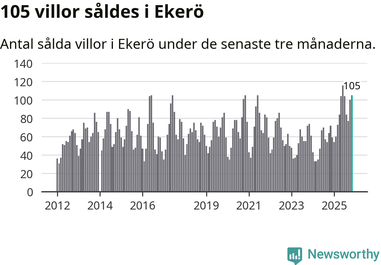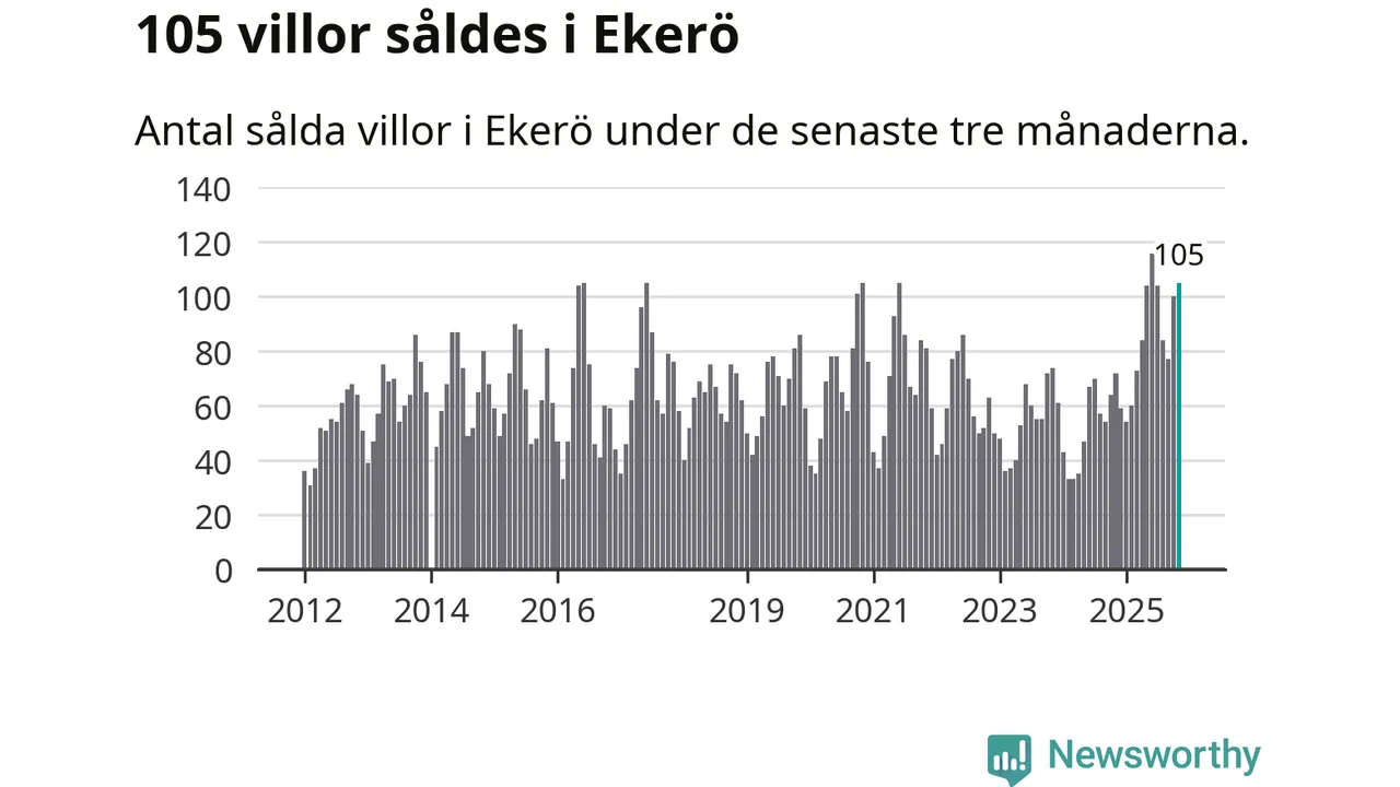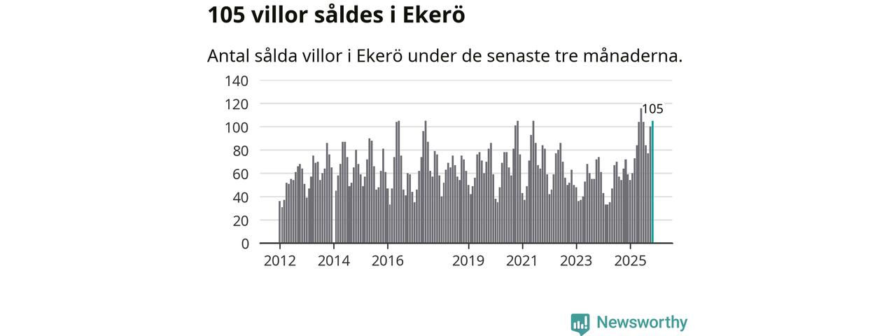 Sammanlagt såldes 105 villor i Ekerö kommun mellan september och november till ett genomsnittligt pris på 7,0 miljoner kronor. I fjol gjordes 72 affärer vid den här tiden på året.