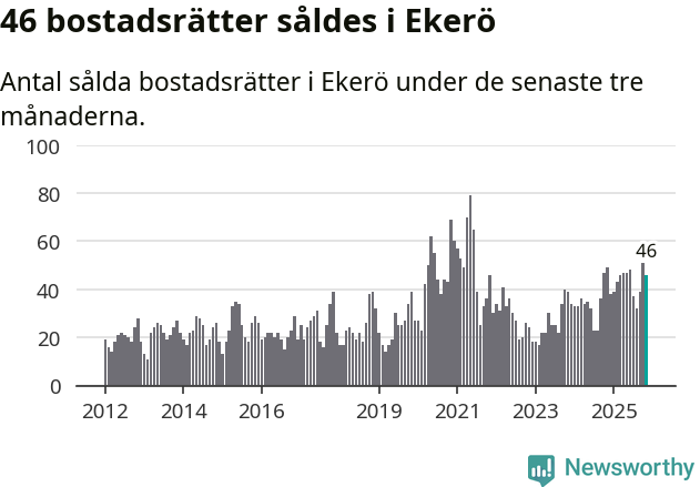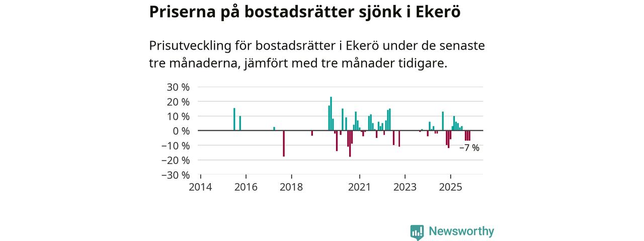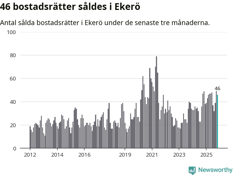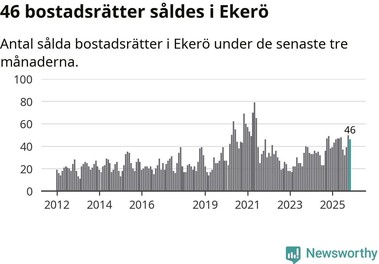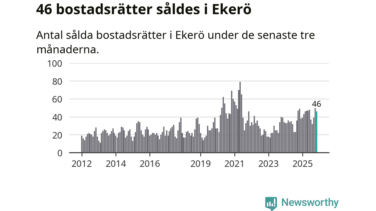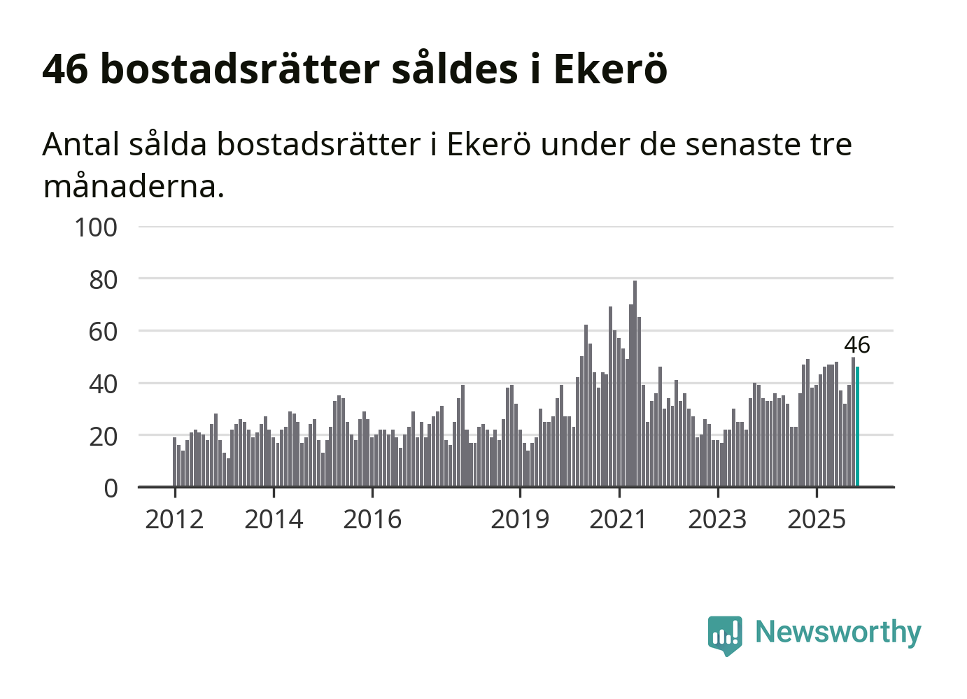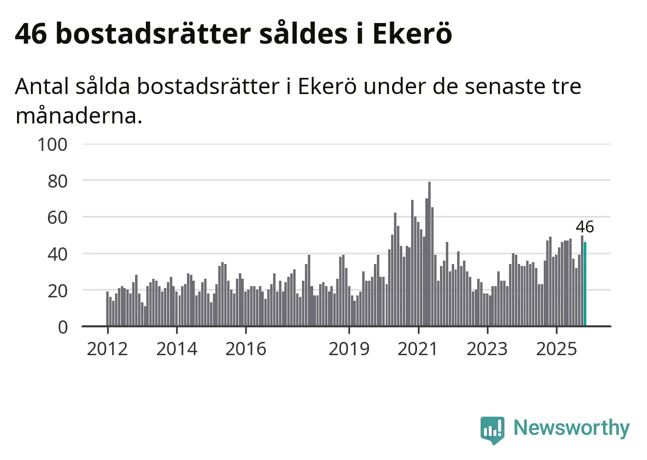 Mellan september och november gjordes sammanlagt 46 affärer med bostadsrätter i Ekerö kommun. Det kan jämföras med 49 vid motsvarande tid i fjol.