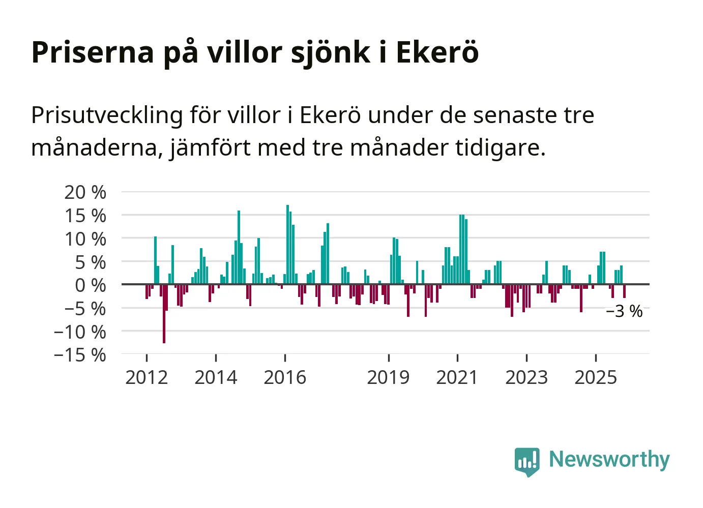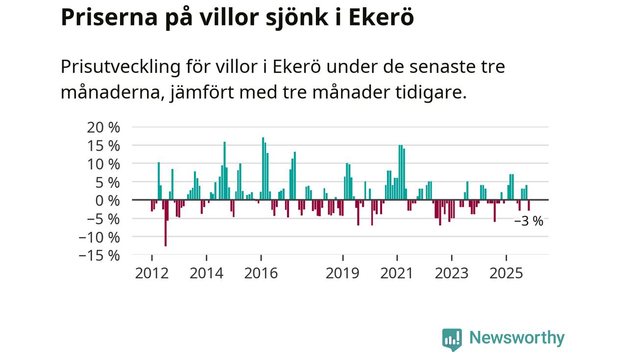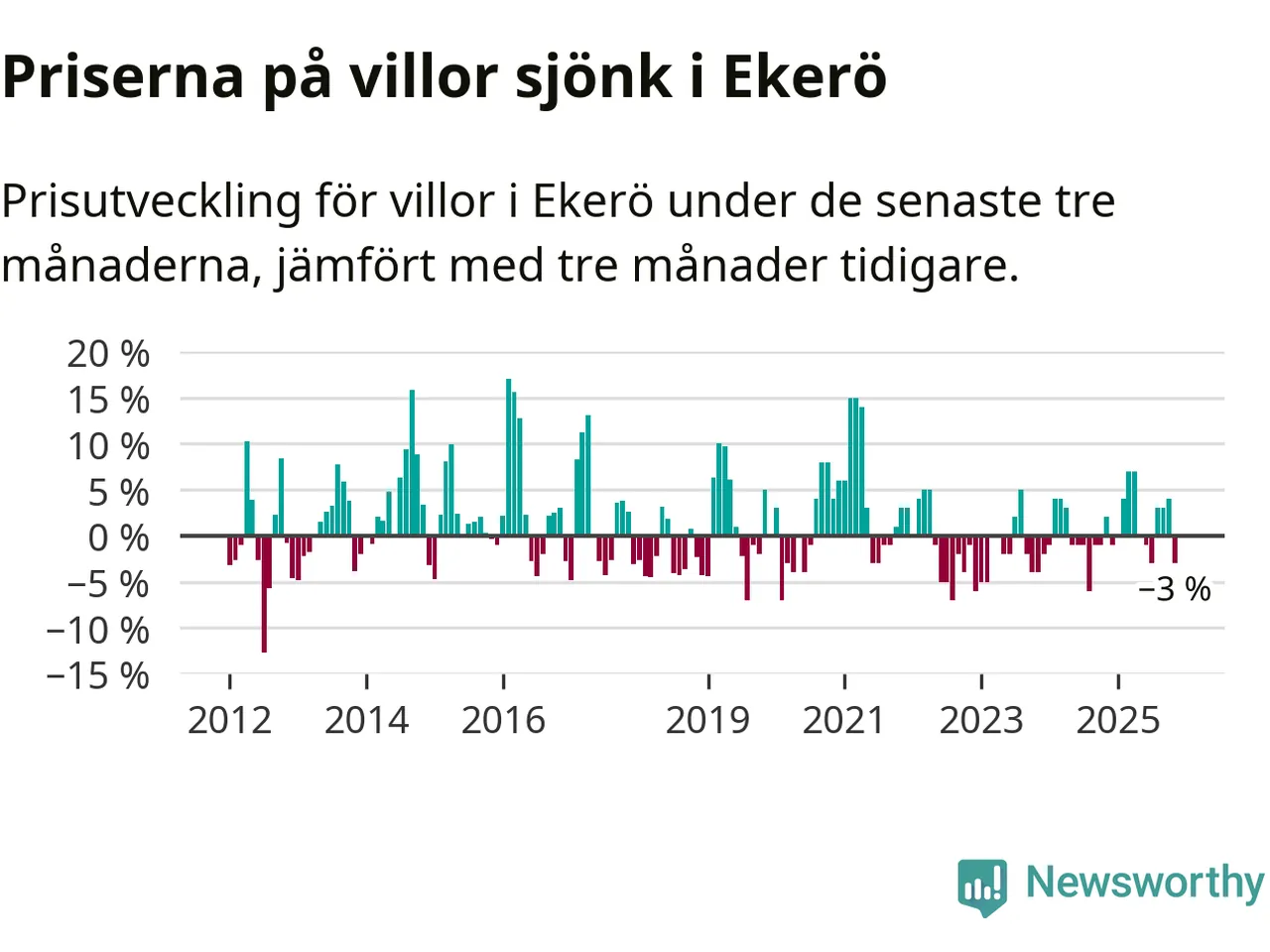 Villapriserna har gått ner i Ekerö kommun. Medelpriset på försäljningarna under de senaste tre månaderna visar på en nedgång med 3 procent.