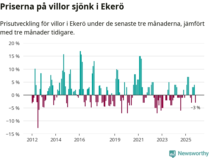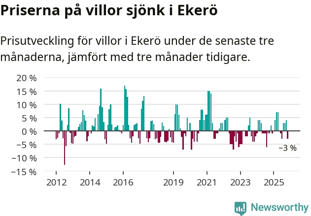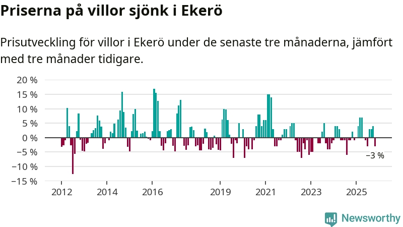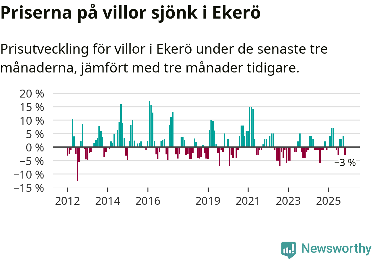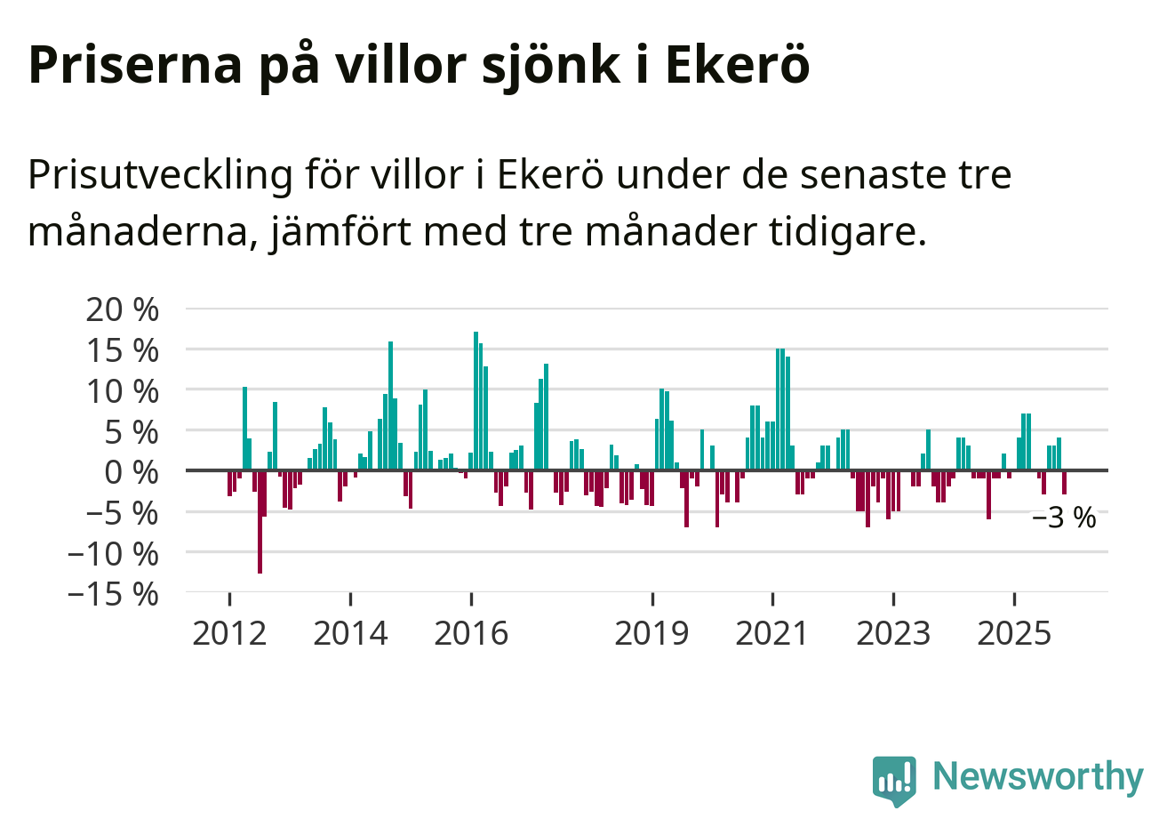 Villapriserna har gått ner i Ekerö kommun. Medelpriset på försäljningarna under de senaste tre månaderna visar på en nedgång med 3 procent.