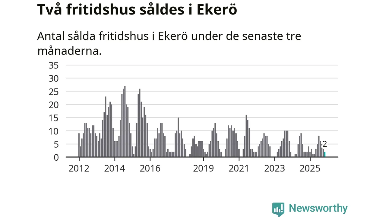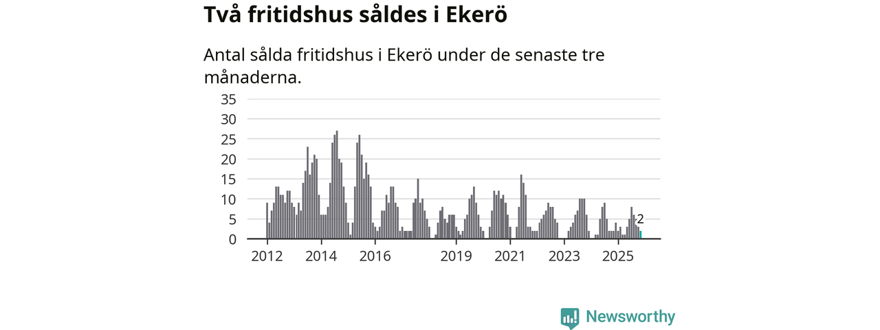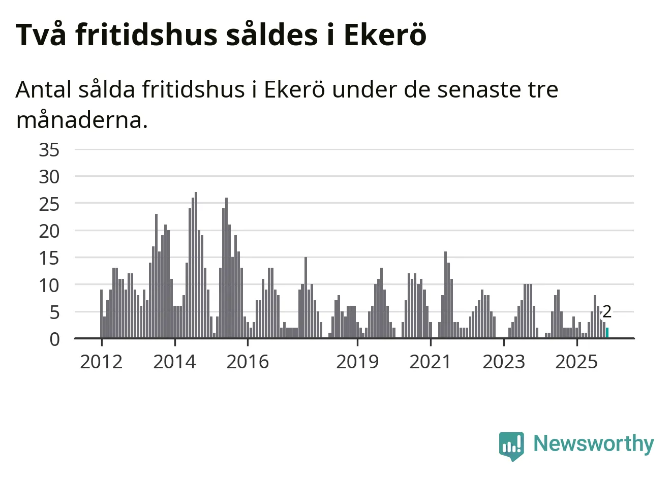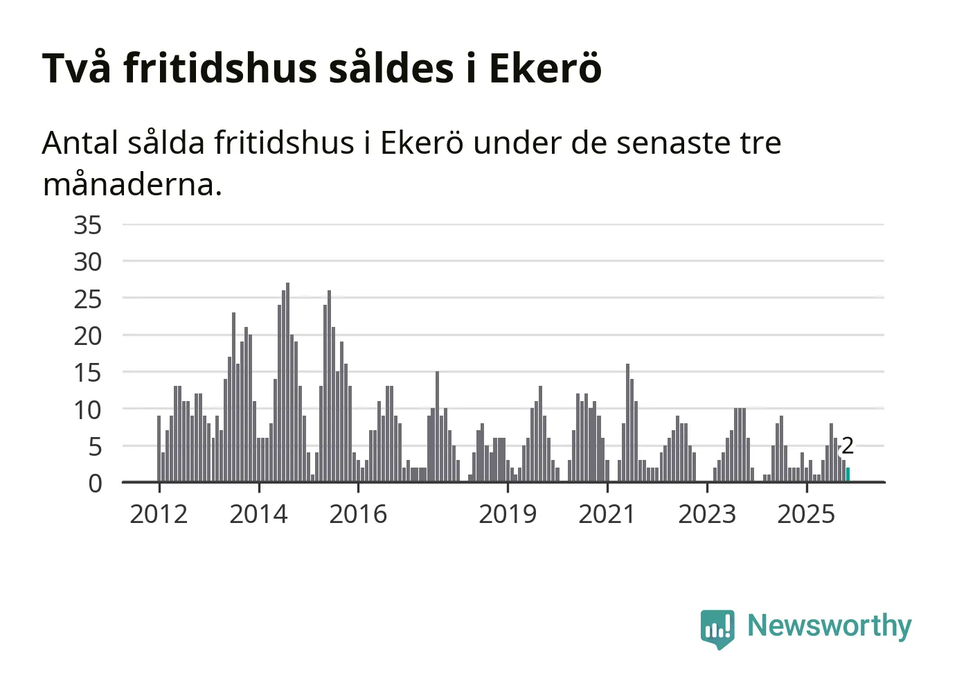 Mellan september och november gjordes sammanlagt två affärer med fritidshus i Ekerö kommun. Det är lika många affärer som vid motsvarande tid i fjol.