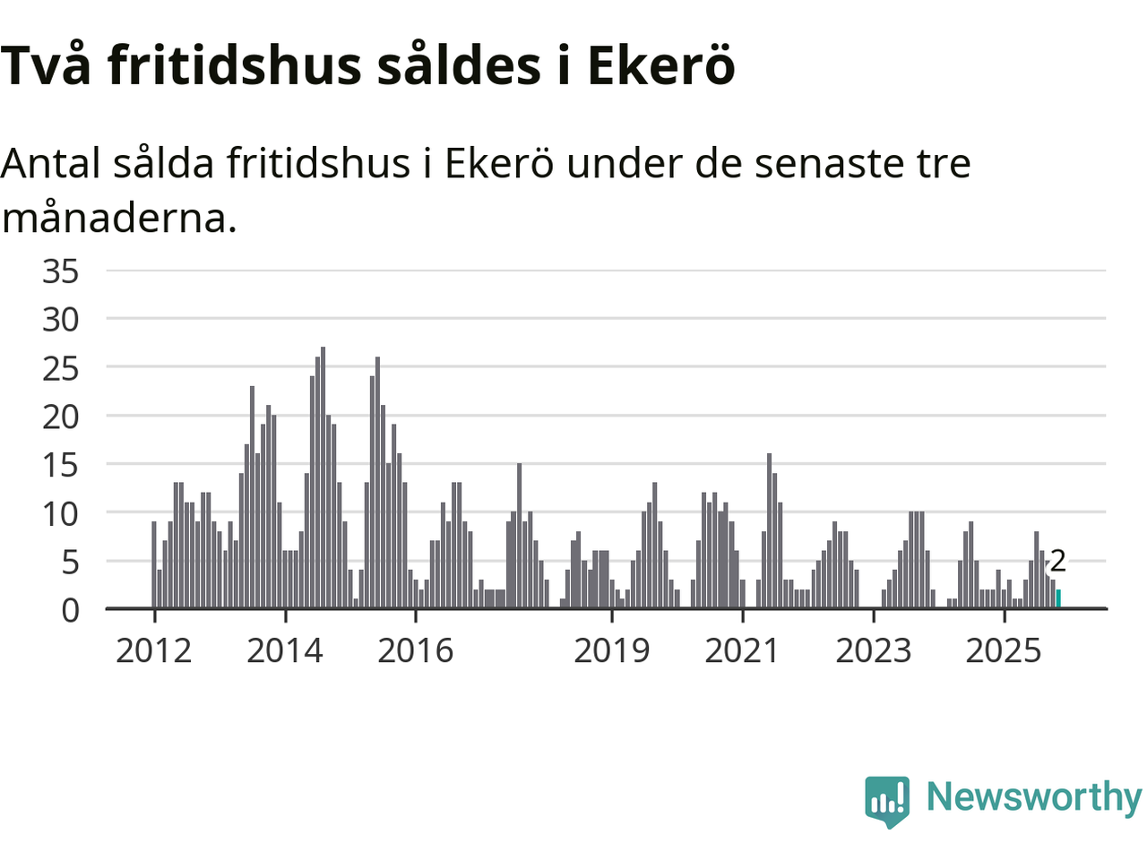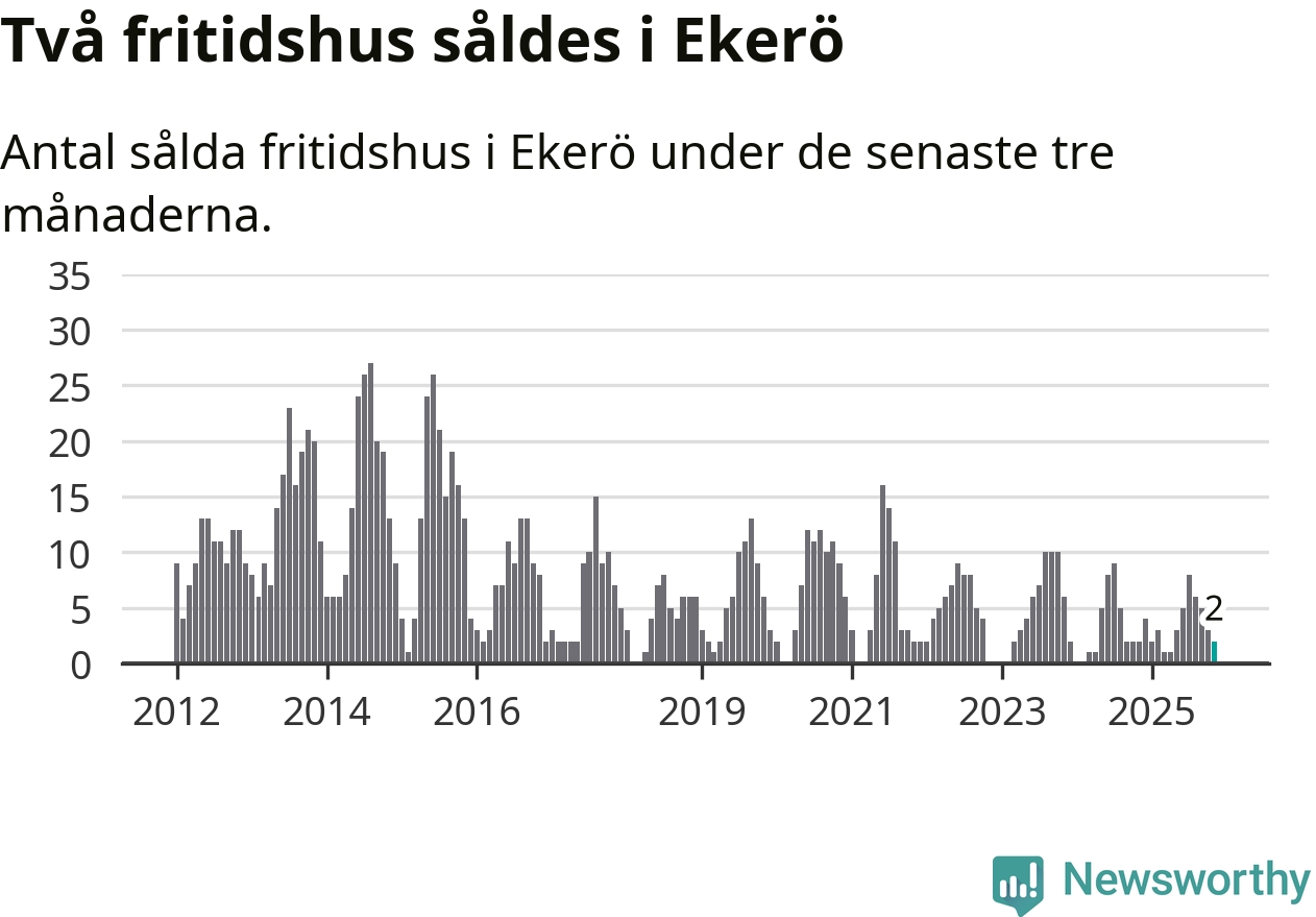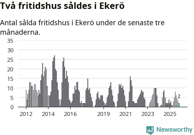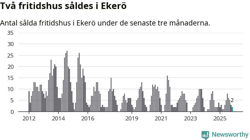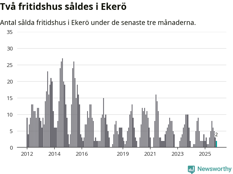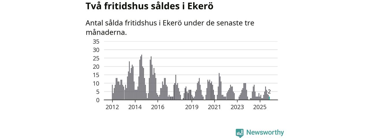 Mellan september och november gjordes sammanlagt två affärer med fritidshus i Ekerö kommun. Det är lika många affärer som vid motsvarande tid i fjol.
