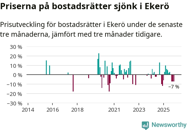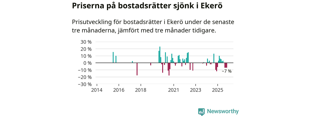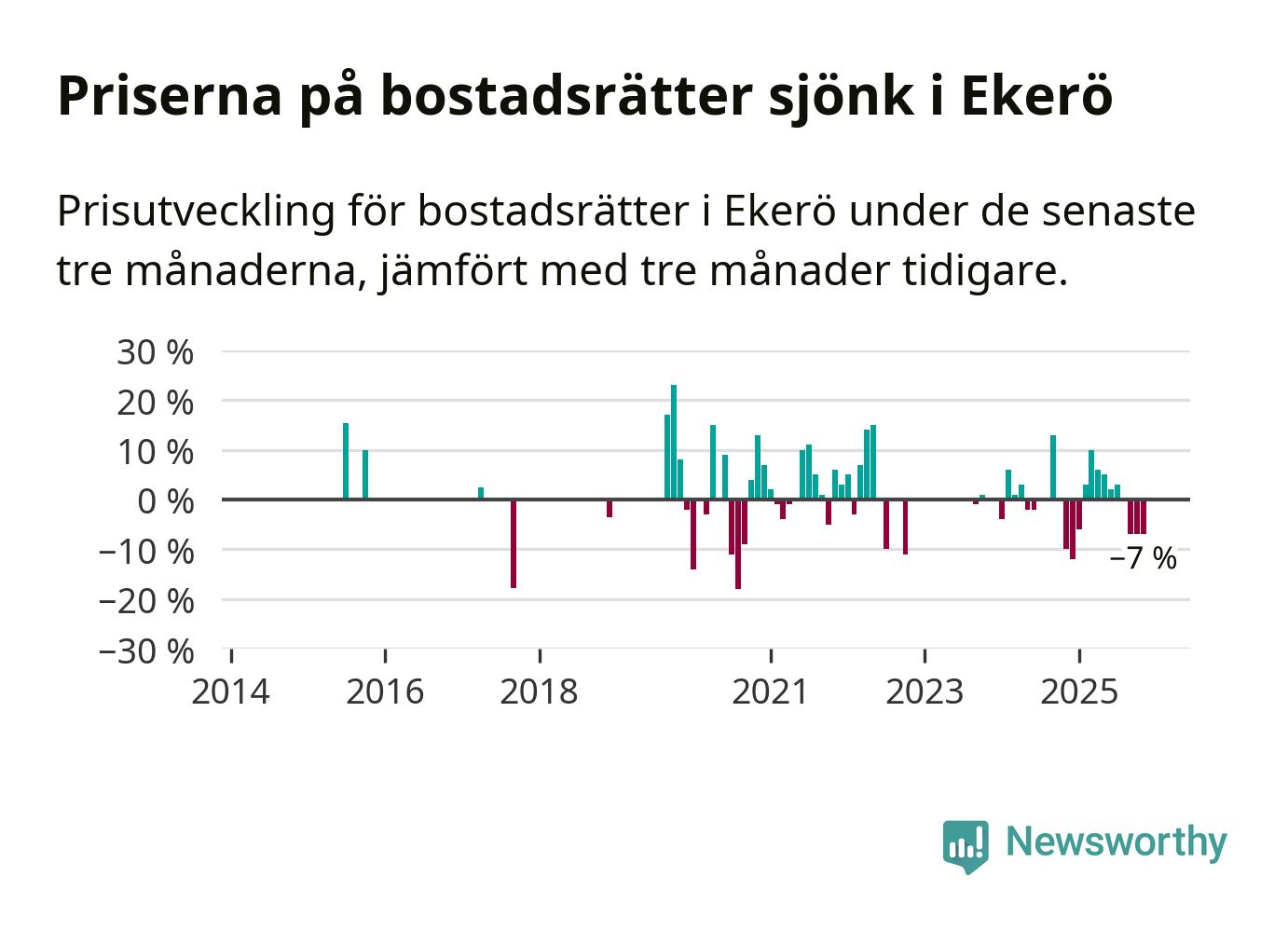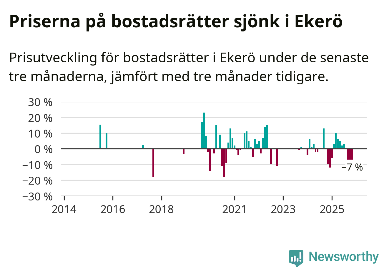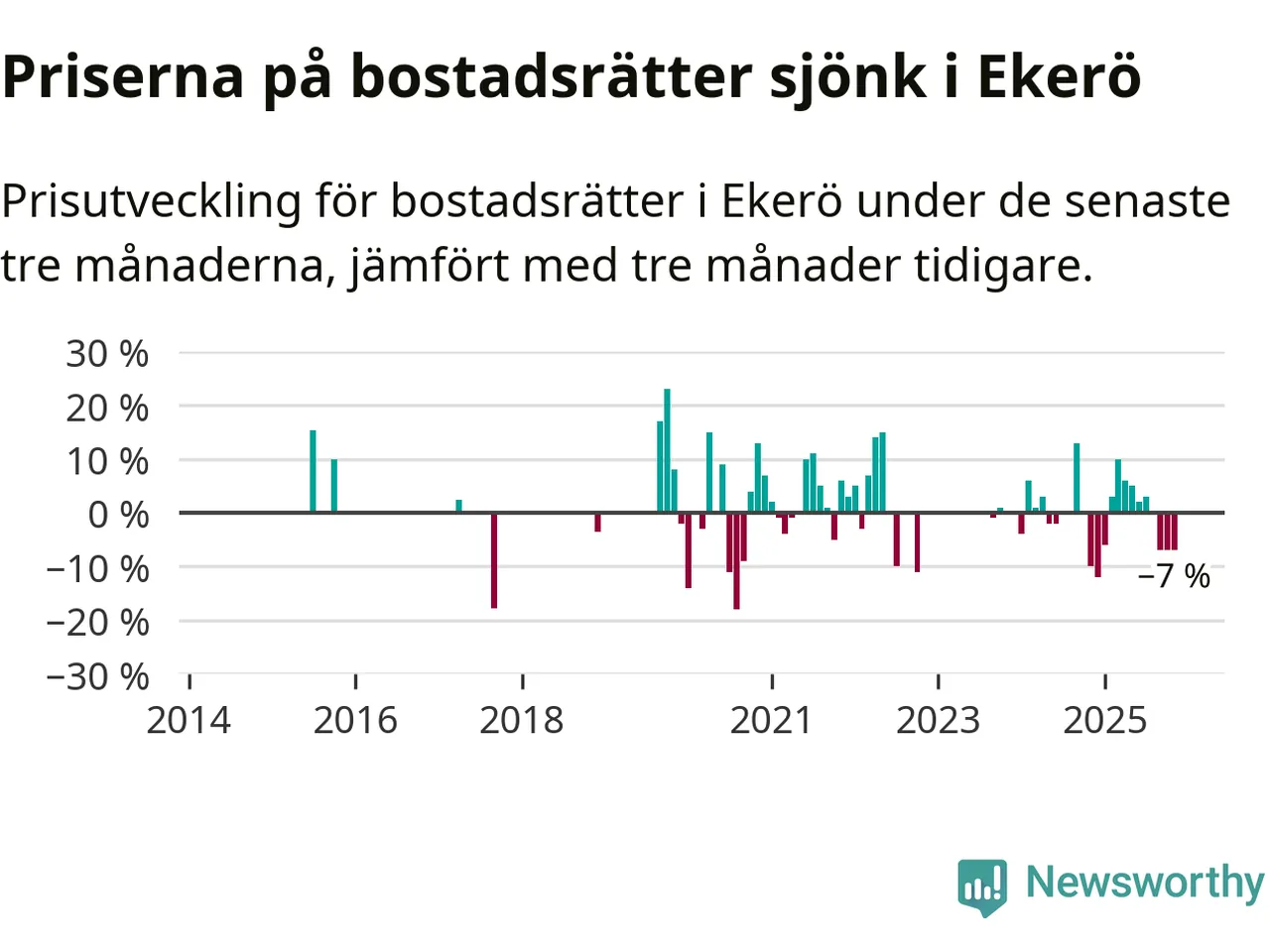 Statistiken visar även på en kännbar prisnedgång i Ekerö kommun. Medelpriset på försäljningarna av bostadsrätter i kommunen var 7 procent lägre än för tre månader sedan. I hela Stockholms län däremot ökar priserna på bostadsrätter. I hela länet noterades en prisuppgång på 6 procent.