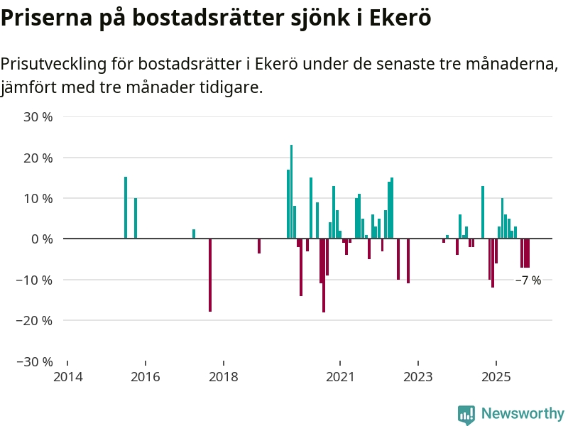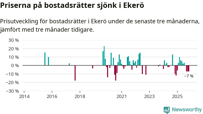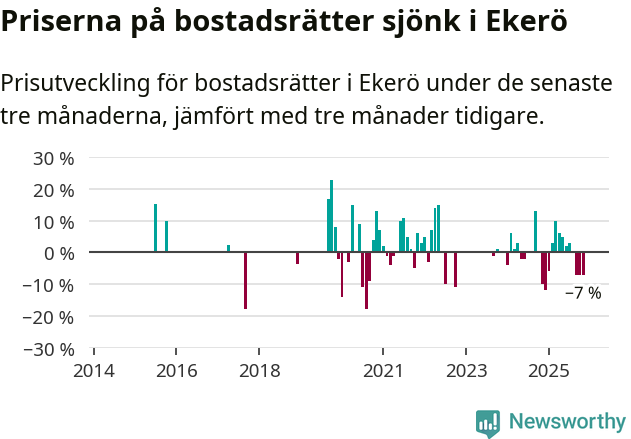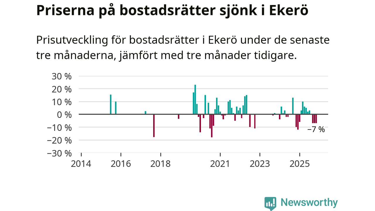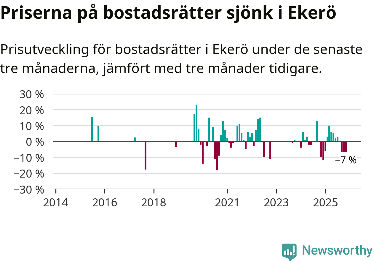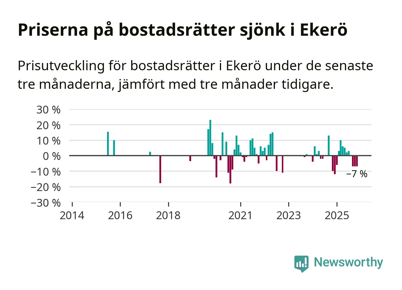 Statistiken visar även på en kännbar prisnedgång i Ekerö kommun. Medelpriset på försäljningarna av bostadsrätter i kommunen var 7 procent lägre än för tre månader sedan. I hela Stockholms län däremot ökar priserna på bostadsrätter. I hela länet noterades en prisuppgång på 6 procent.