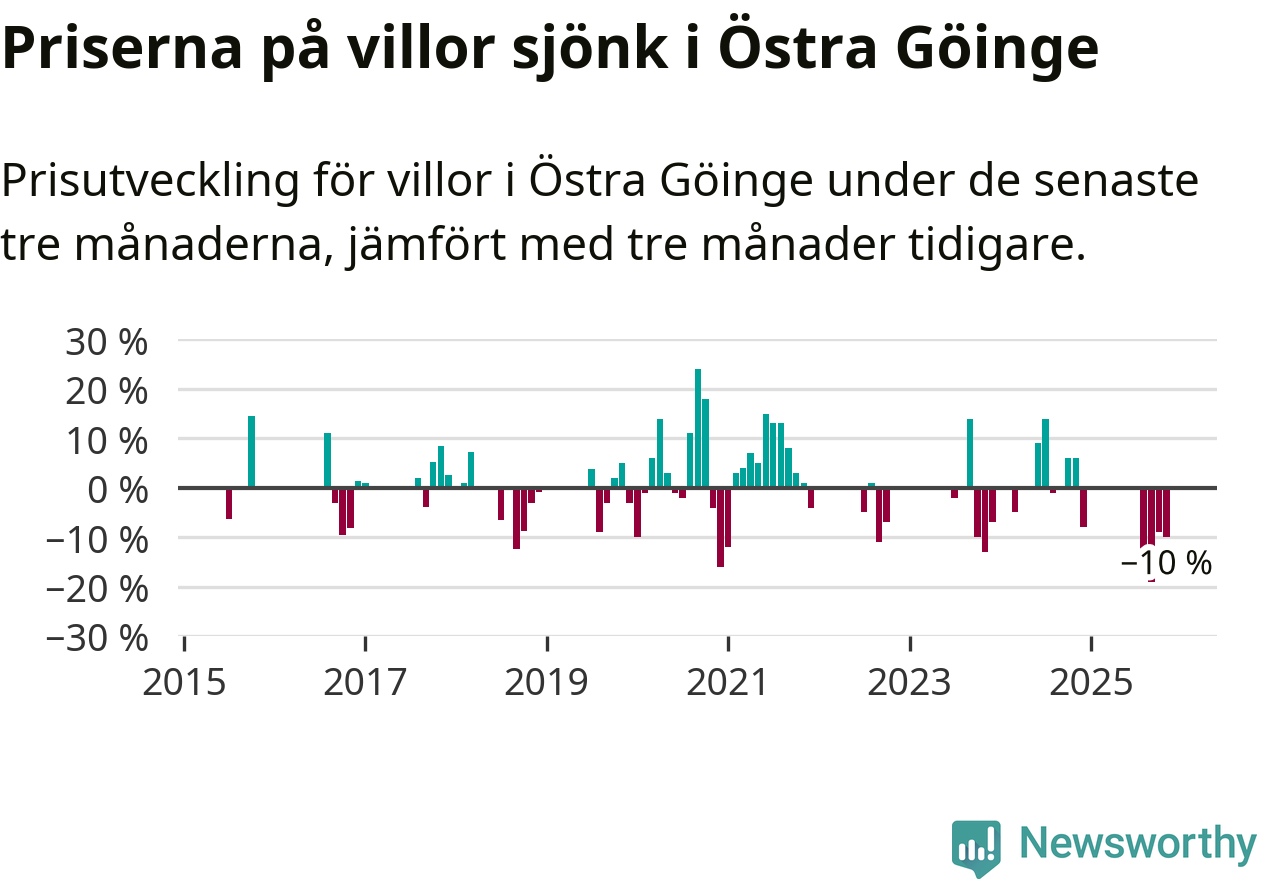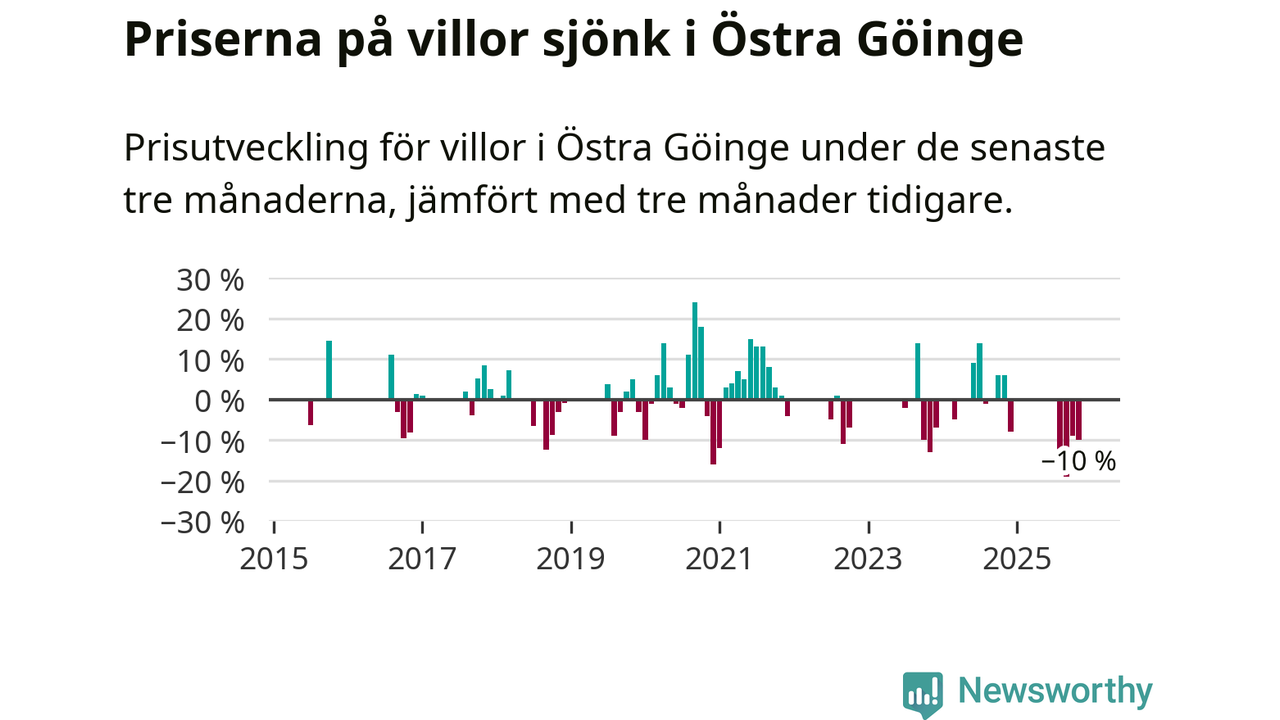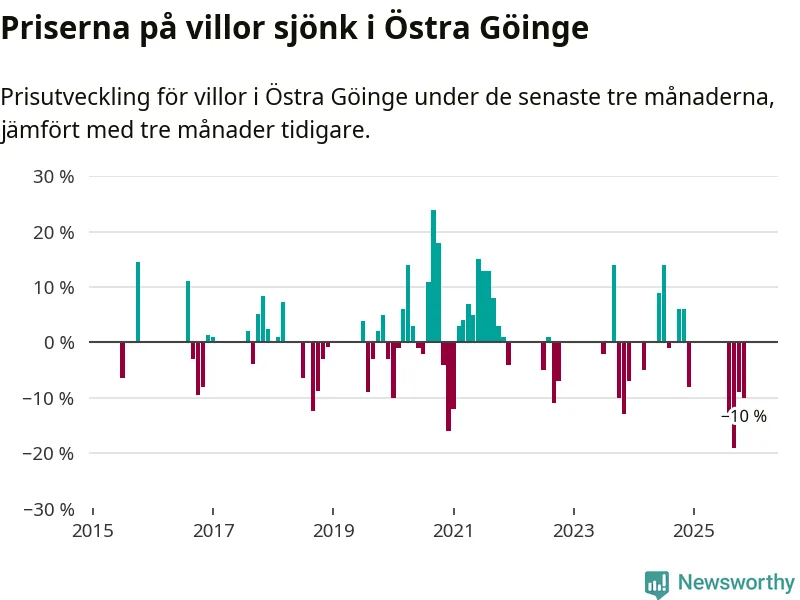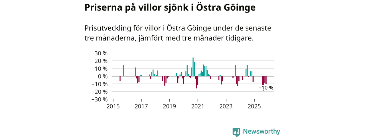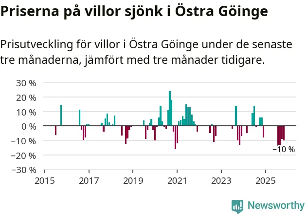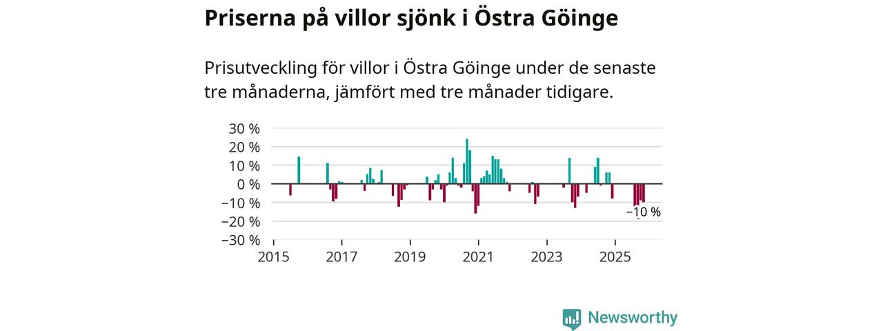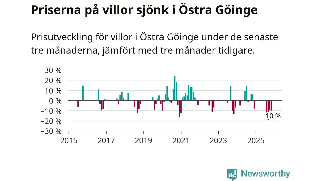 Statistiken visar även på en stor prisnedgång i Östra Göinge kommun. Medelpriset på försäljningarna av villor i kommunen var 10 procent lägre än för tre månader sedan. Även i hela Skåne sjunker villapriserna. I hela länet noterades en prisnedgång på 2 procent.