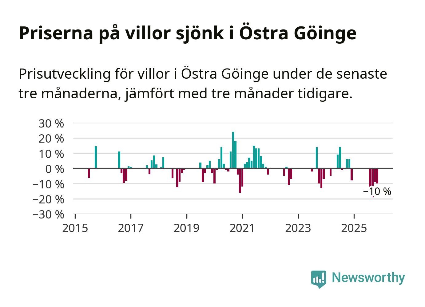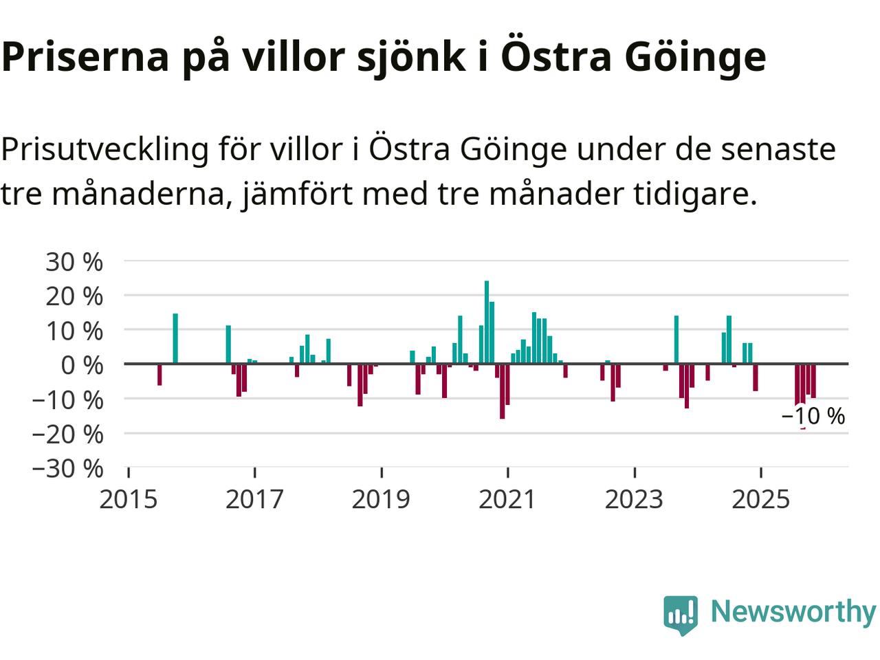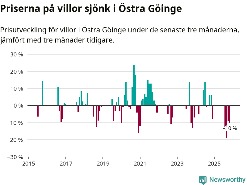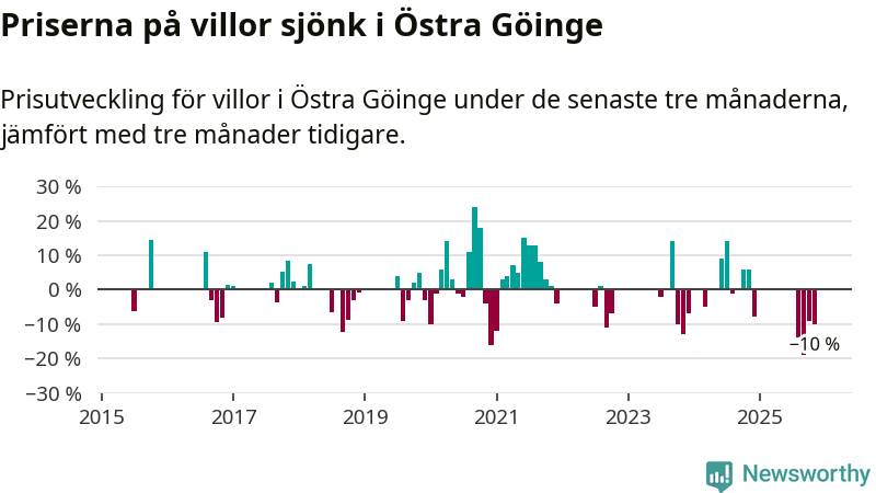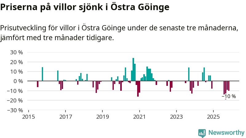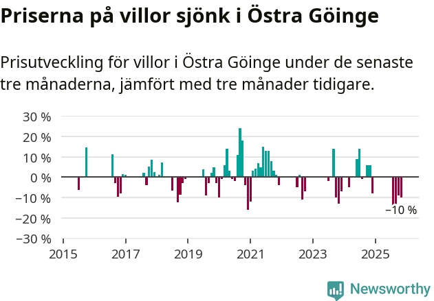 Statistiken visar även på en stor prisnedgång i Östra Göinge kommun. Medelpriset på försäljningarna av villor i kommunen var 10 procent lägre än för tre månader sedan. Även i hela Skåne sjunker villapriserna. I hela länet noterades en prisnedgång på 2 procent.