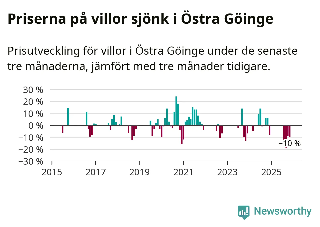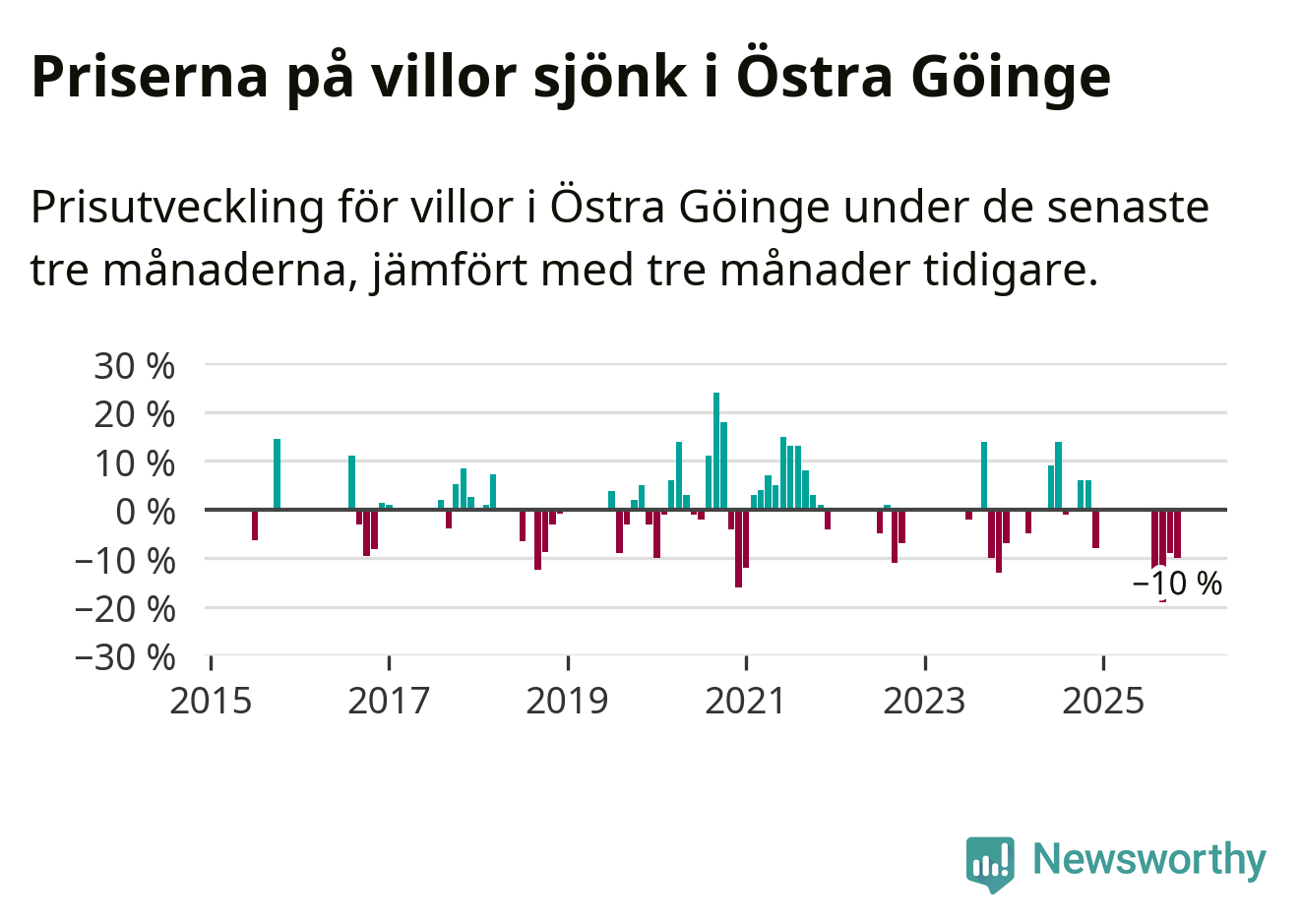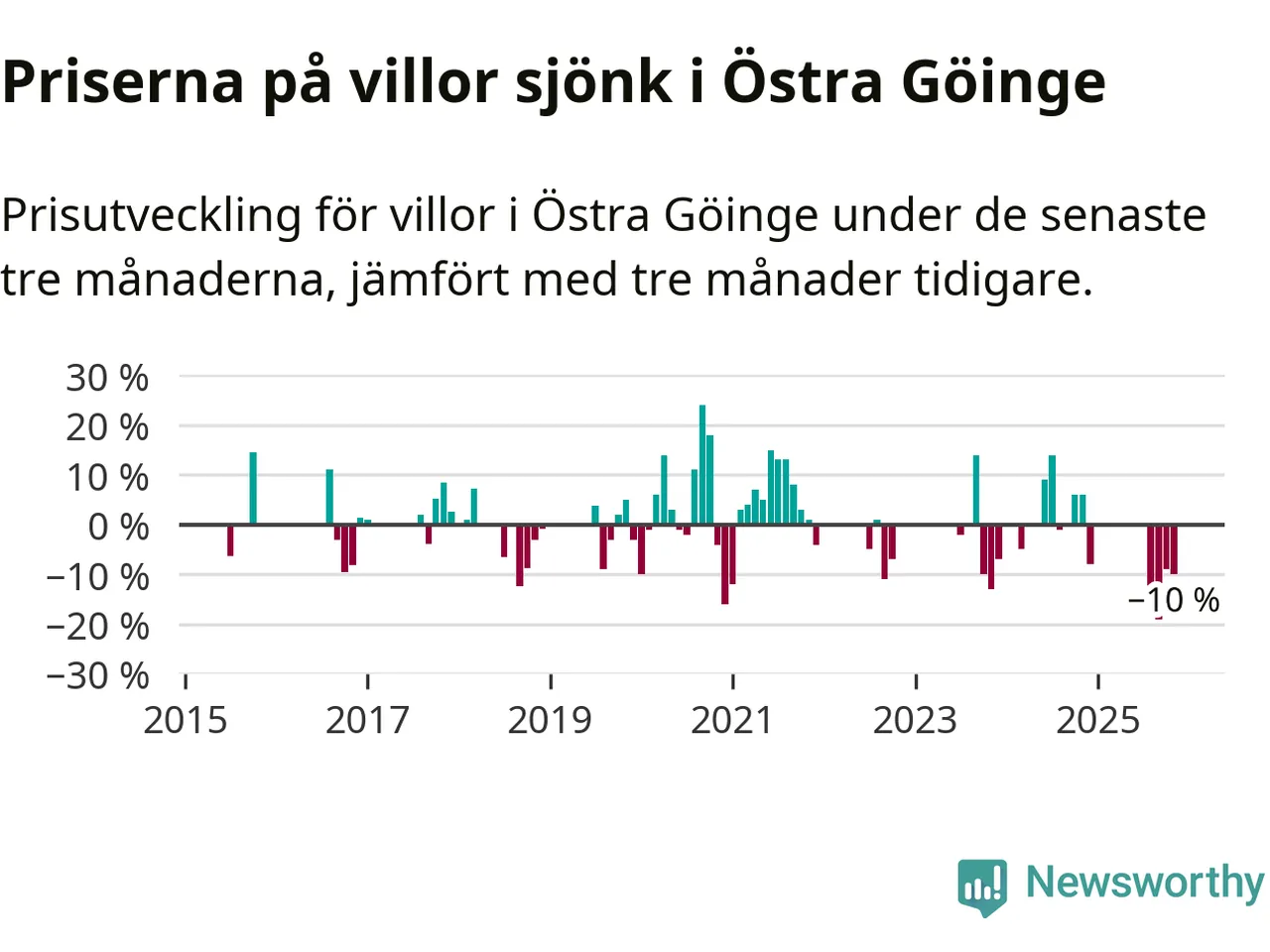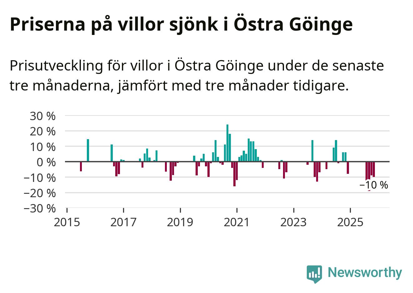 Statistiken visar även på en stor prisnedgång i Östra Göinge kommun. Medelpriset på försäljningarna av villor i kommunen var 10 procent lägre än för tre månader sedan. Även i hela Skåne sjunker villapriserna. I hela länet noterades en prisnedgång på 2 procent.