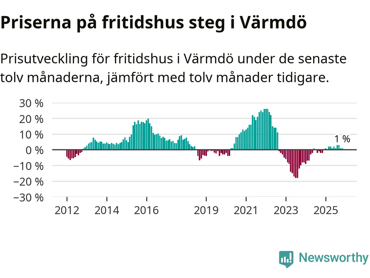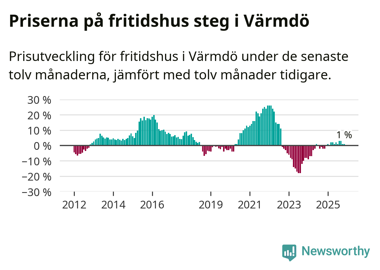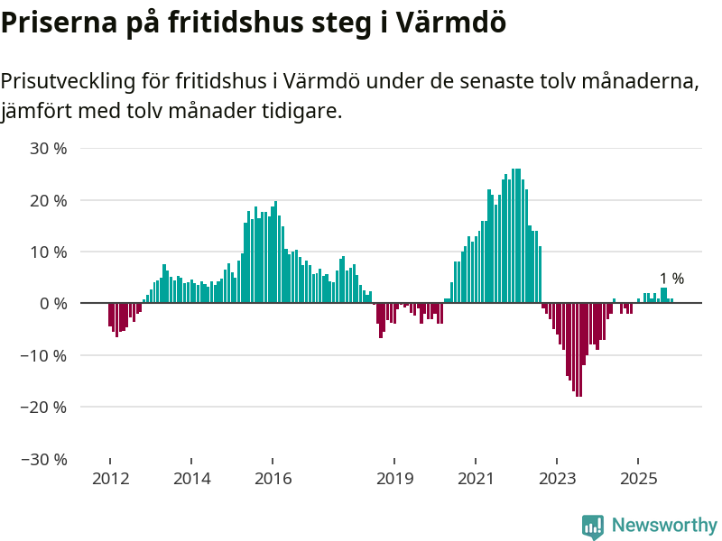 Notera att vi för fritidshus redovisar prisutveckling över 12 månader. Om det gjorts färre än 20 affärer under de senaste tolv månaderna redovisar Svensk Mäklarstatistik inga uppgifter om prisutveckling.