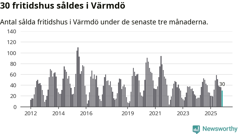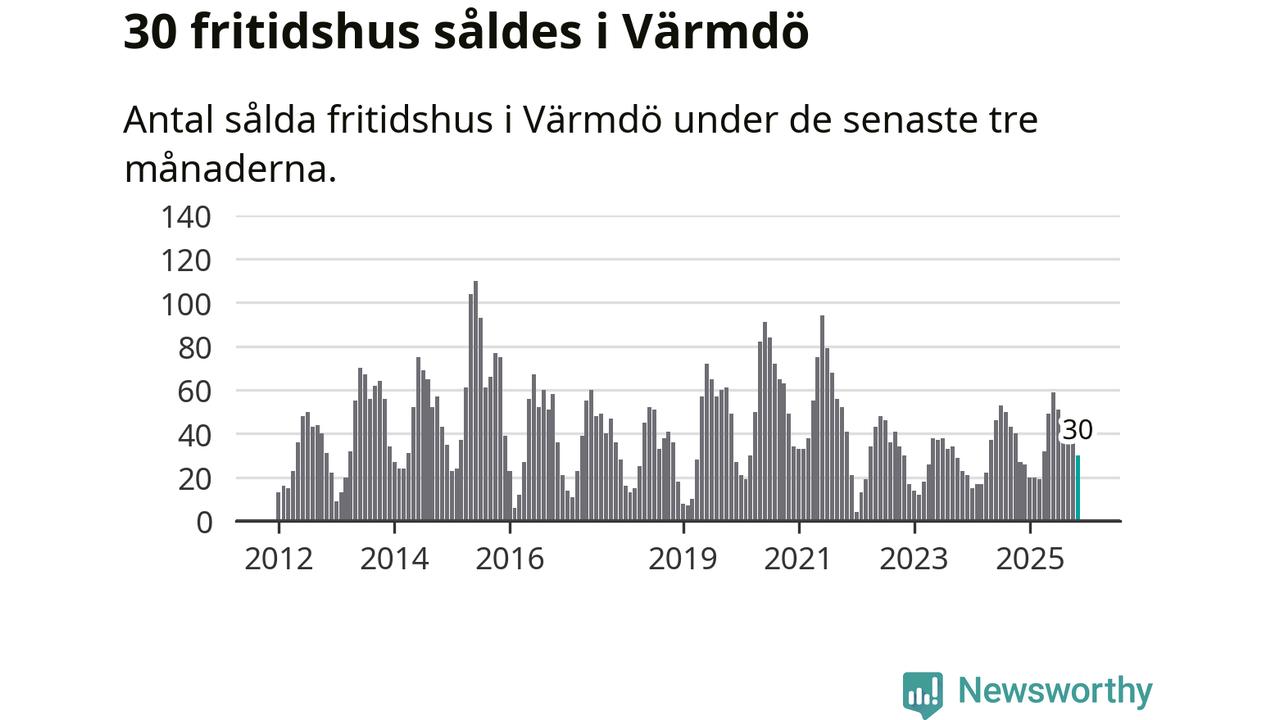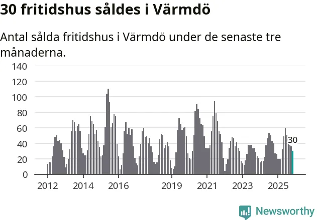 Sammanlagt såldes 30 fritidshus i Värmdö kommun mellan september och november till ett genomsnittligt pris på 5,4 miljoner kronor. I fjol gjordes 27 affärer vid den här tiden på året.