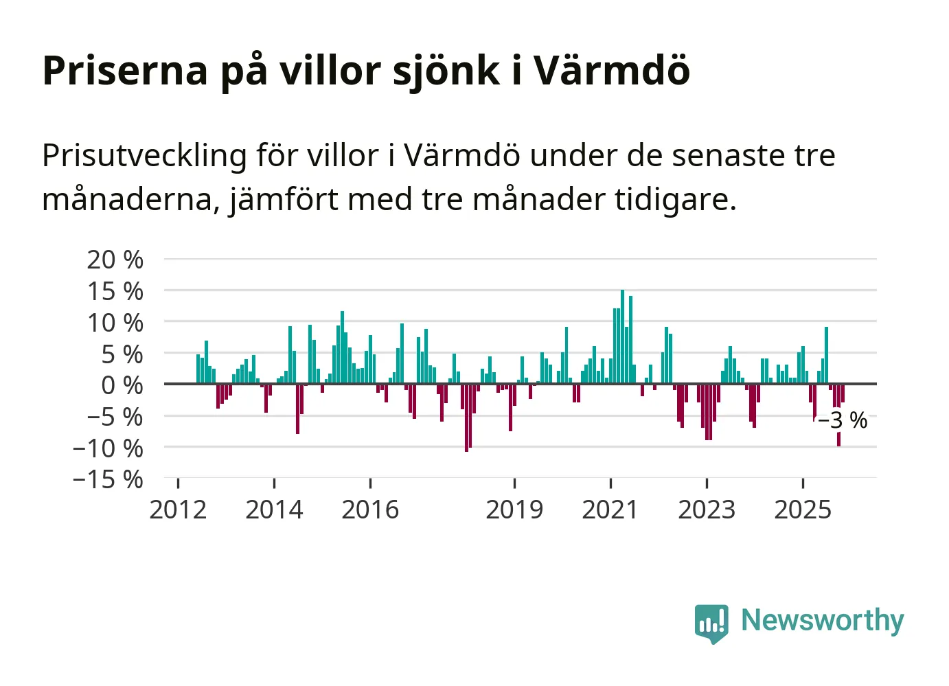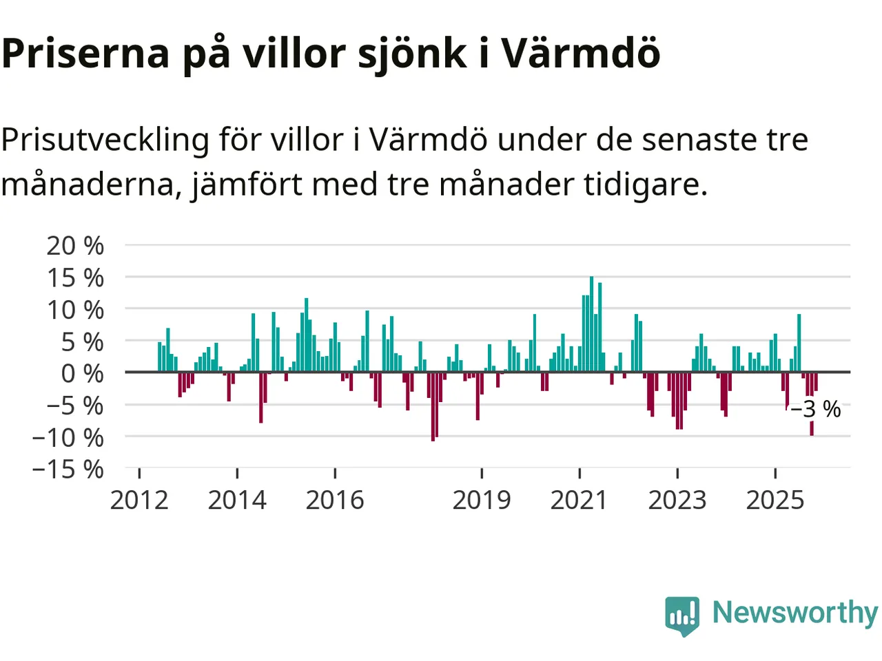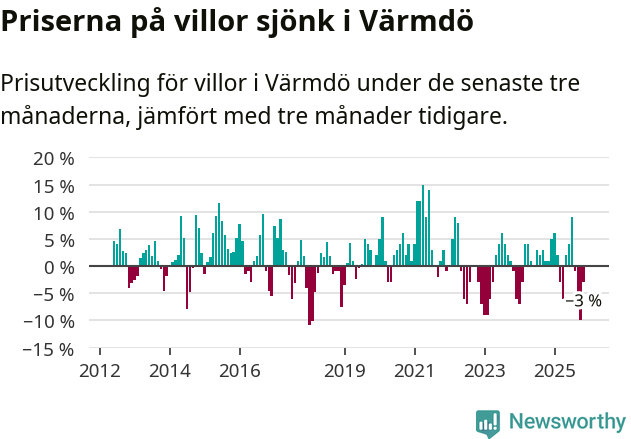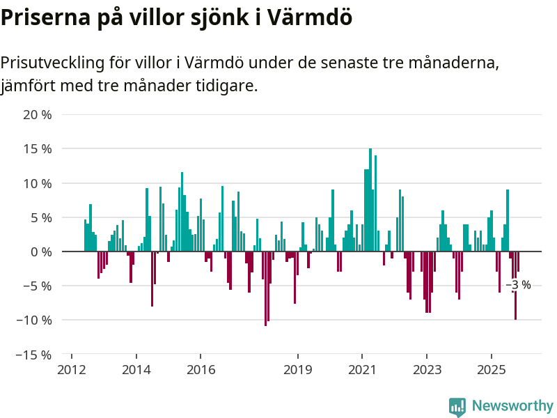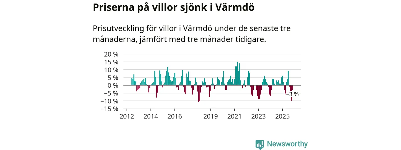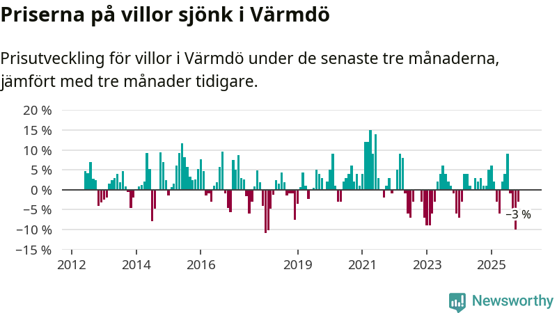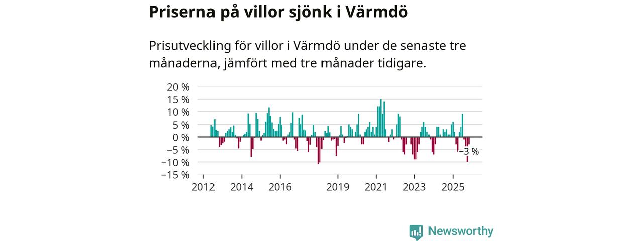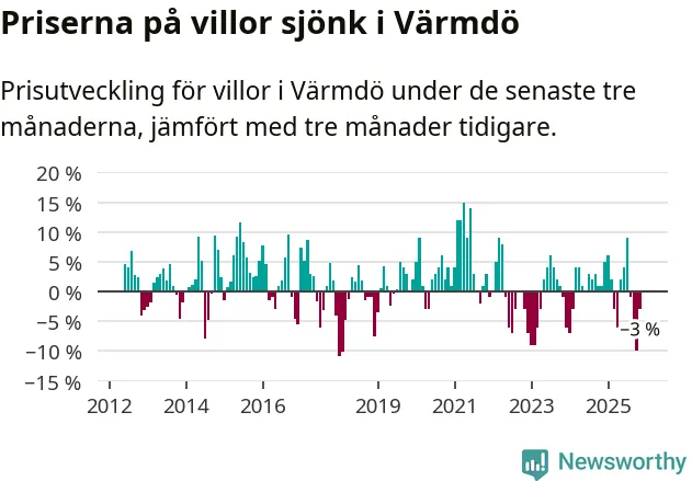 Villapriserna har gått ner i Värmdö kommun. Medelpriset på försäljningarna under de senaste tre månaderna visar på en nedgång med 3 procent.