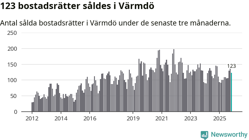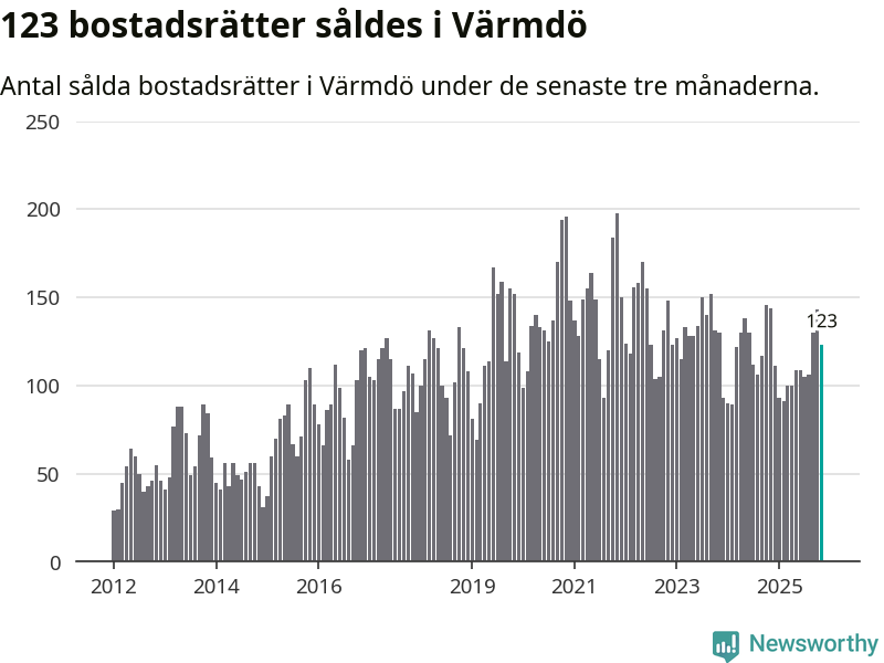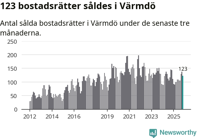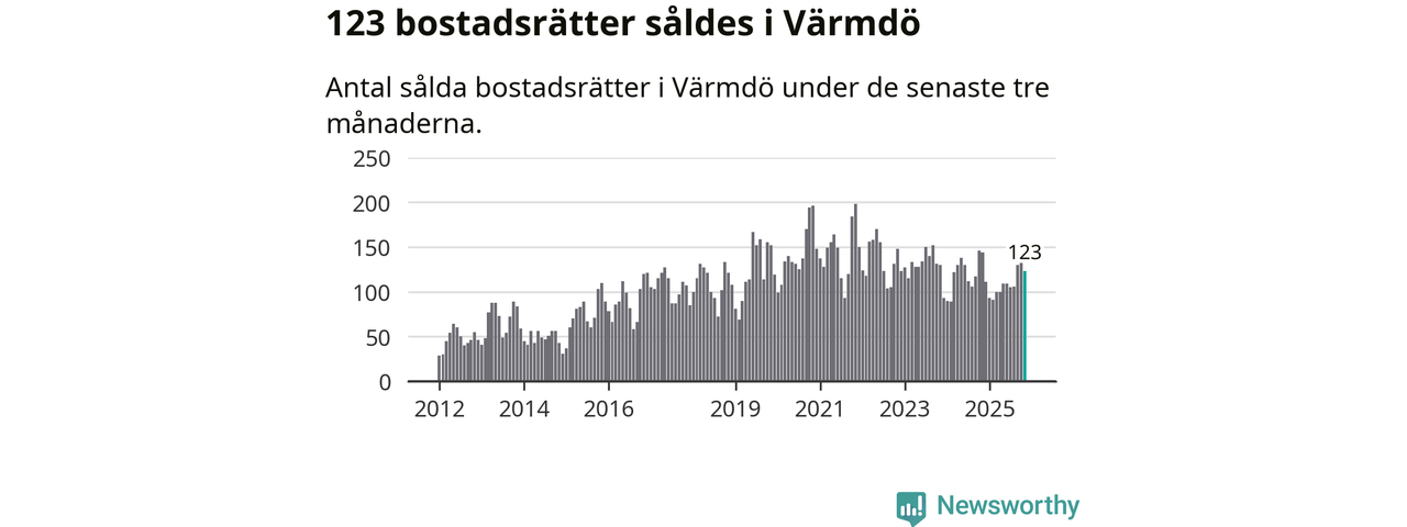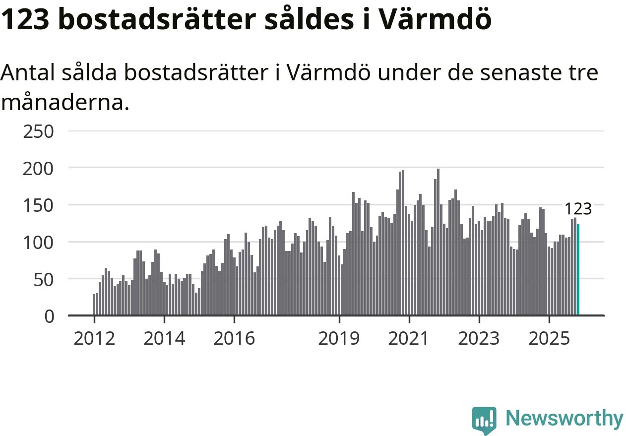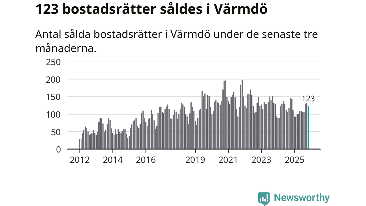 Sammanlagt såldes 123 bostadsrätter i Värmdö kommun mellan september och november till ett genomsnittligt pris på 3,2 miljoner kronor. I fjol gjordes 144 affärer vid den här tiden på året.