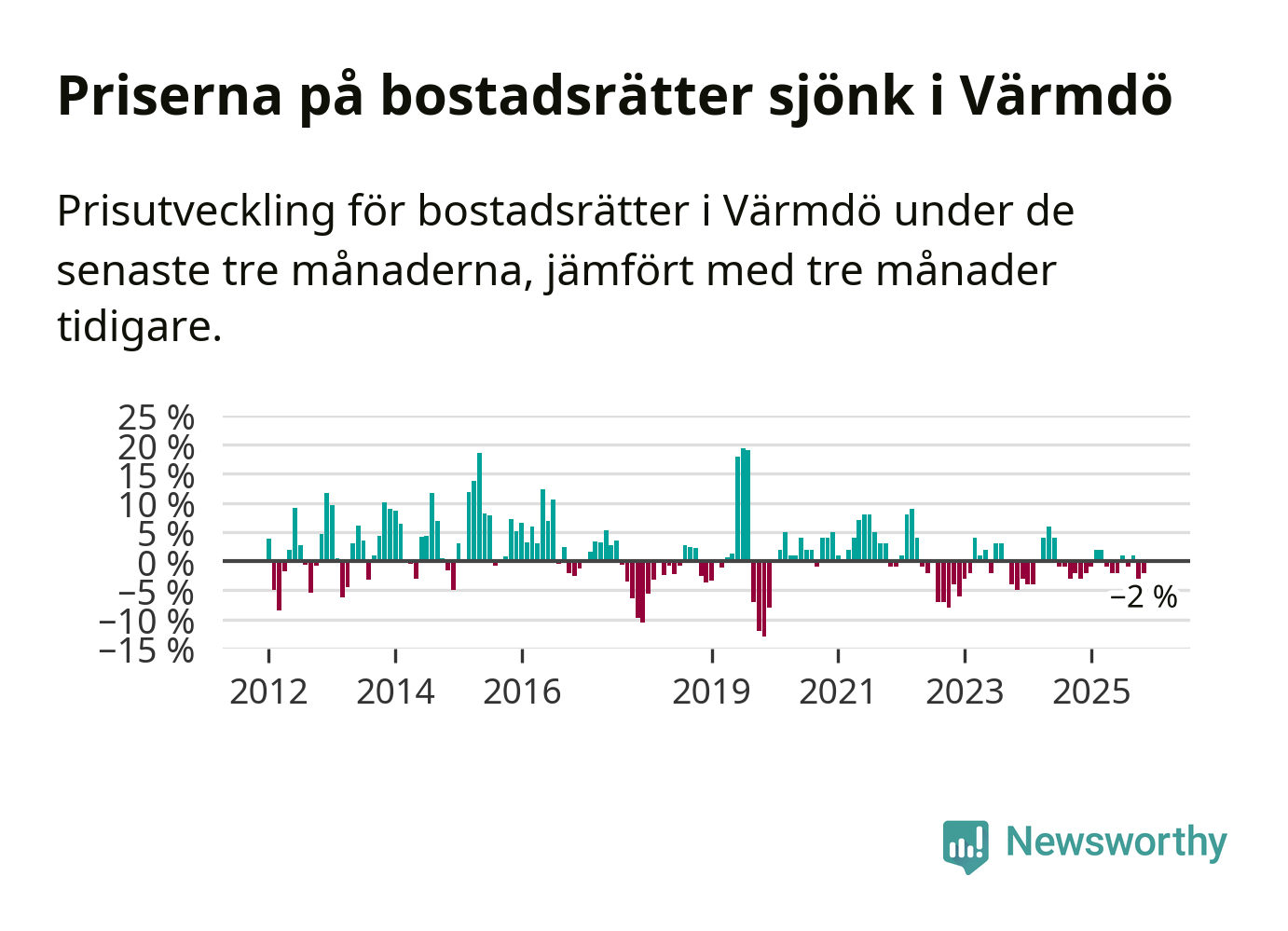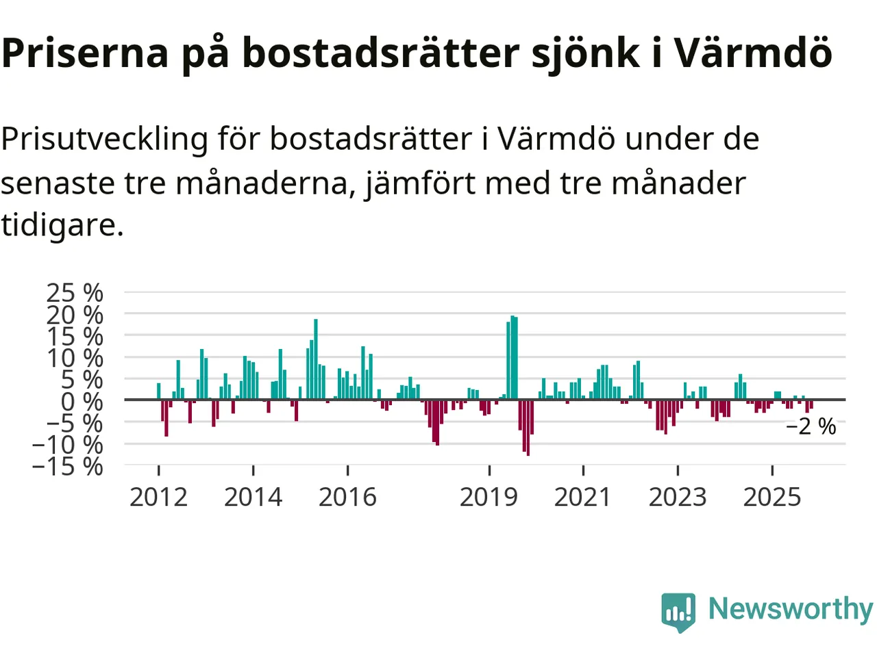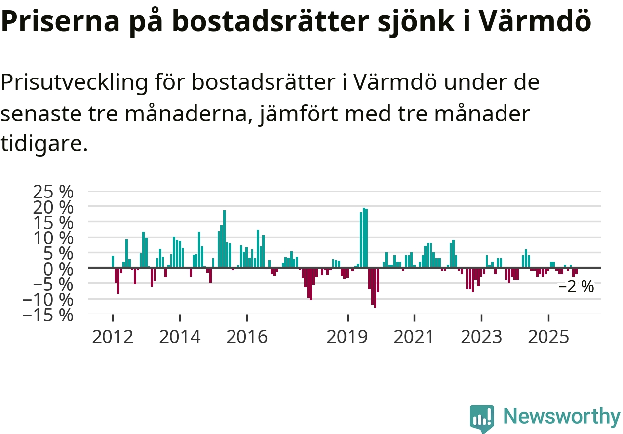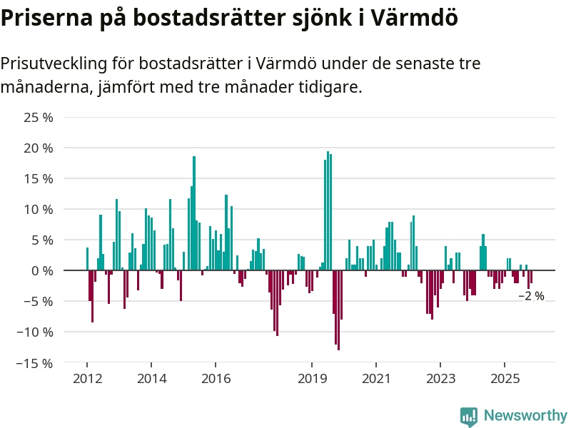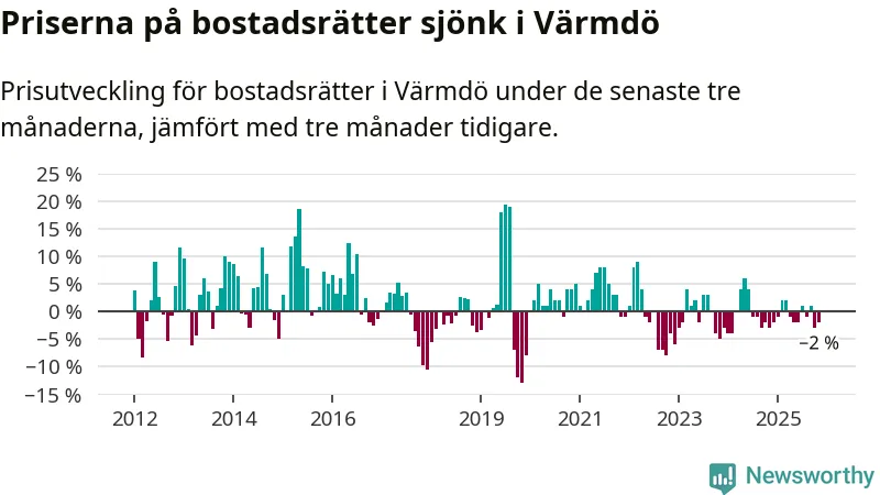 Priserna på bostadsrätter har gått ner i Värmdö kommun. Medelpriset på försäljningarna under de senaste tre månaderna visar på en nedgång med 2 procent.