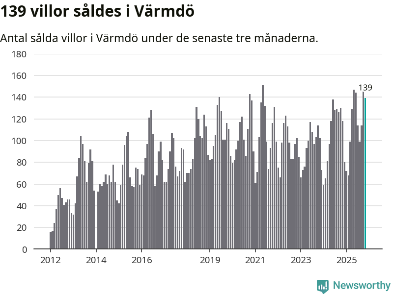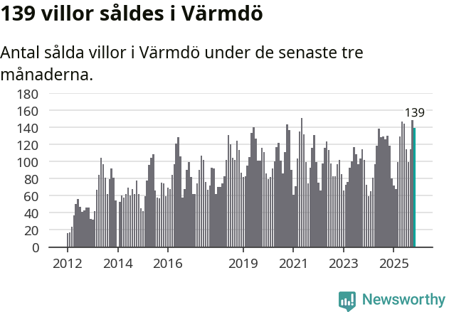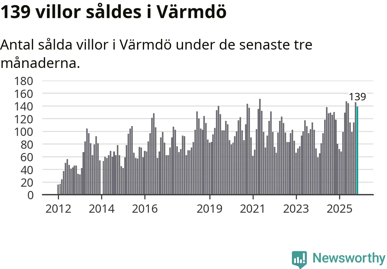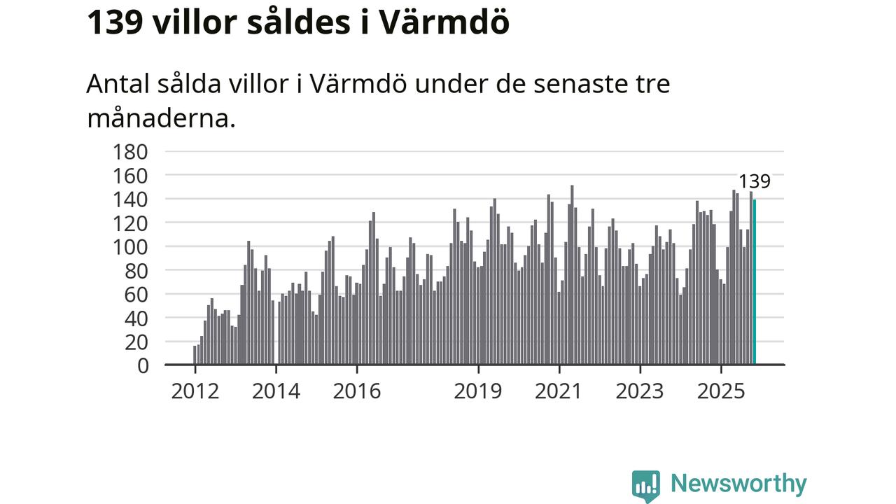 Sammanlagt såldes 139 villor i Värmdö kommun mellan september och november till ett genomsnittligt pris på 7,1 miljoner kronor. I fjol gjordes 118 affärer vid den här tiden på året.