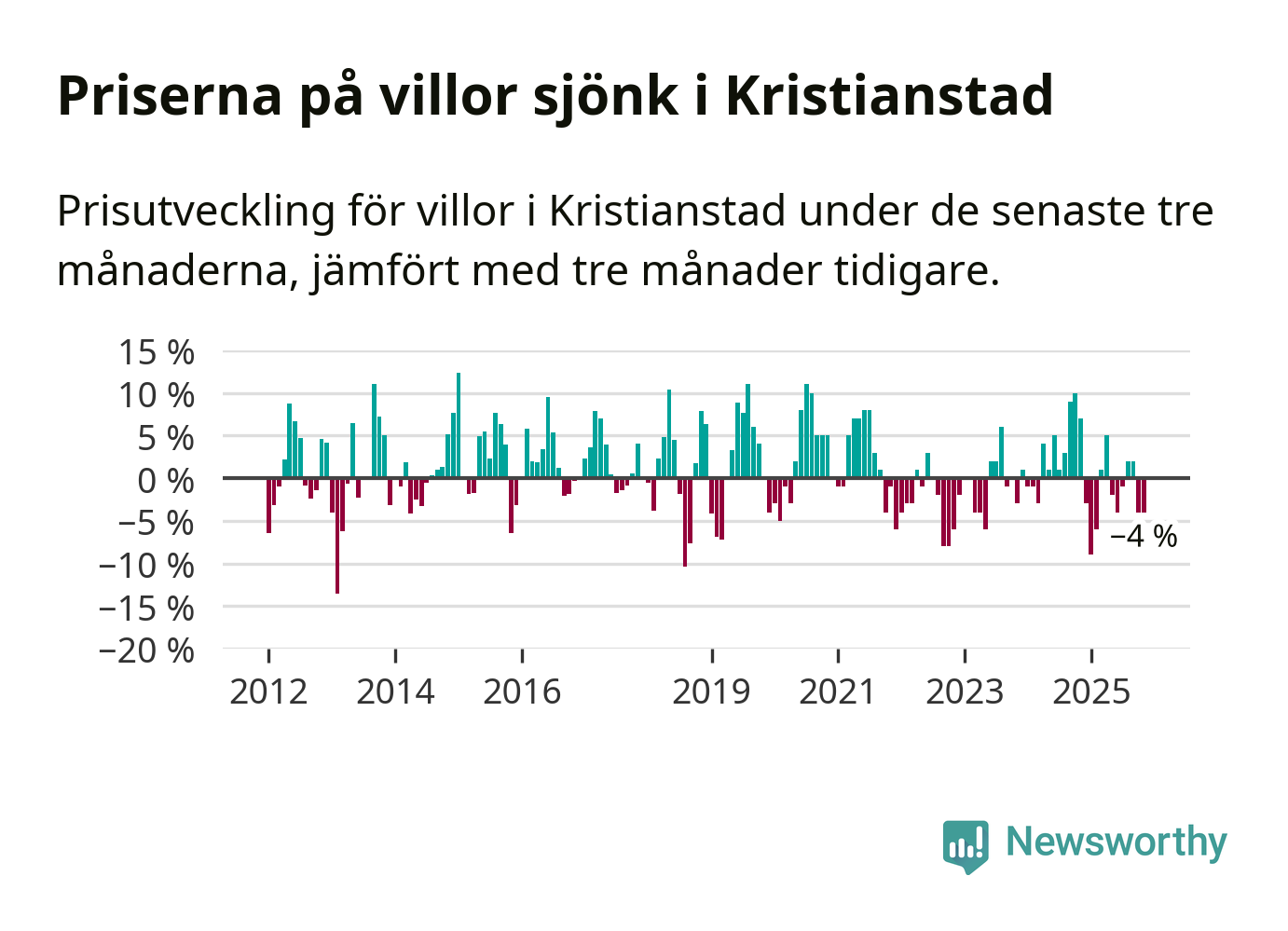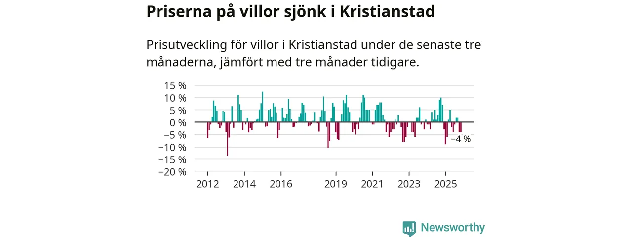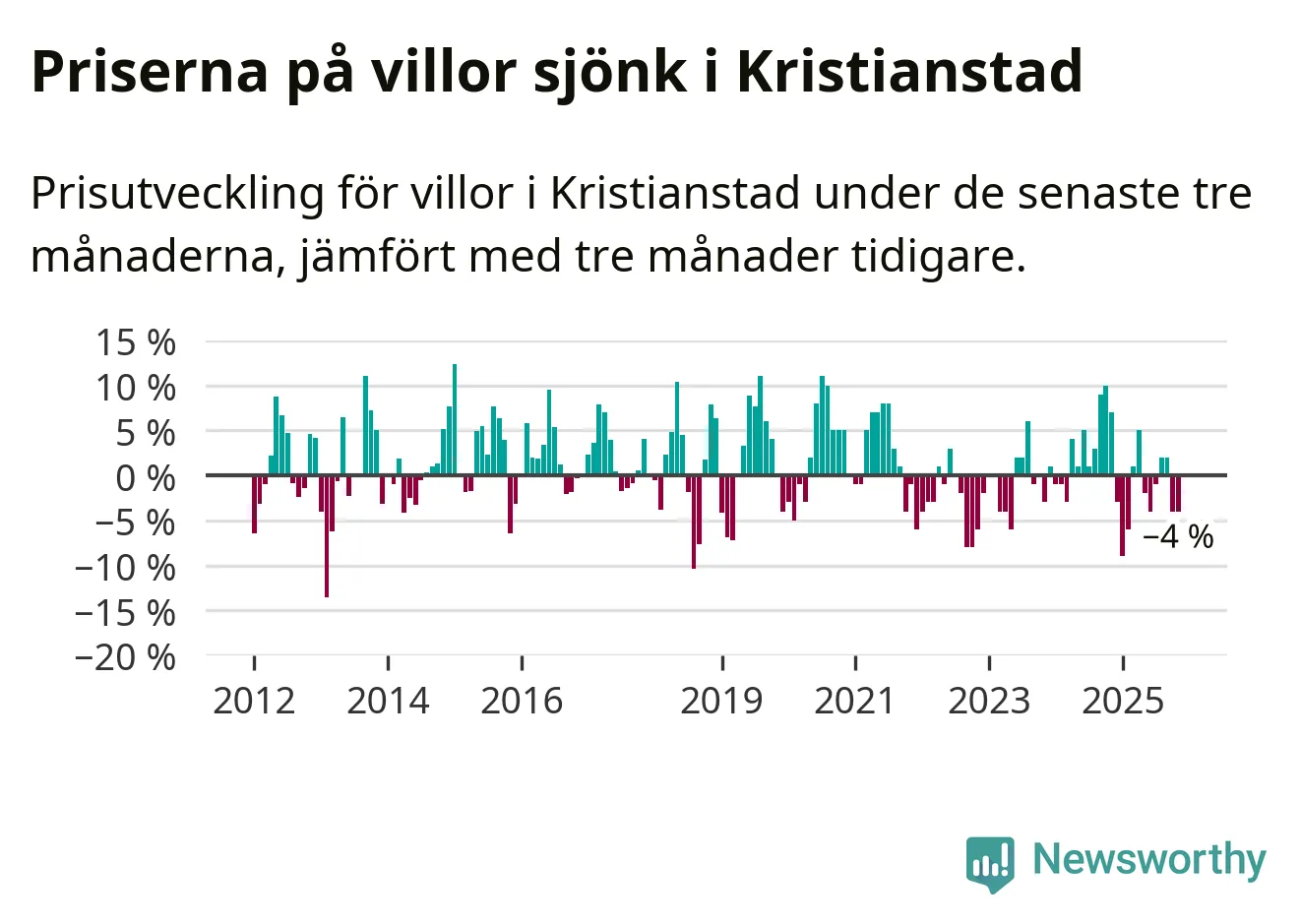 Villapriserna har gått ner i Kristianstads kommun. Medelpriset på försäljningarna under de senaste tre månaderna visar på en nedgång med 4 procent.