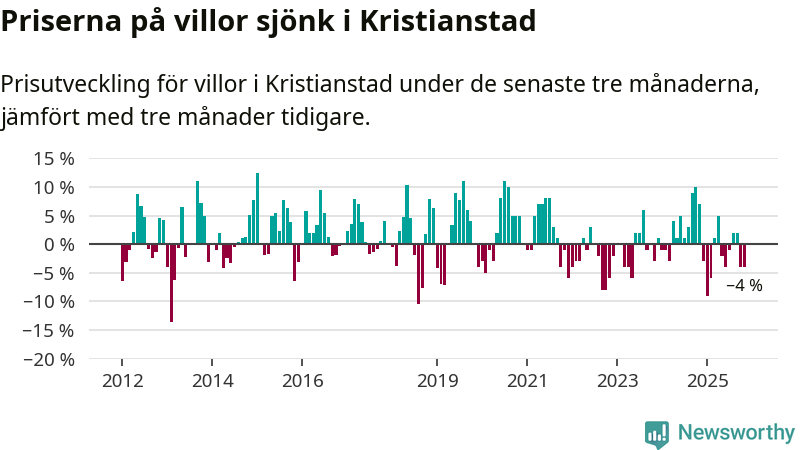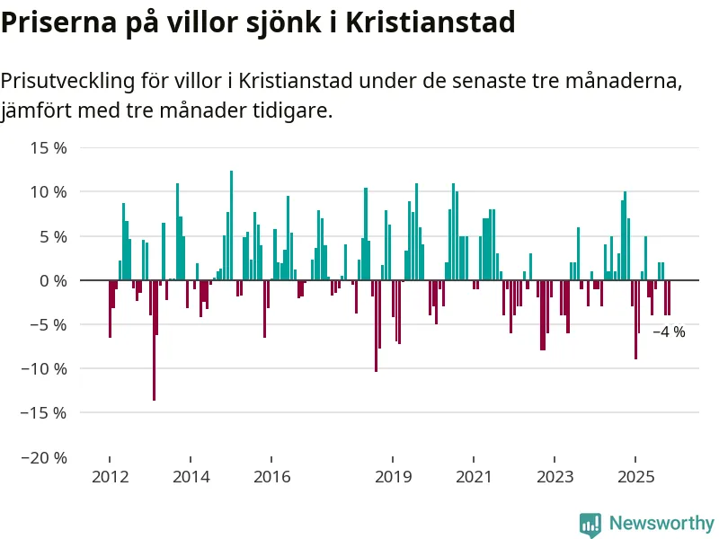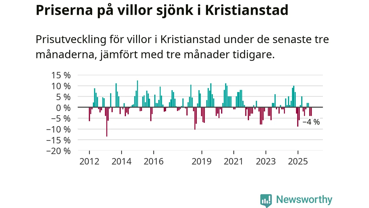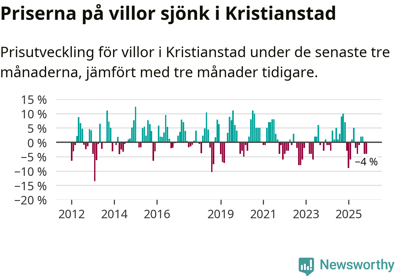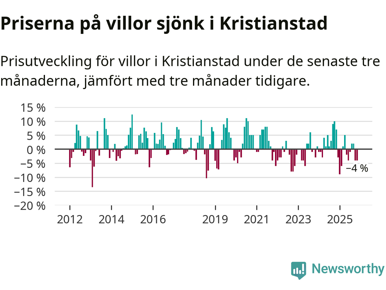 Villapriserna har gått ner i Kristianstads kommun. Medelpriset på försäljningarna under de senaste tre månaderna visar på en nedgång med 4 procent.
