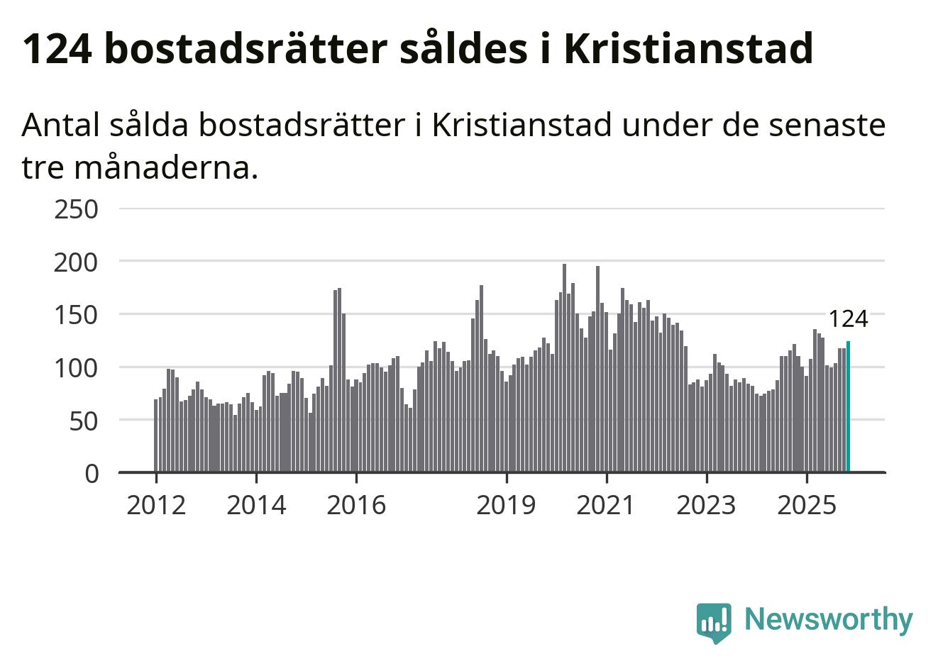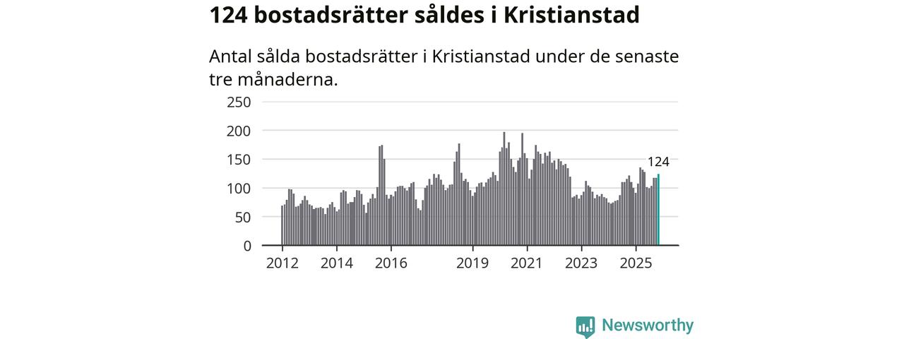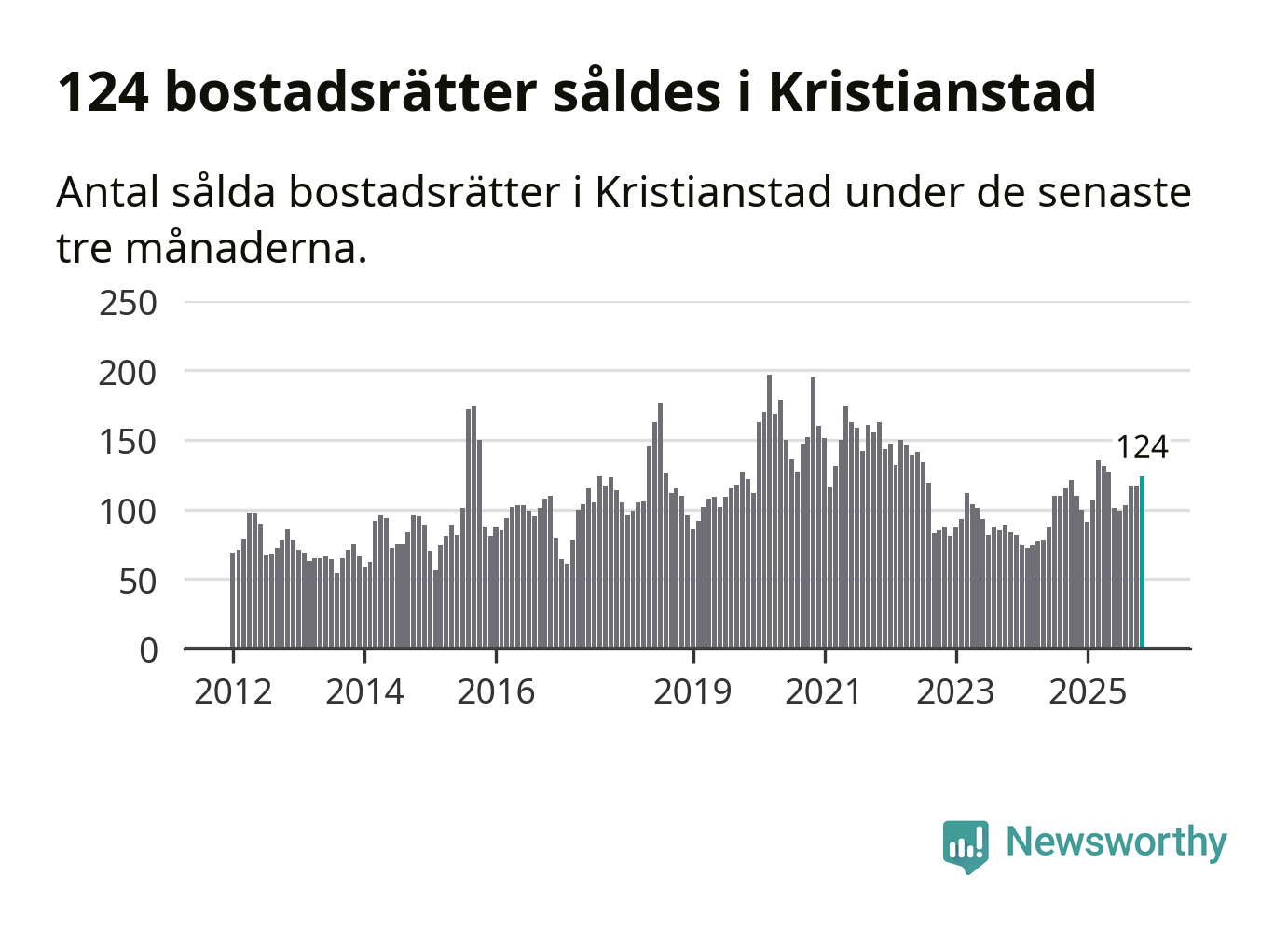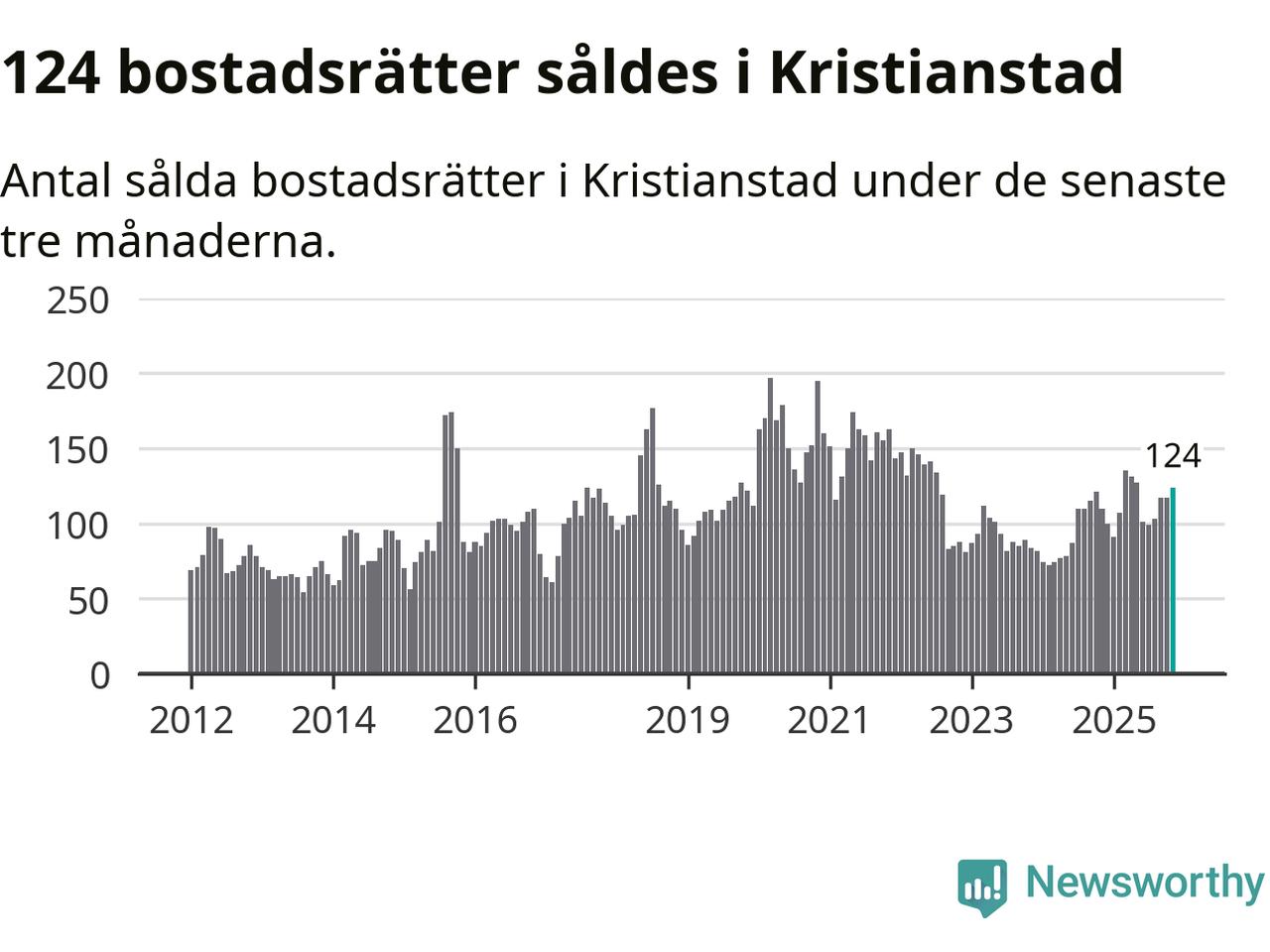 Sammanlagt såldes 124 bostadsrätter i Kristianstads kommun mellan september och november till ett genomsnittligt pris på 1,3 miljoner kronor. I fjol gjordes 110 affärer vid den här tiden på året.