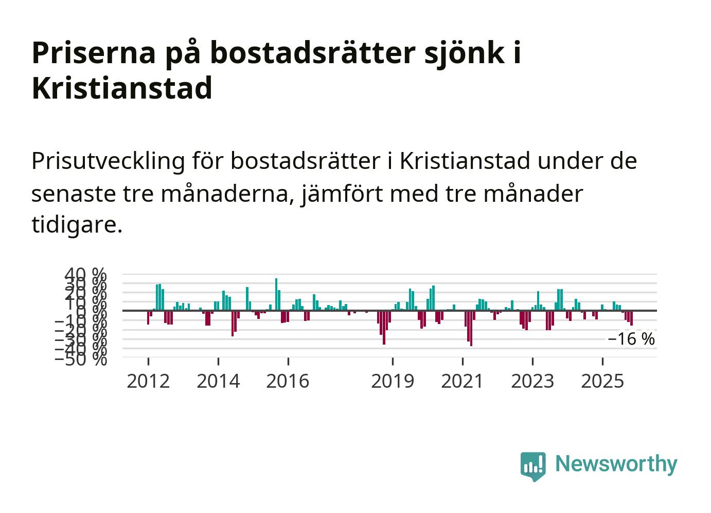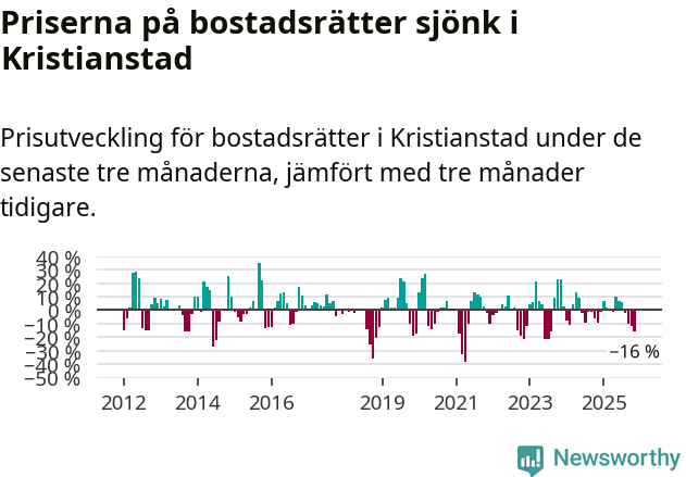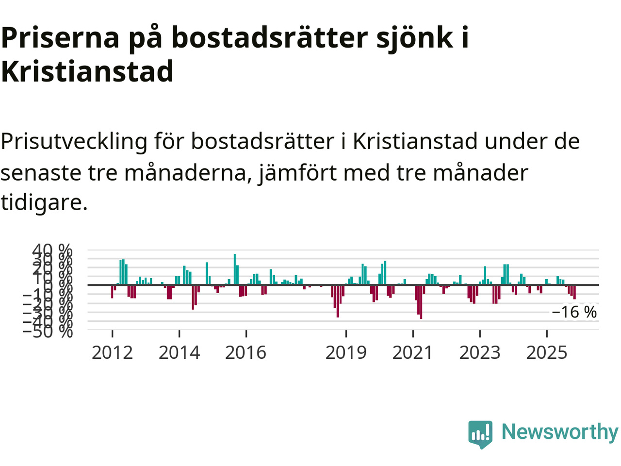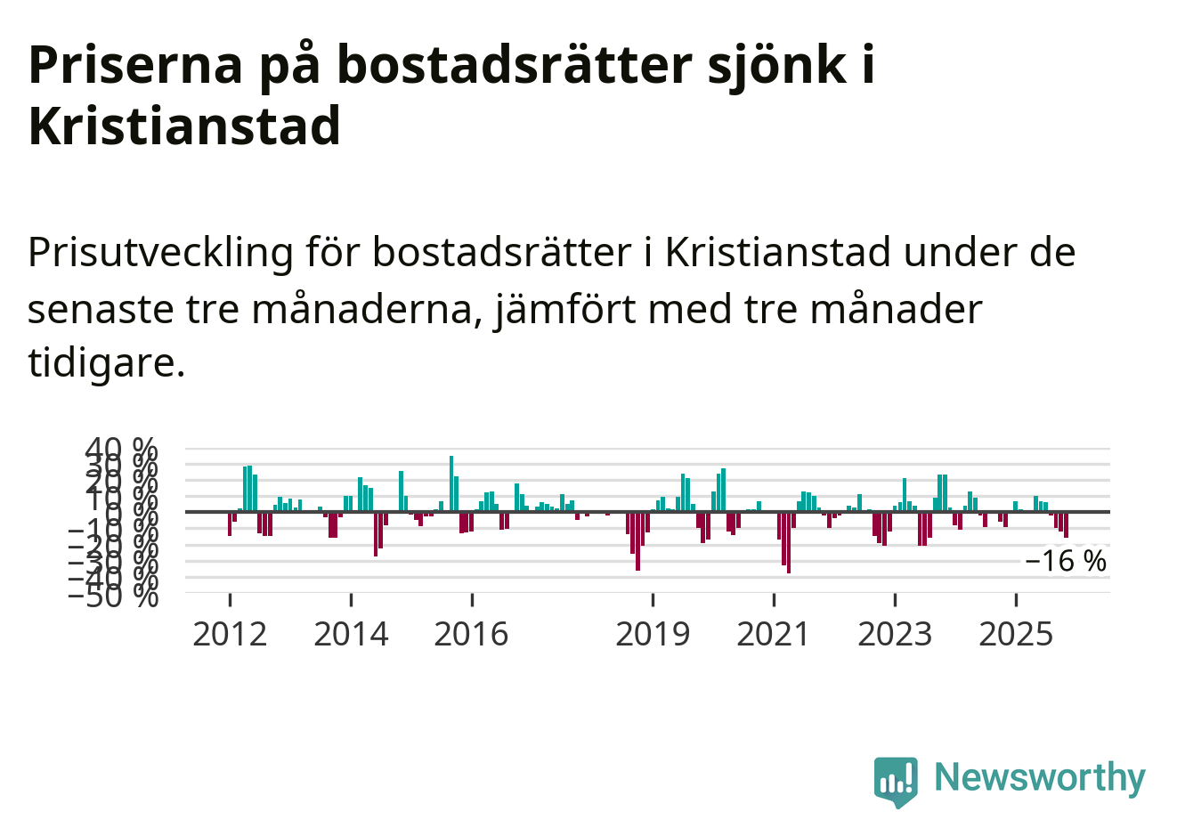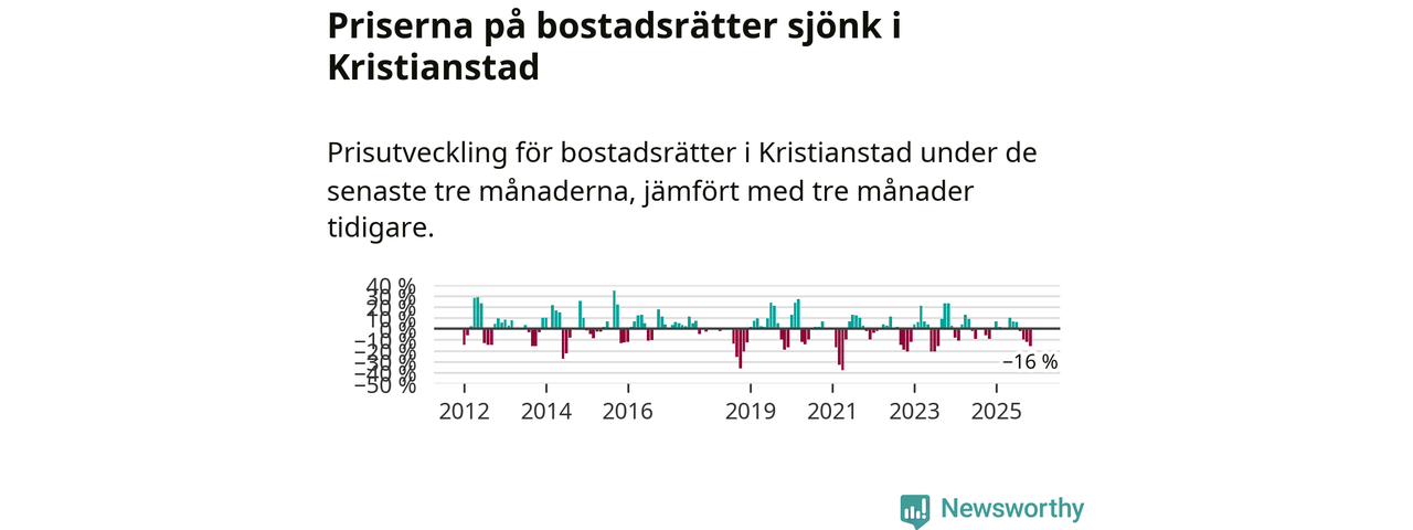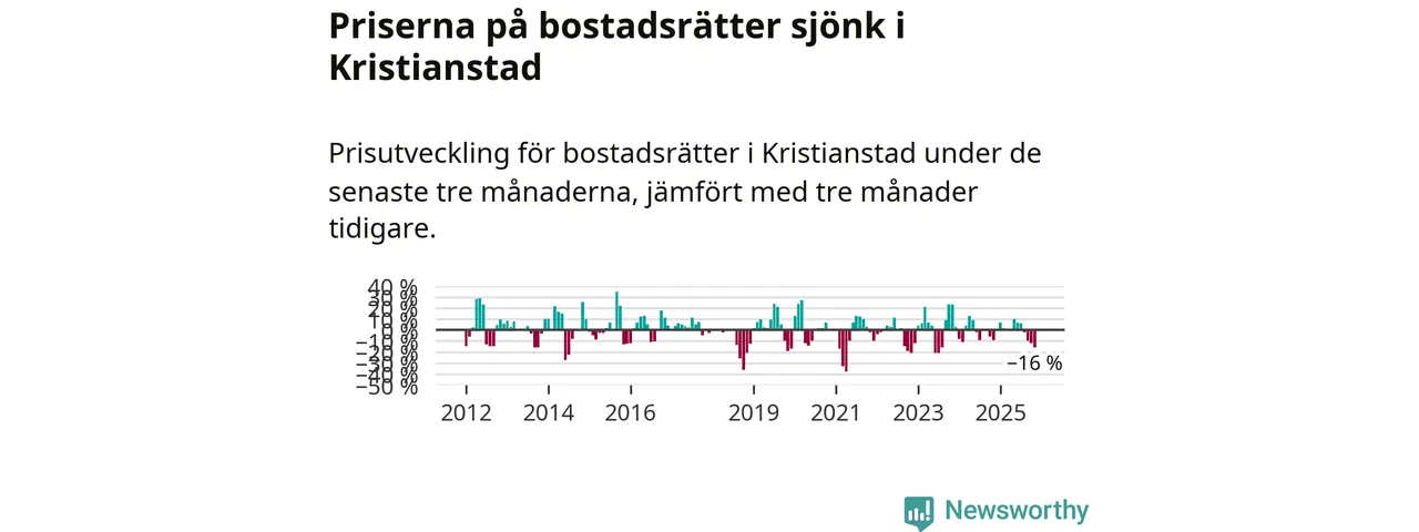 Priserna på bostadsrätter har gått ner i Kristianstads kommun. Medelpriset på försäljningarna under de senaste tre månaderna visar på en nedgång med 16 procent.